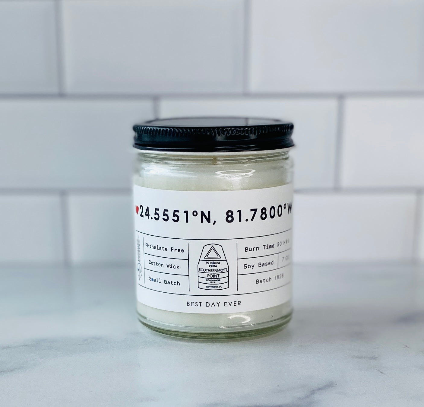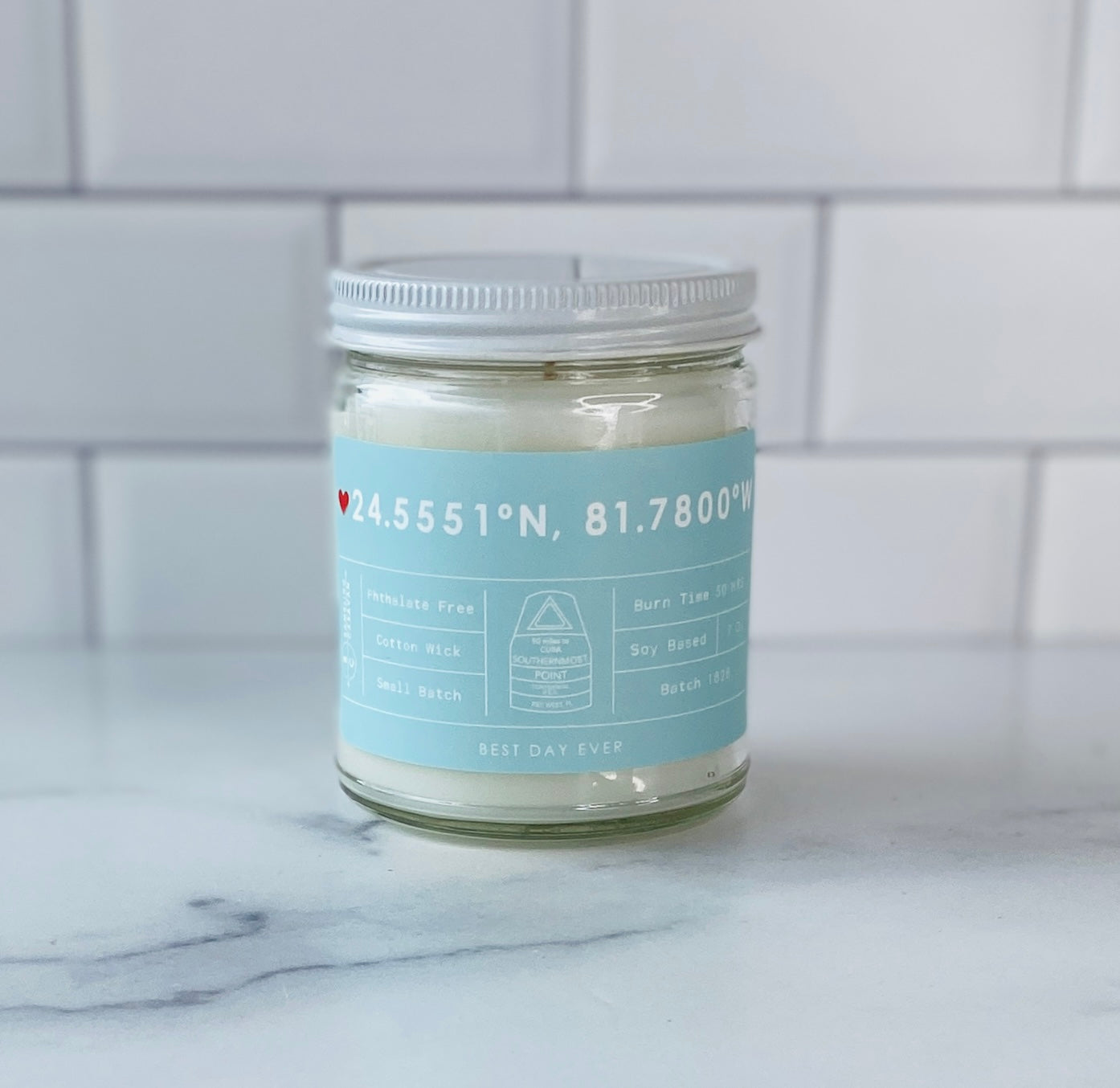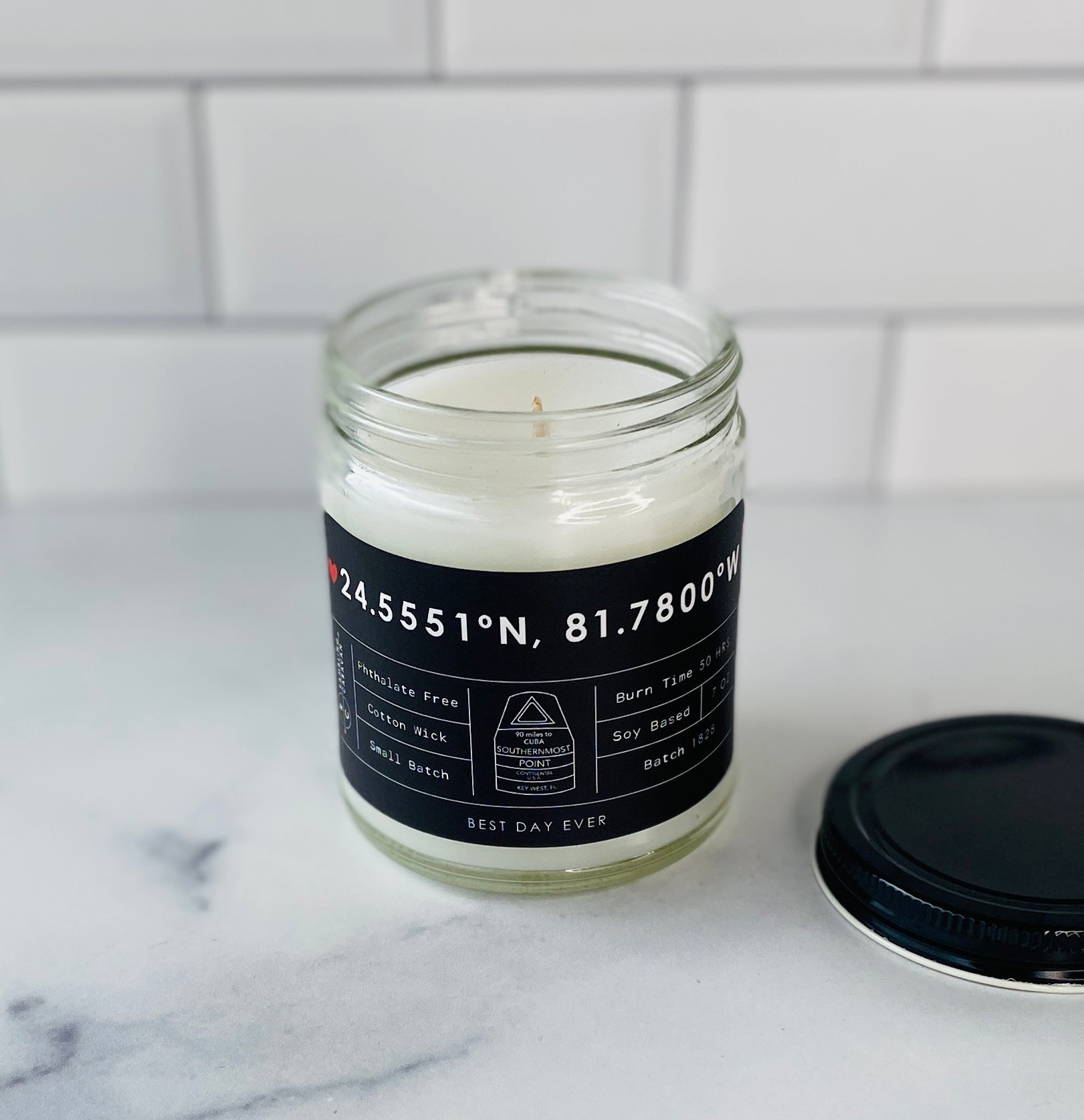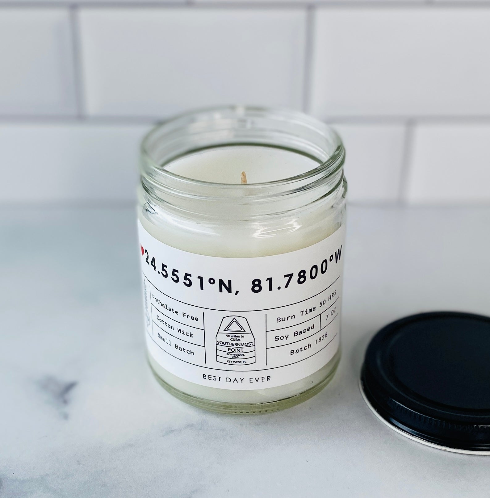 Key West, Florida Longitude Latitude Candle - Rambling Caravan candles are inspired by home, travel and adventure. Made from a soy/coconut based wax blend, the candles are hand poured in Virginia Beach, Virginia. We use phthalate free fragrances and have an assortment of fragrances from which to choose. Many of our candles have different color labels to choose from as well. We use cotton wicks with no zinc or lead. We do not use additives, nor scent enhancers or UV blockers. The burn time is approximately 50 hours.