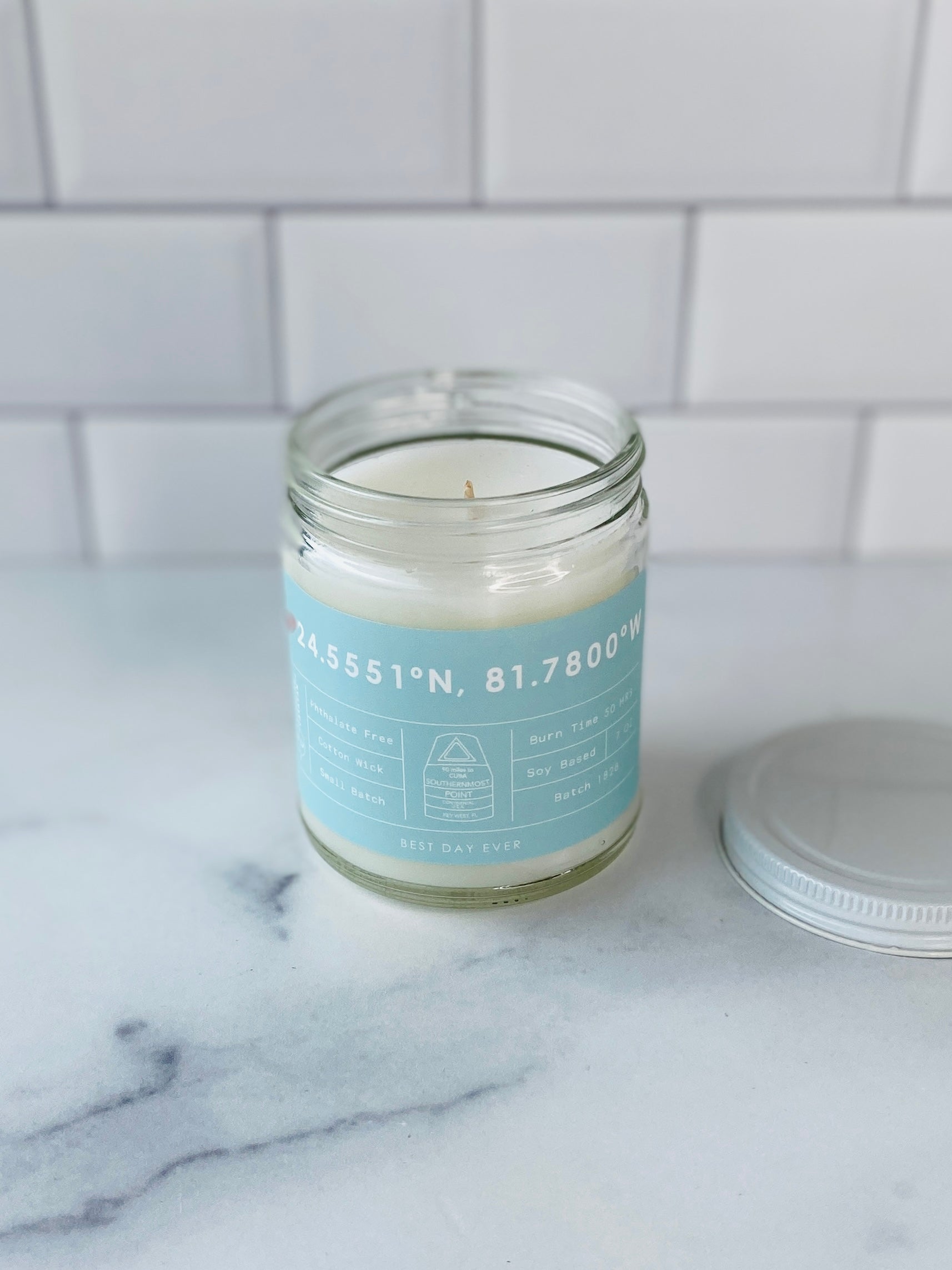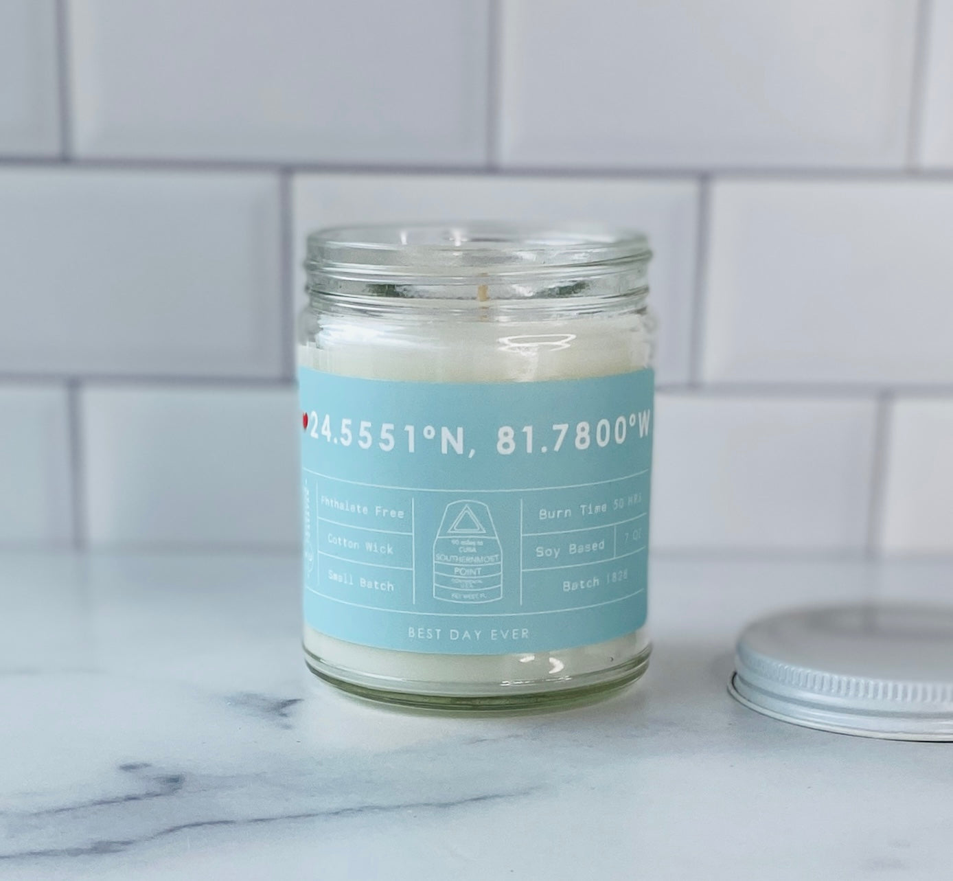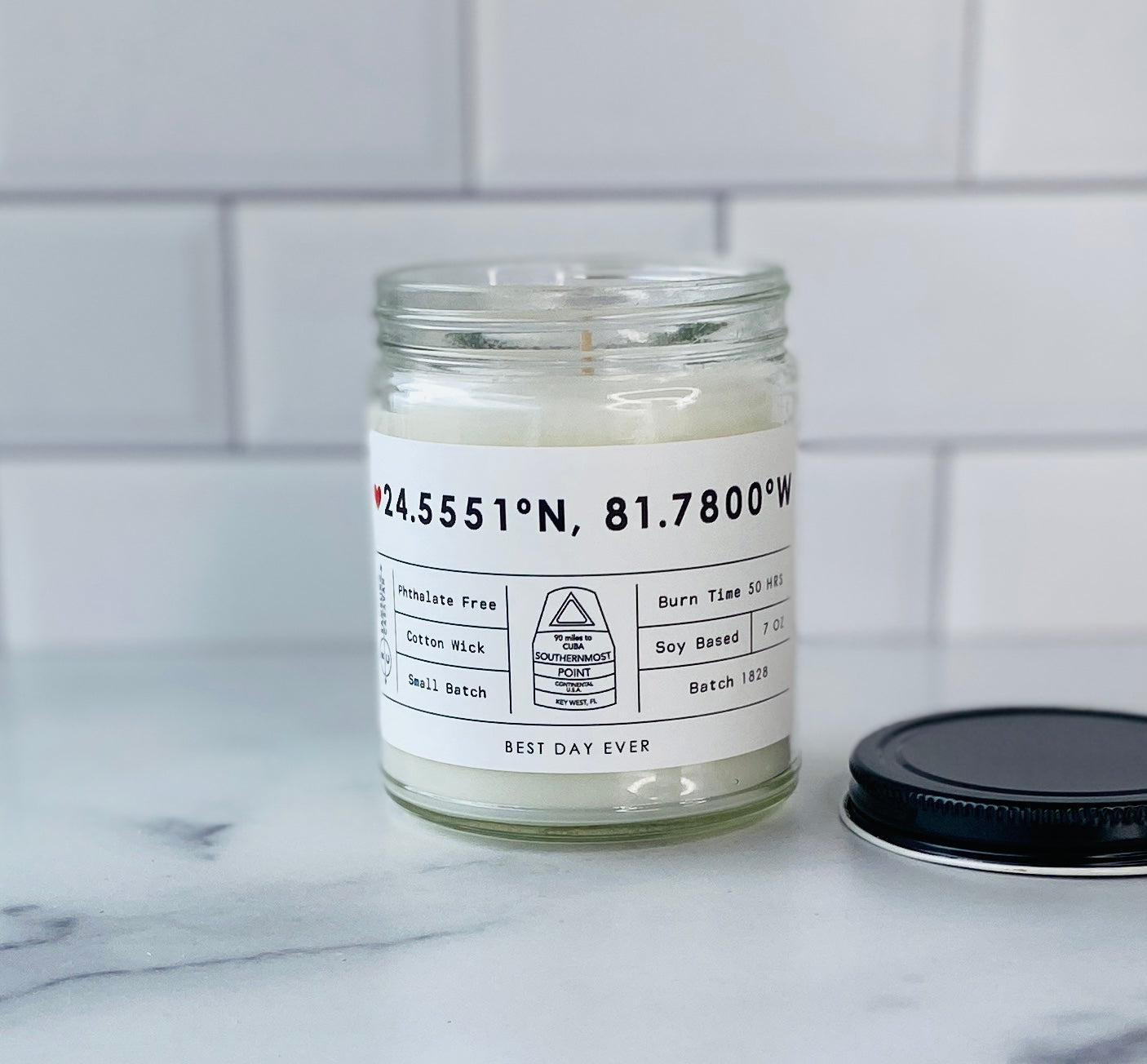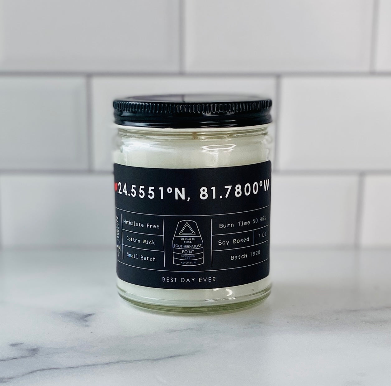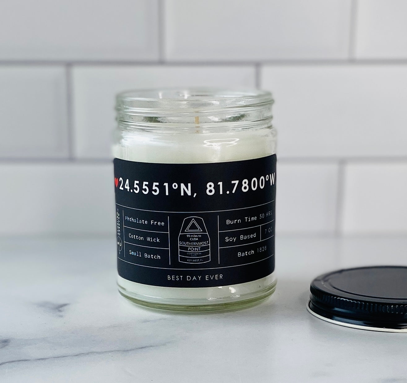 Key West, Florida Longitude Latitude Candle - Rambling Caravan candles are inspired by home, travel and adventure. Made from a soy/coconut based wax blend, the candles are hand poured in Virginia Beach, Virginia. We use phthalate free fragrances and have an assortment of fragrances from which to choose. Many of our candles have different color labels to choose from as well. We use cotton wicks with no zinc or lead. We do not use additives, nor scent enhancers or UV blockers. The burn time is approximately 50 hours.