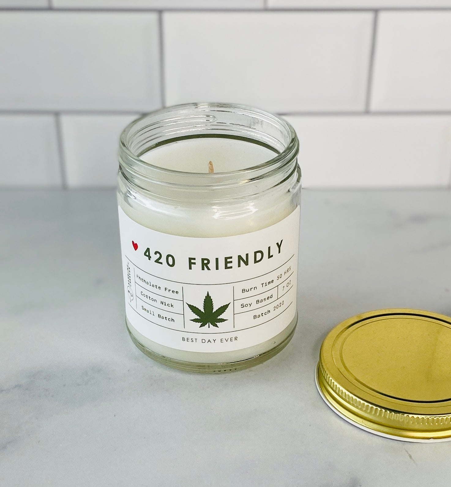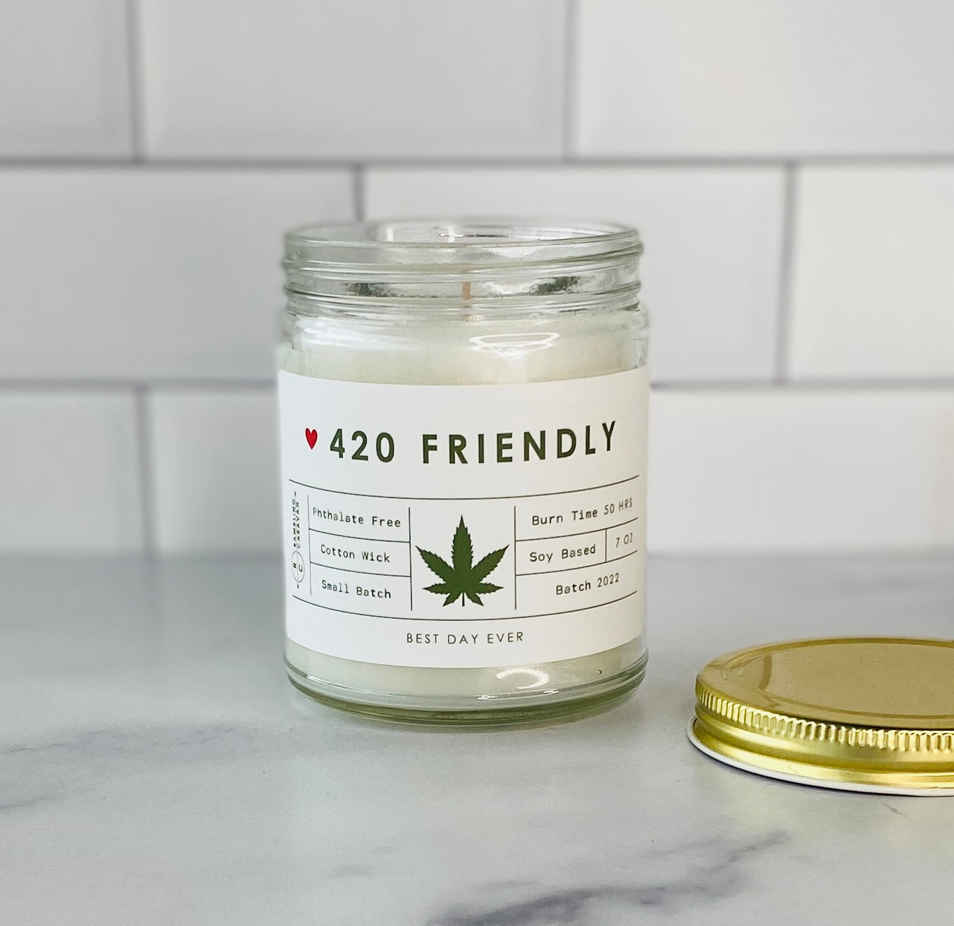 420 Friendly Candle - Rambling Caravan candles are inspired by home, travel and adventure. Made from a soy/coconut based wax blend, the candles are hand poured in Virginia Beach, Virginia. We use phthalate free fragrances and have an assortment of fragrances from which to choose. Many of our candles have different color labels to choose from as well. We use cotton wicks with no zinc or lead. We do not use additives, nor scent enhancers or UV blockers. The burn time is approximately 50 hours.