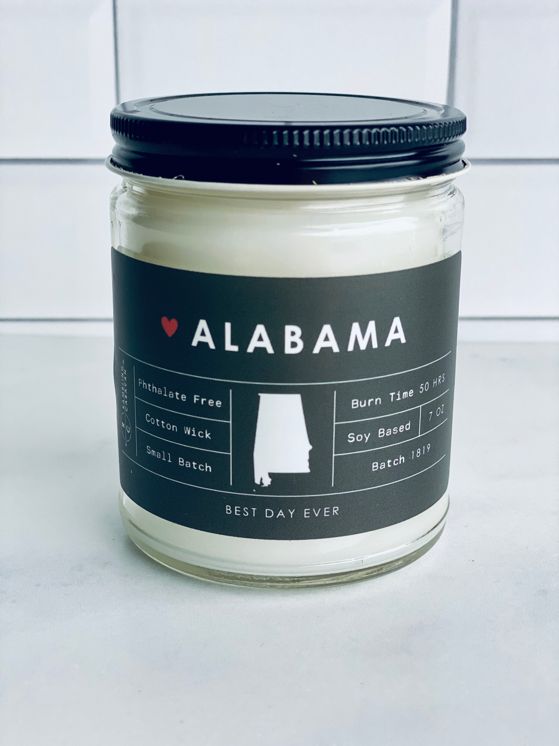 Alabama Candle - Rambling Caravan candles are inspired by home, travel and adventure. Made from a soy/coconut based wax blend, the candles are hand poured in Virginia Beach, Virginia. We use phthalate free fragrances and have an assortment of fragrances from which to choose. Many of our candles have different color labels to choose from as well. We use cotton wicks with no zinc or lead. We do not use additives, nor scent enhancers or UV blockers. The burn time is approximately 50 hours.