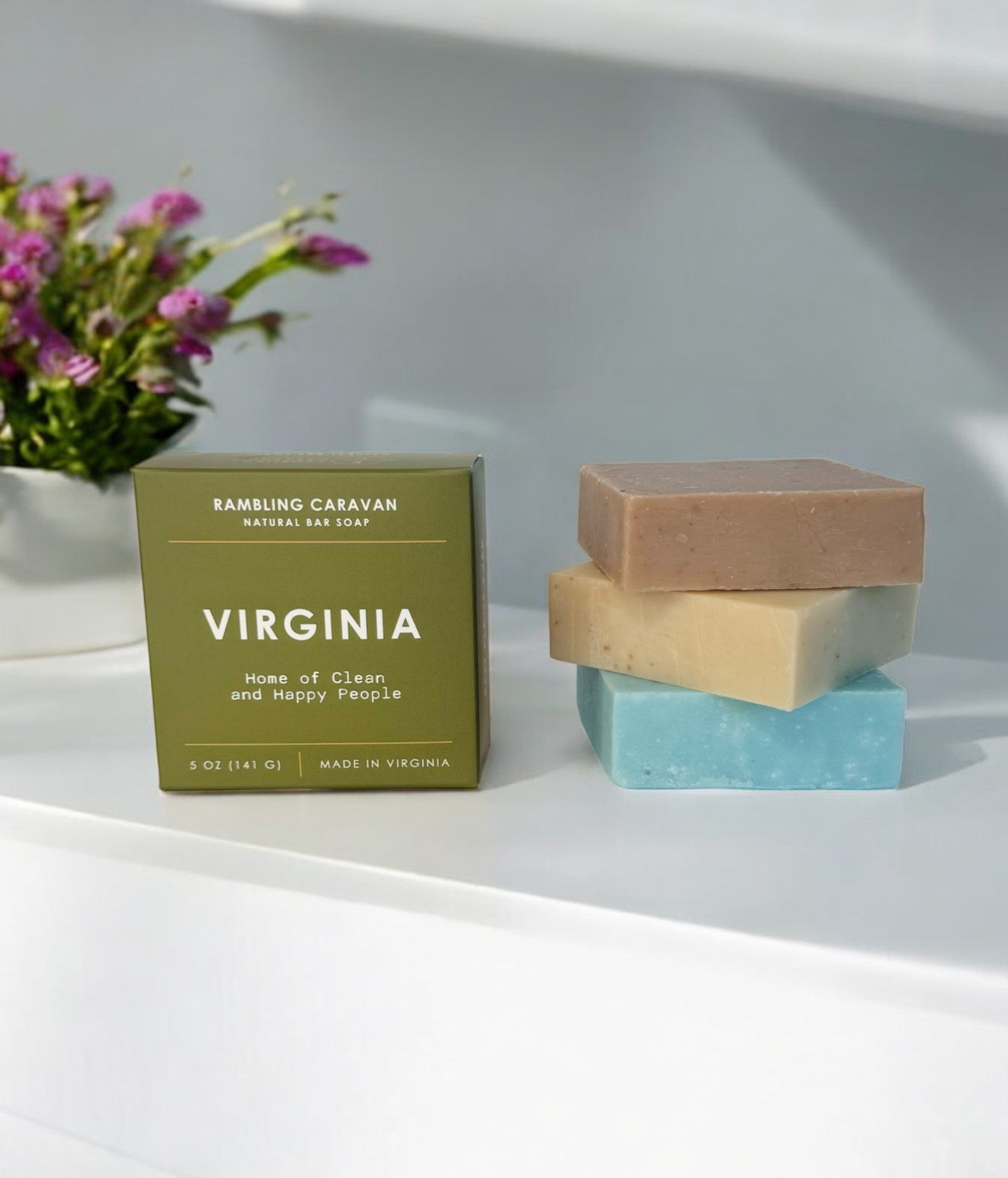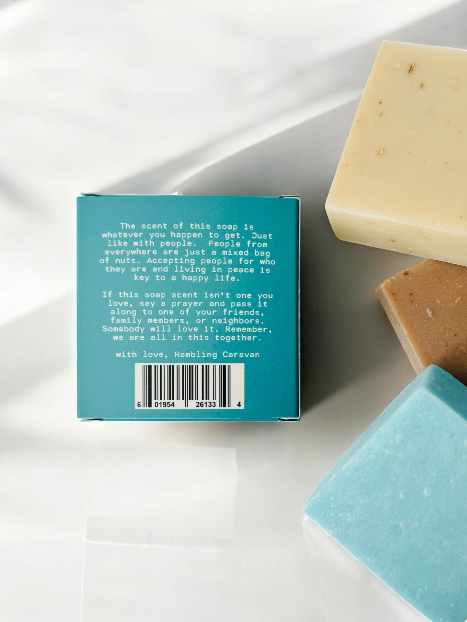 Our 5 ounce natural cold process bar soap is made in Virginia and features different destinations. The scent of this soap is whatever you happen to get. Just like with people. People from everywhere are a mixed bag of nuts. Accepting people for who they are and living in peace is key to a happy life. If this soap scent isn't one you love, say a prayer and pass it along to one of your friends, family members, or neighbors. Somebody will love it. FYI: We only use the best scents.