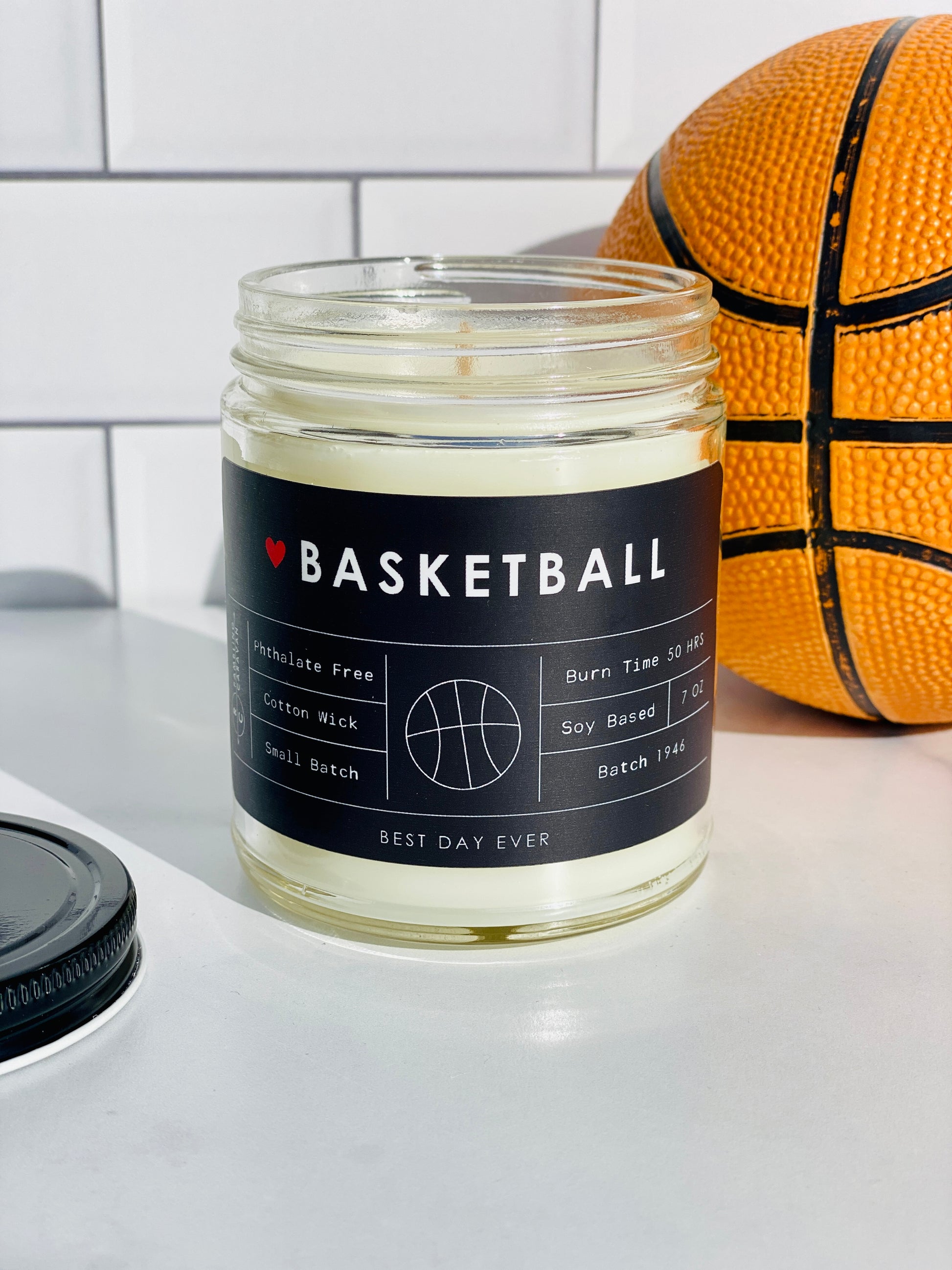 Basketball Candle - Rambling Caravan candles are inspired by home, travel and adventure. Made from a soy/coconut based wax blend, the candles are hand poured in Virginia Beach, Virginia. We use phthalate free fragrances and have an assortment of fragrances from which to choose. Many of our candles have different color labels to choose from as well. We use cotton wicks with no zinc or lead. We do not use additives, nor scent enhancers or UV blockers. The burn time is approximately 50 hours.