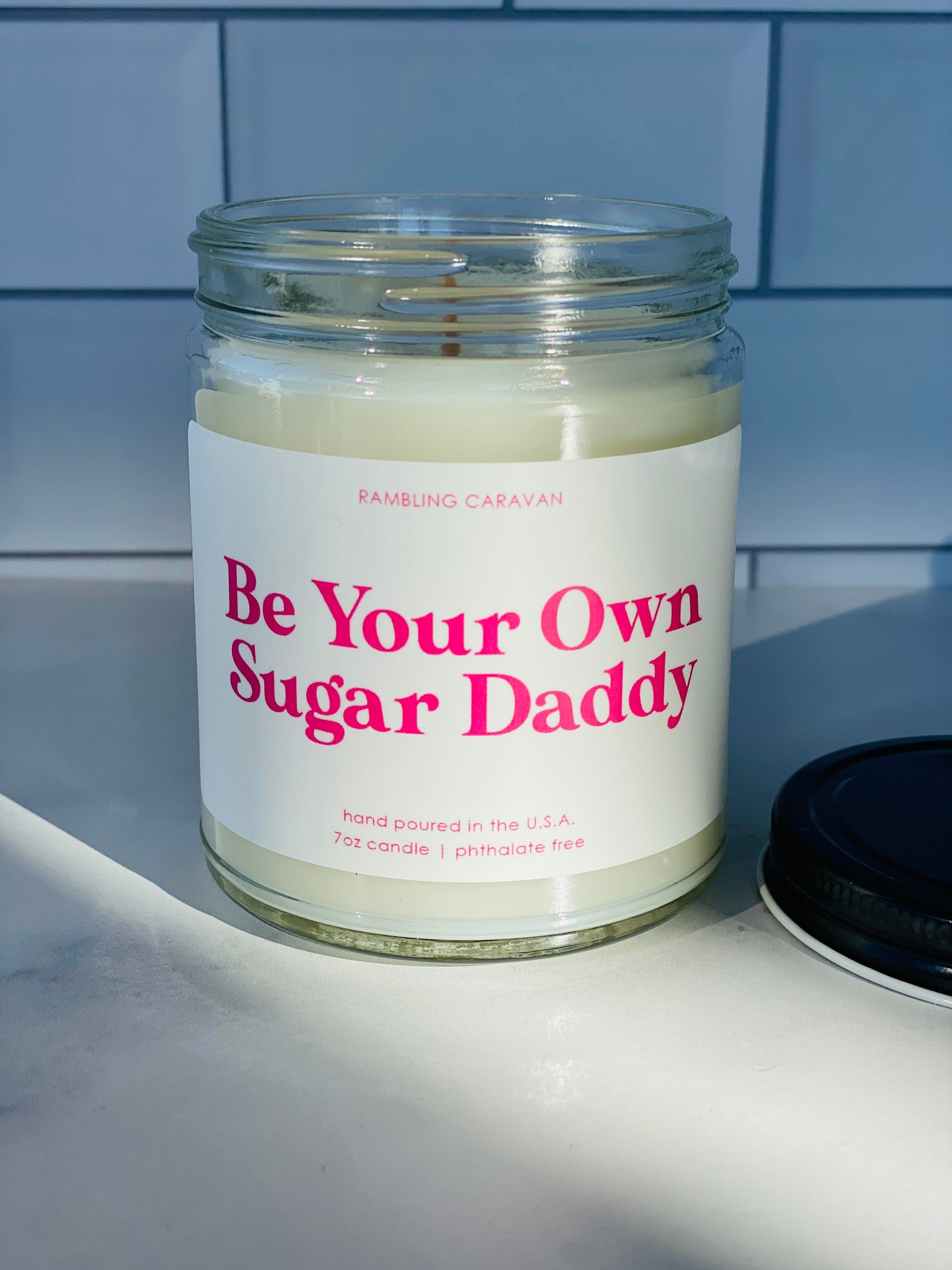 Be Your Own Sugar Daddy Candle - Rambling Caravan candles are inspired by home, travel and adventure. Made from a soy/coconut based wax blend, the candles are hand poured in Virginia Beach, Virginia. We use phthalate free fragrances and have an assortment of fragrances from which to choose. Many of our candles have different color labels to choose from as well. We use cotton wicks with no zinc or lead. We do not use additives, nor scent enhancers or UV blockers. The burn time is approximately 50 hours.
