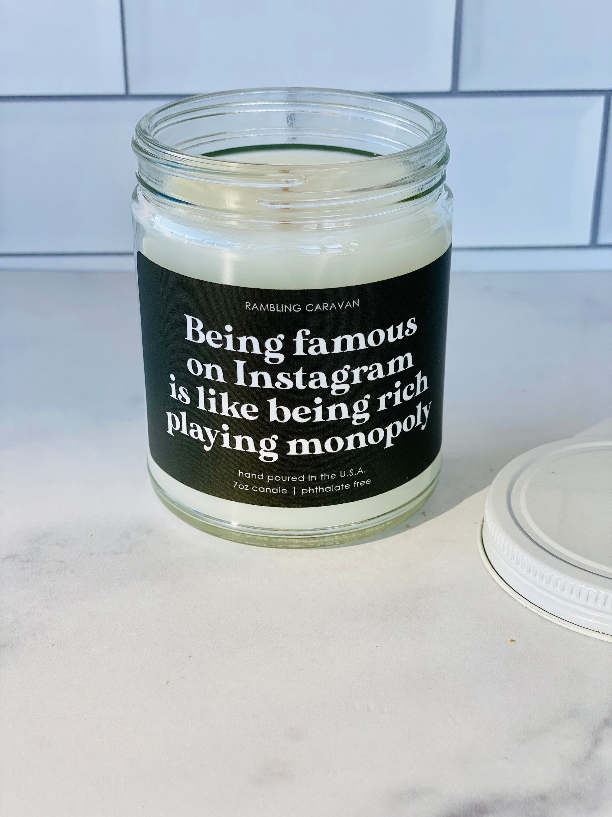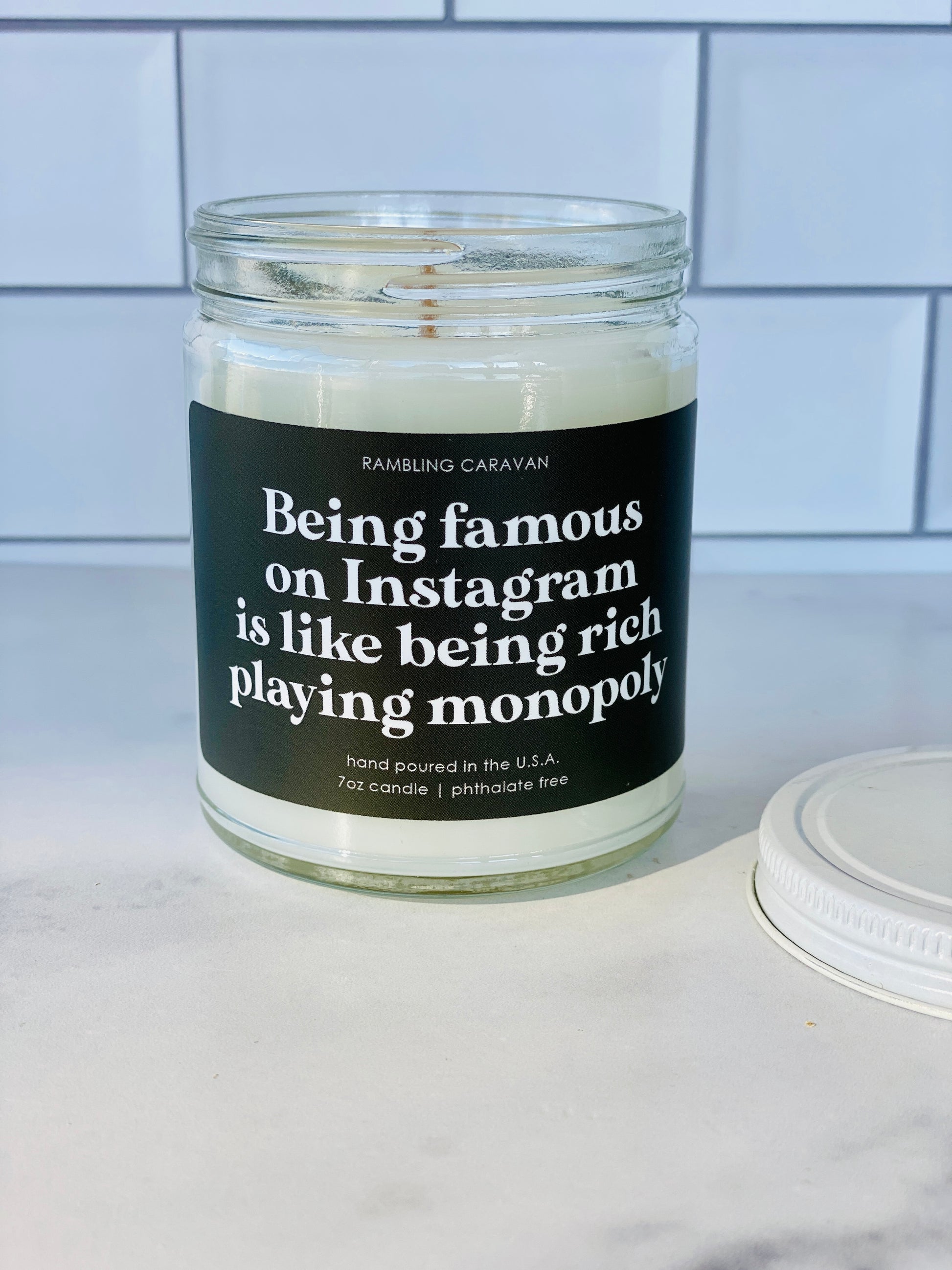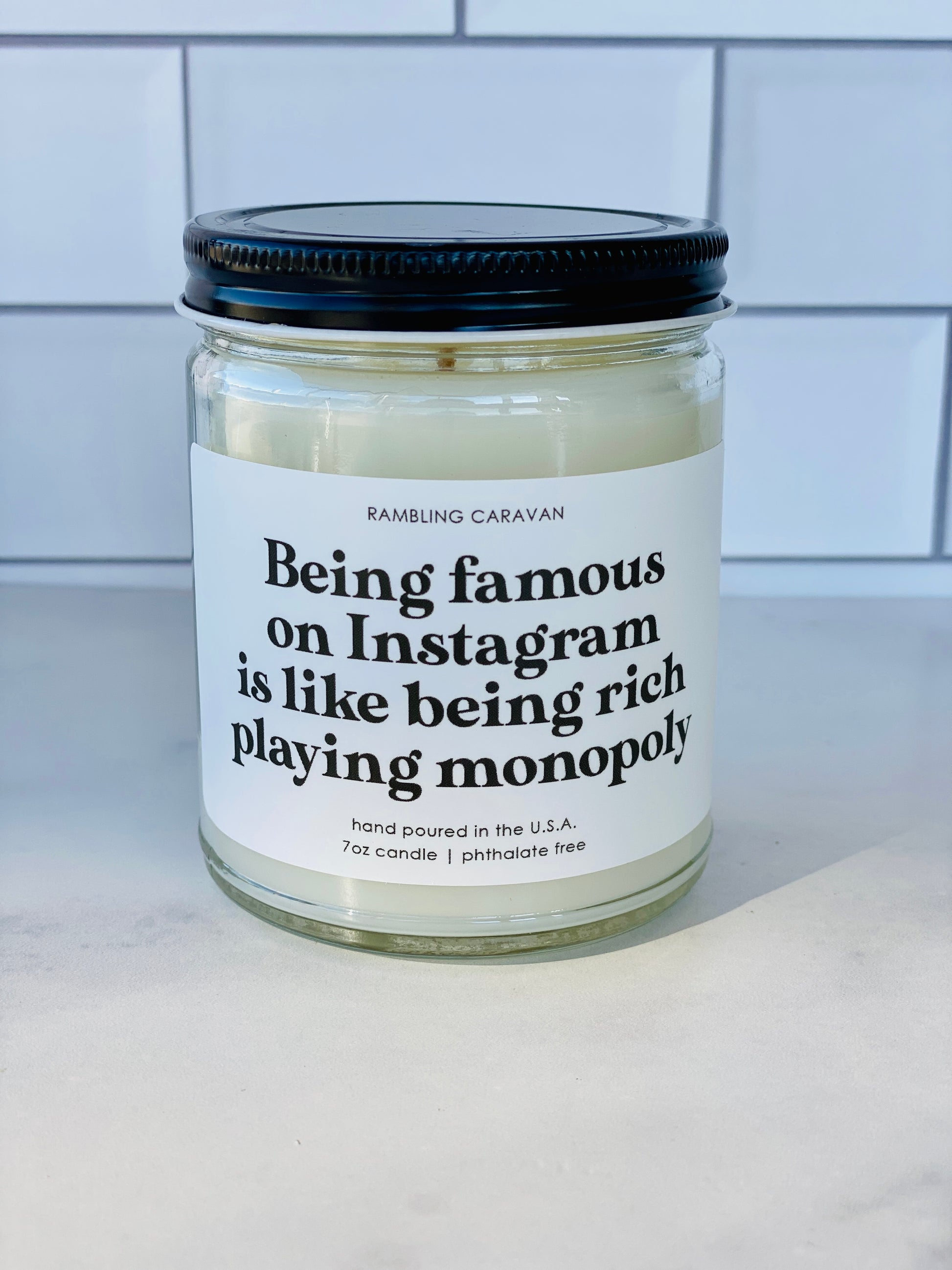 Being Famous on Instagram Candle - Rambling Caravan candles are inspired by home, travel and adventure. Made from a soy/coconut based wax blend, the candles are hand poured in Virginia Beach, Virginia. We use phthalate free fragrances and have an assortment of fragrances from which to choose. Many of our candles have different color labels to choose from as well. We use cotton wicks with no zinc or lead. We do not use additives, nor scent enhancers or UV blockers. The burn time is approximately 50 hours.