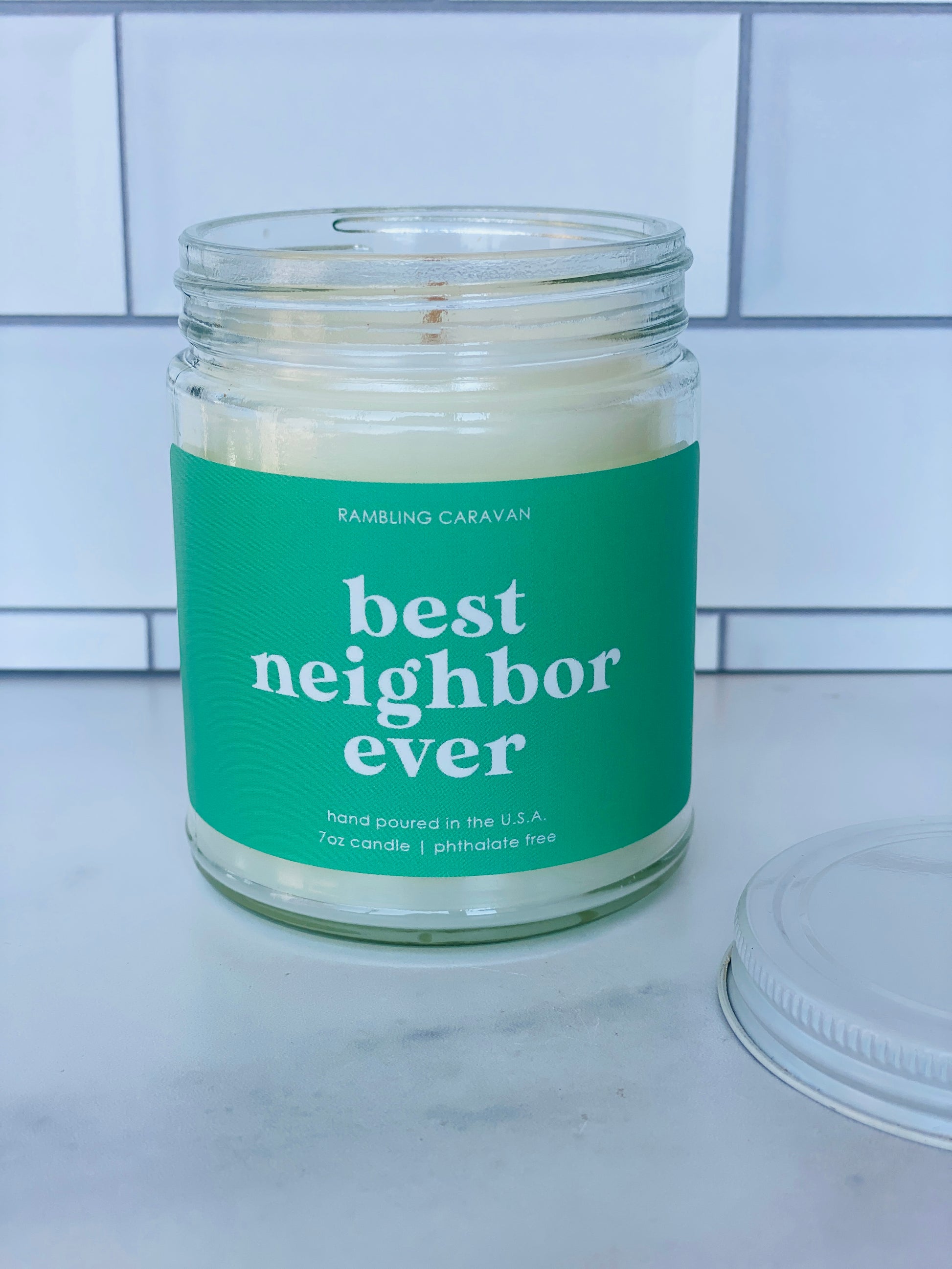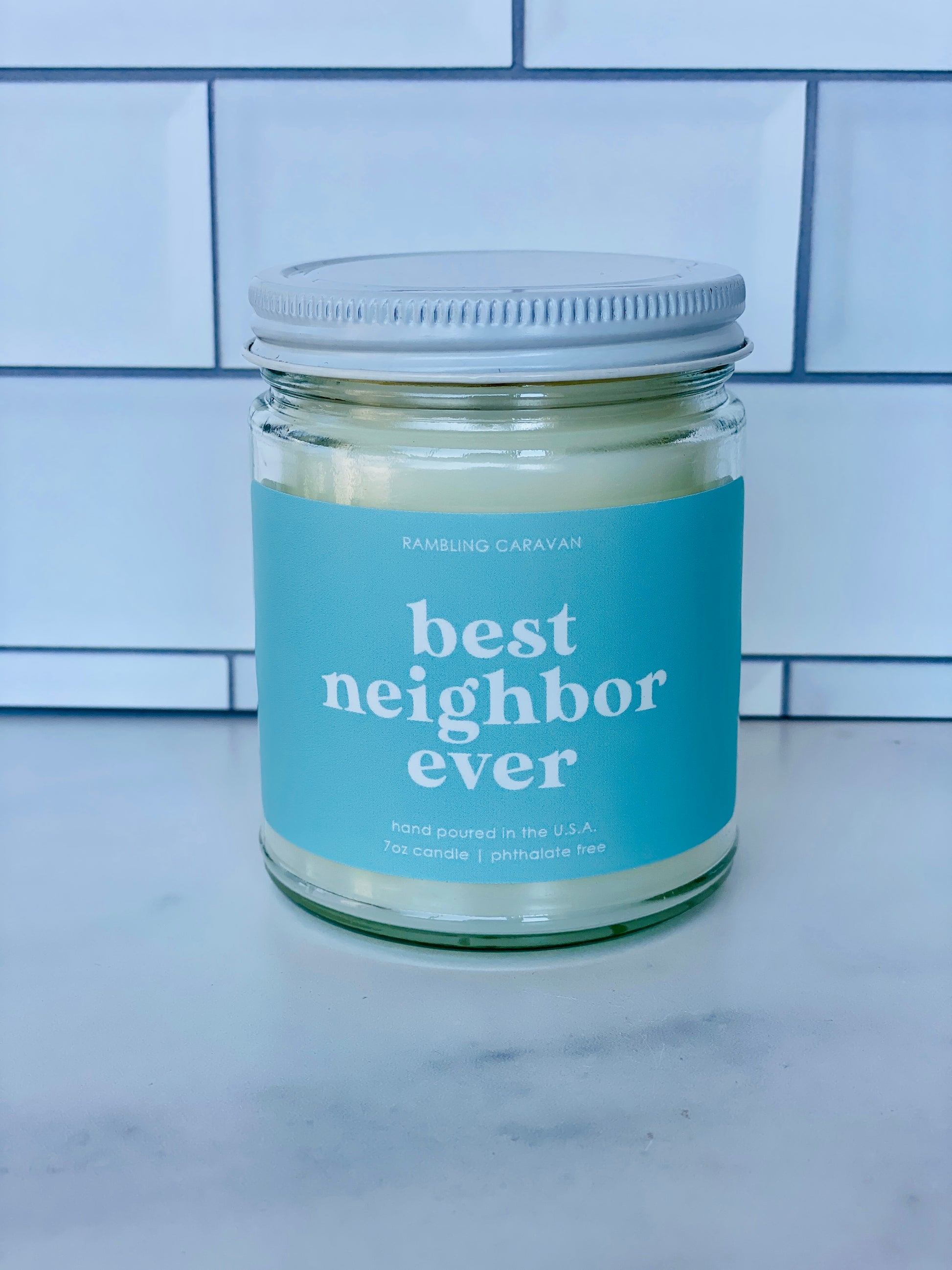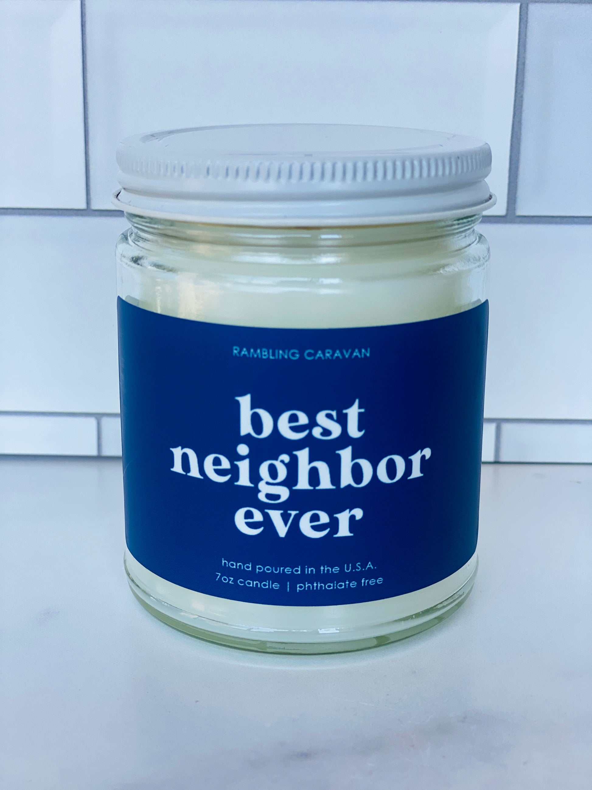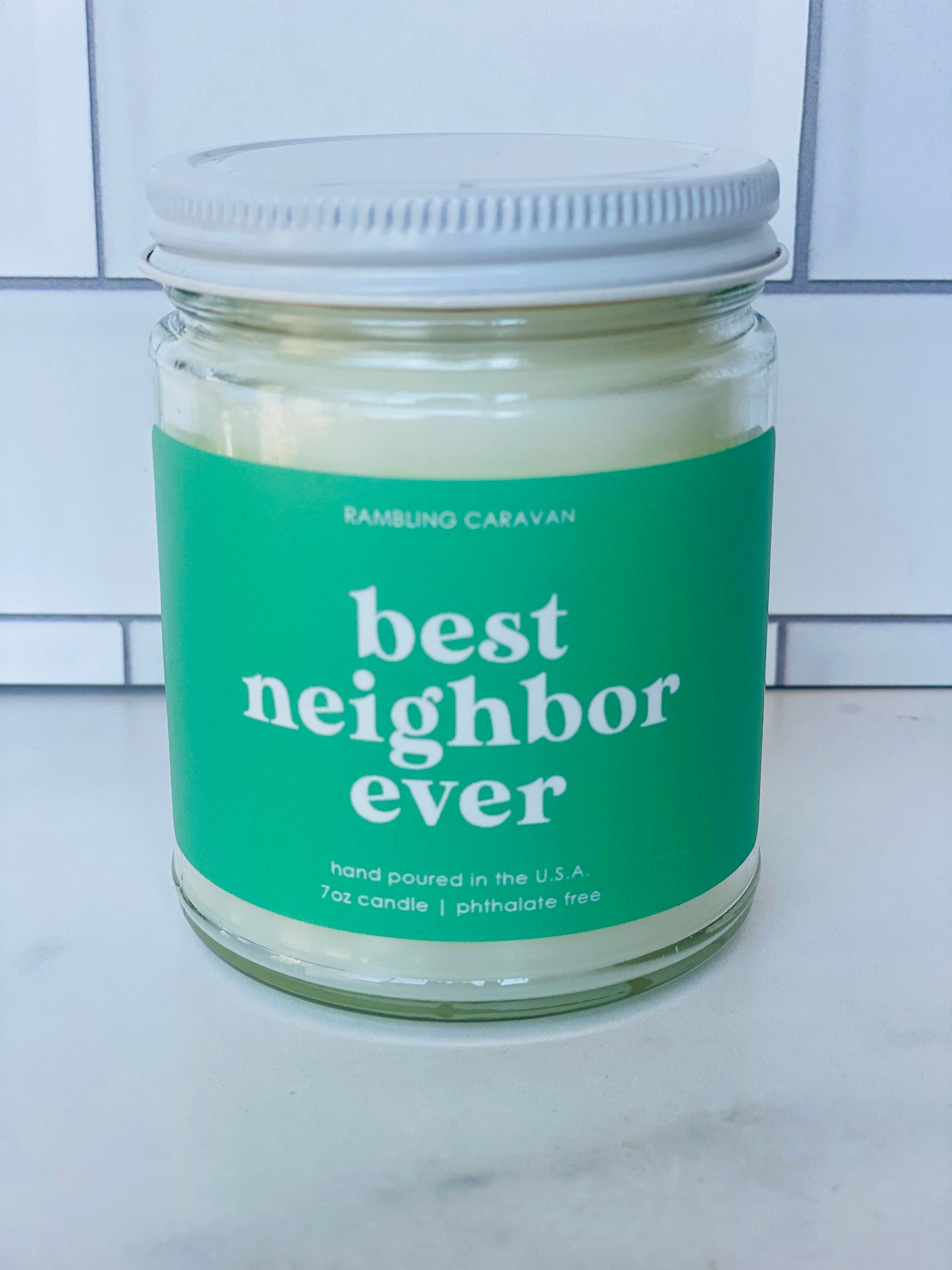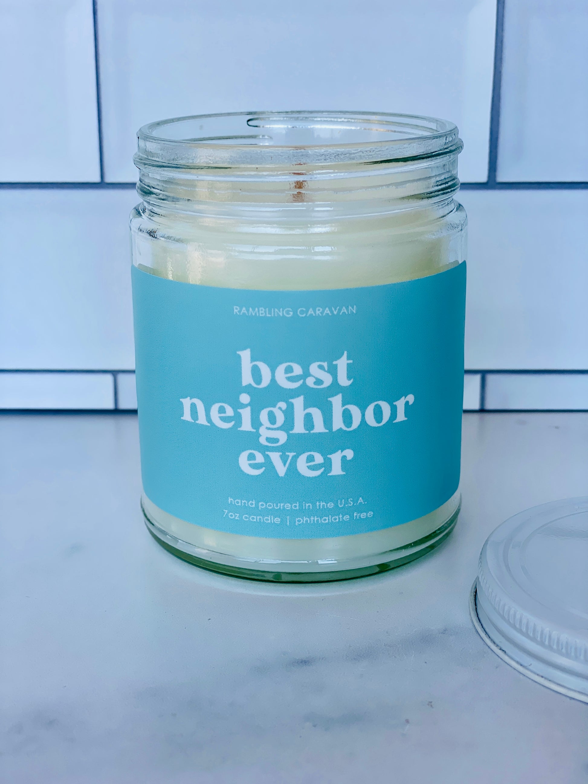 Best Neighbor Ever Candle - Rambling Caravan candles are inspired by home, travel and adventure. Made from a soy/coconut based wax blend, the candles are hand poured in Virginia Beach, Virginia. We use phthalate free fragrances and have an assortment of fragrances from which to choose. Many of our candles have different color labels to choose from as well. We use cotton wicks with no zinc or lead. We do not use additives, nor scent enhancers or UV blockers. The burn time is approximately 50 hours.