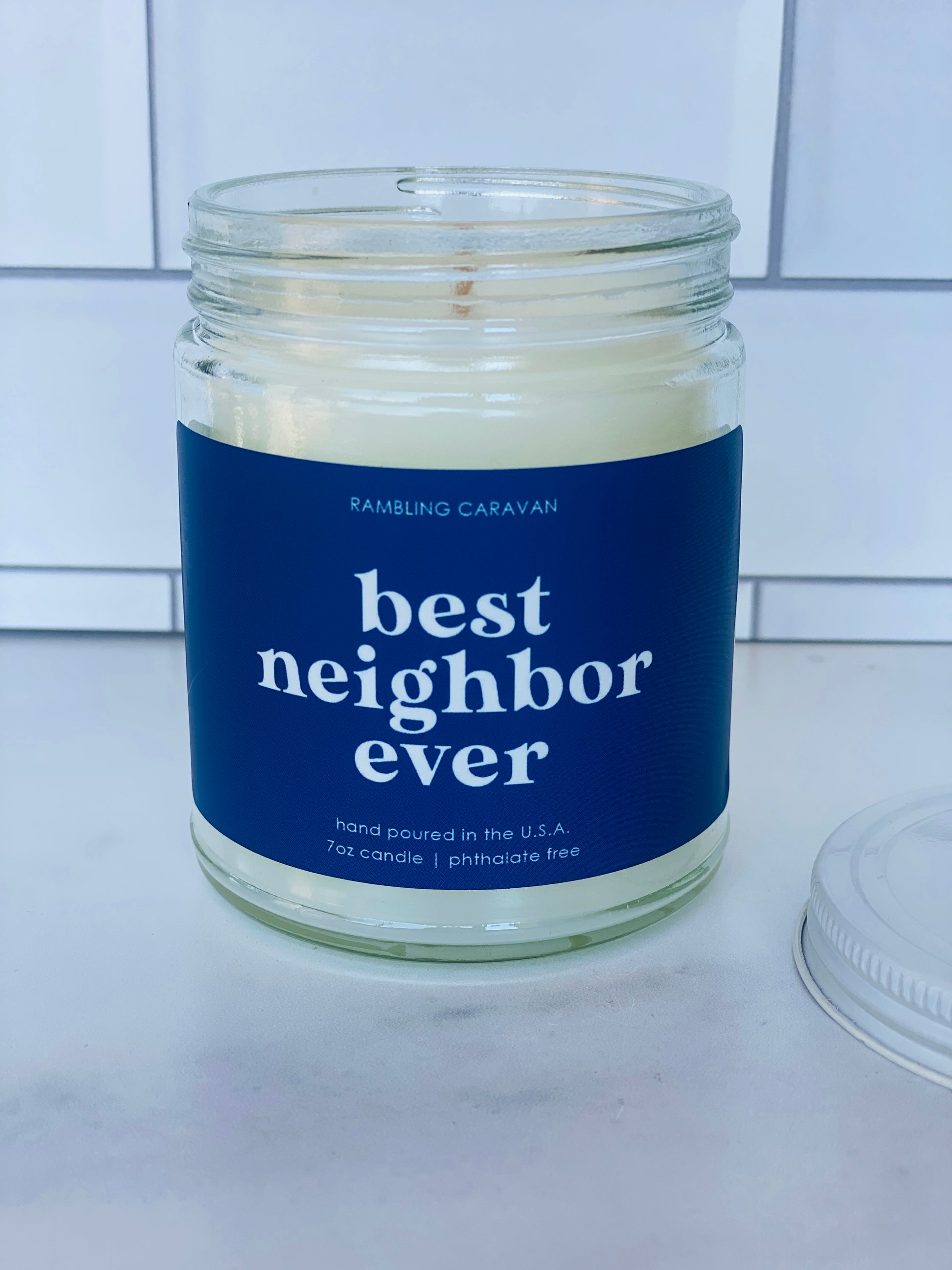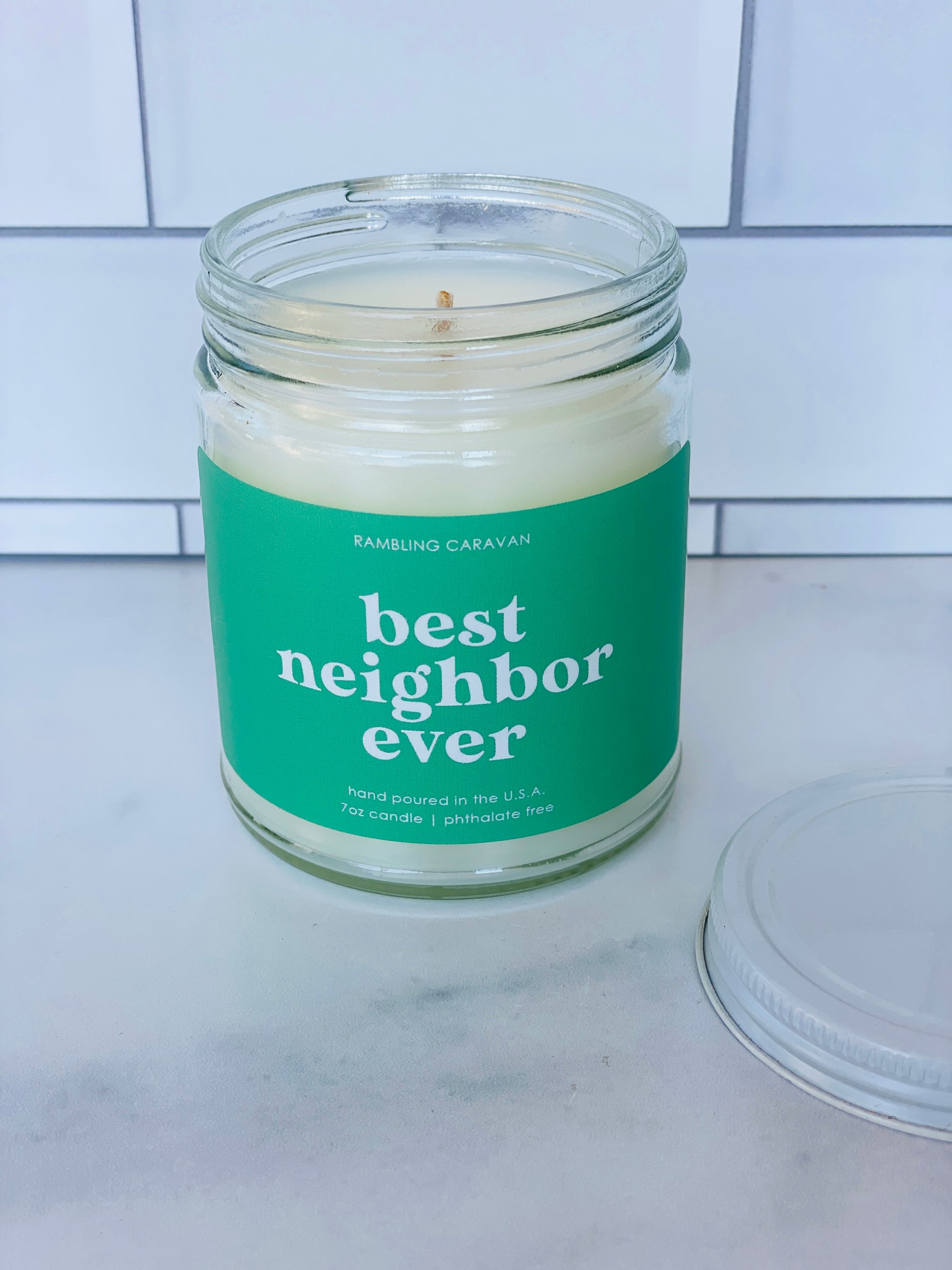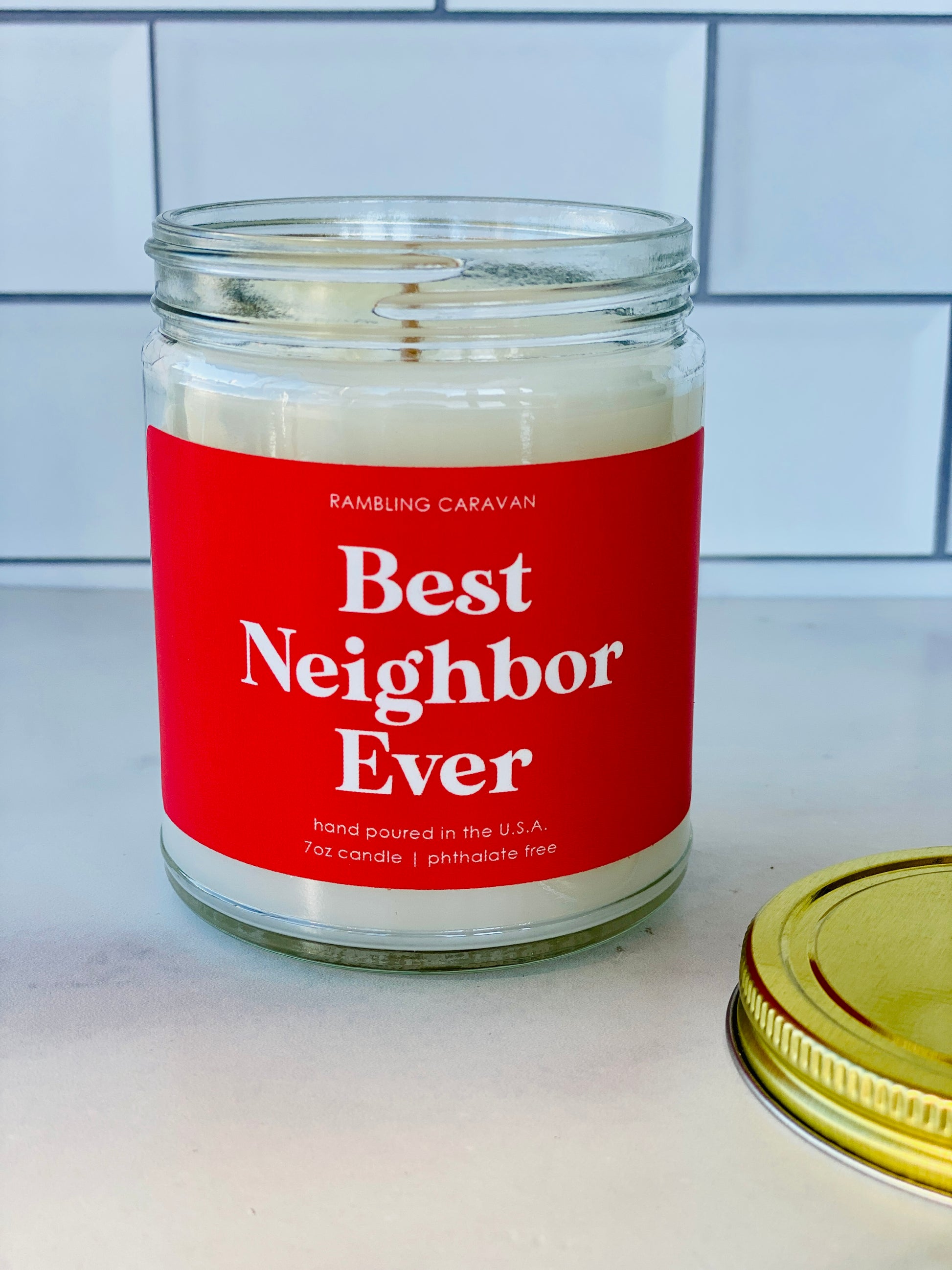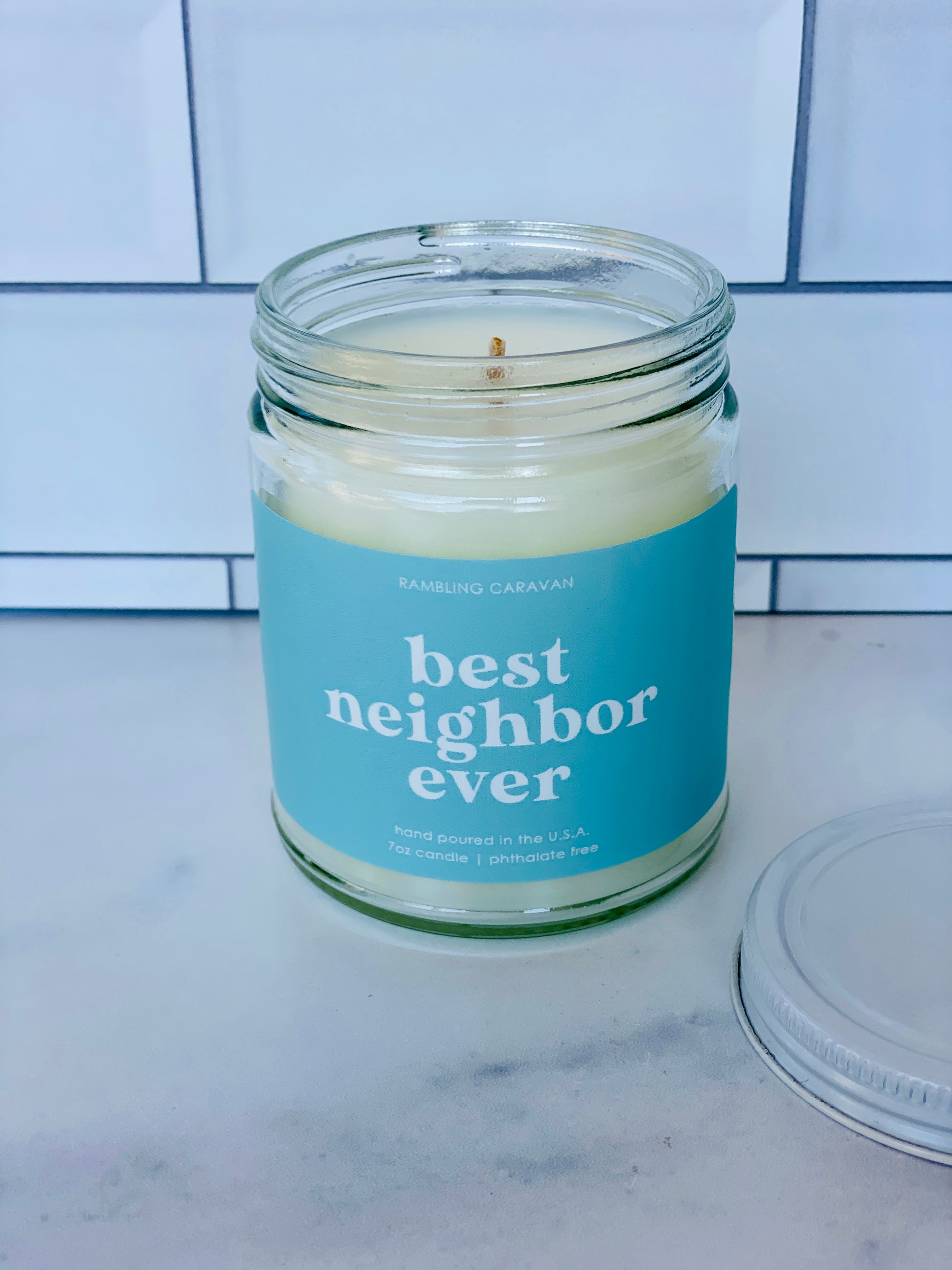 Best Neighbor Ever Candle - Rambling Caravan candles are inspired by home, travel and adventure. Made from a soy/coconut based wax blend, the candles are hand poured in Virginia Beach, Virginia. We use phthalate free fragrances and have an assortment of fragrances from which to choose. Many of our candles have different color labels to choose from as well. We use cotton wicks with no zinc or lead. We do not use additives, nor scent enhancers or UV blockers. The burn time is approximately 50 hours.