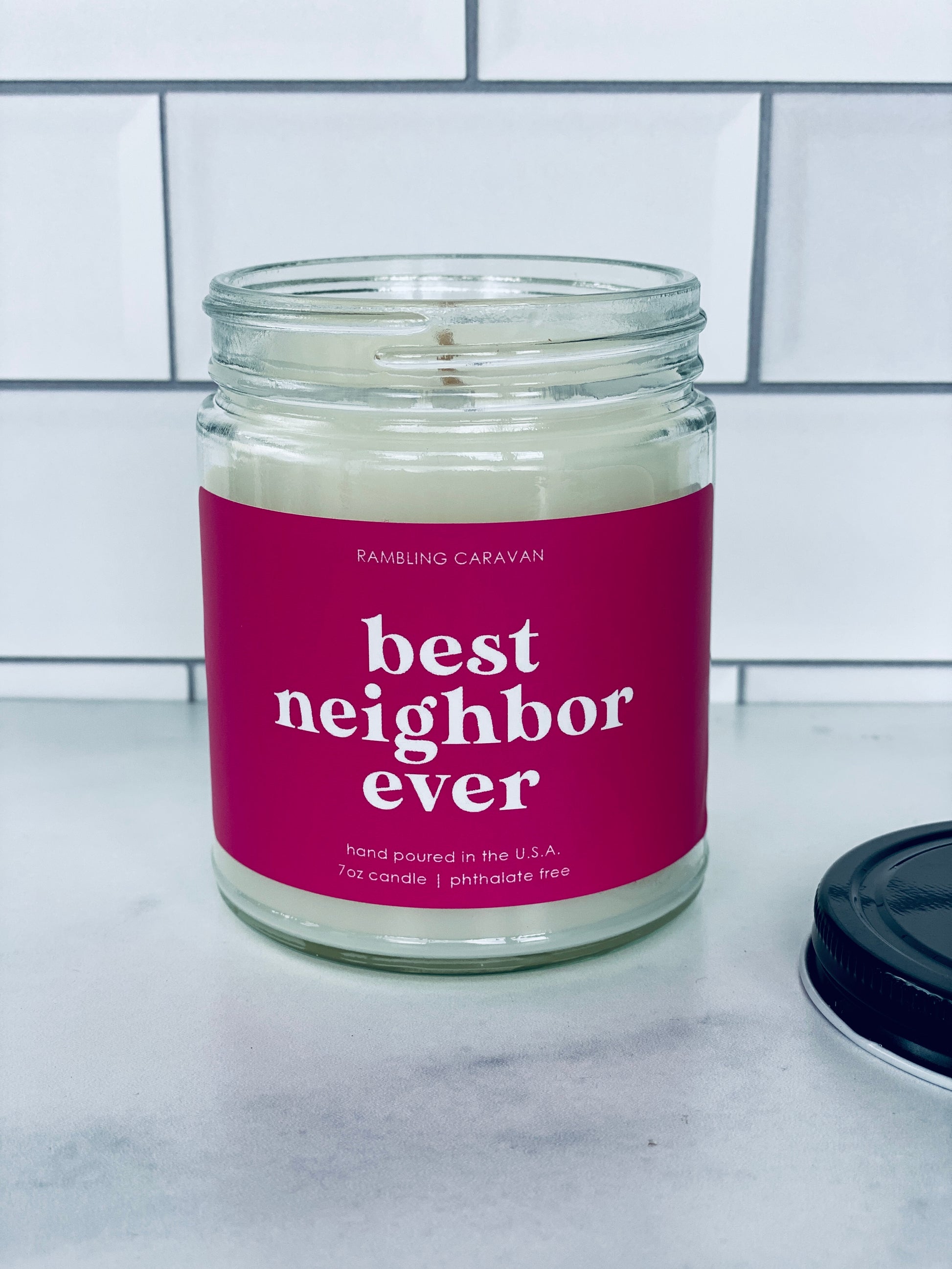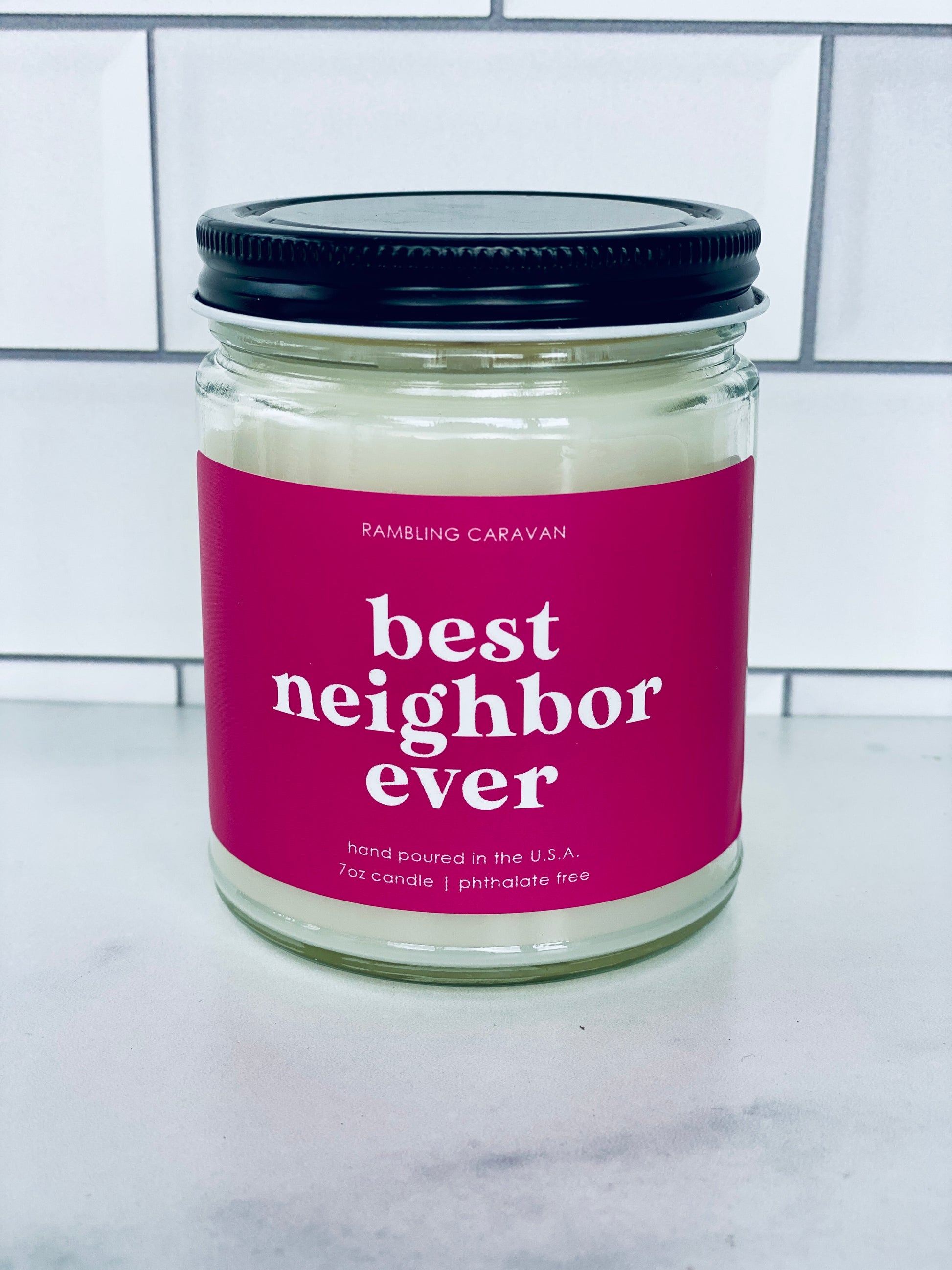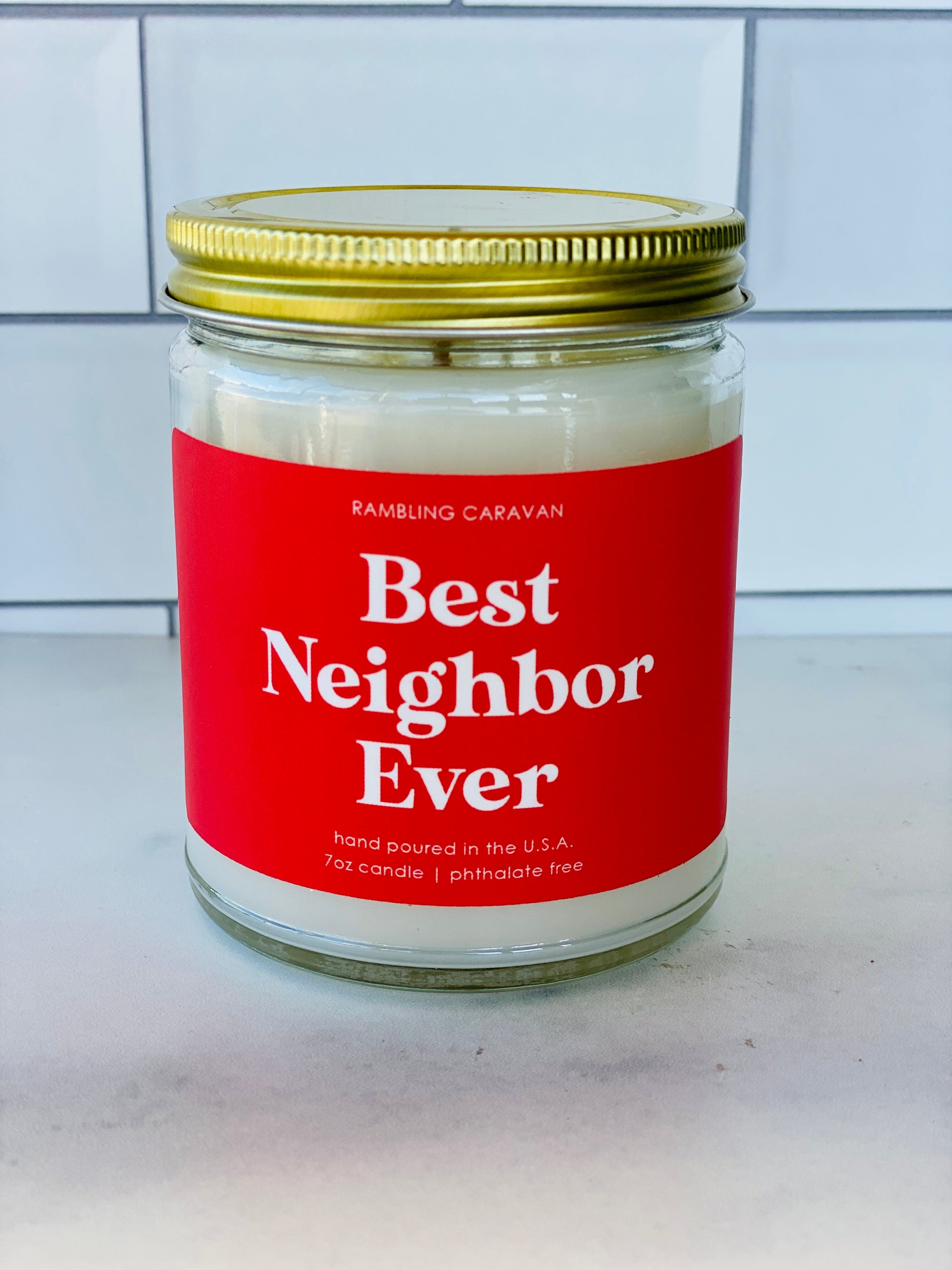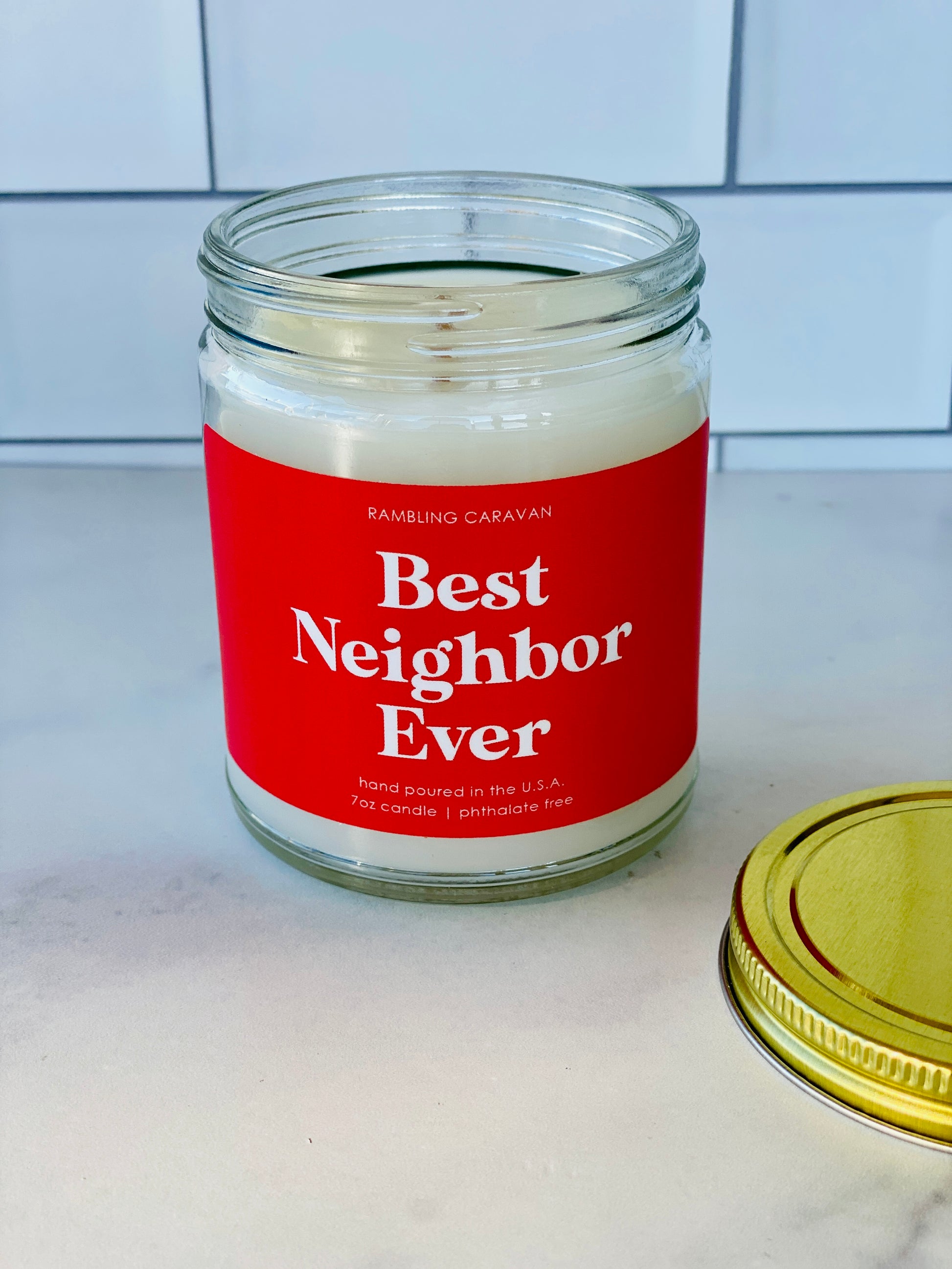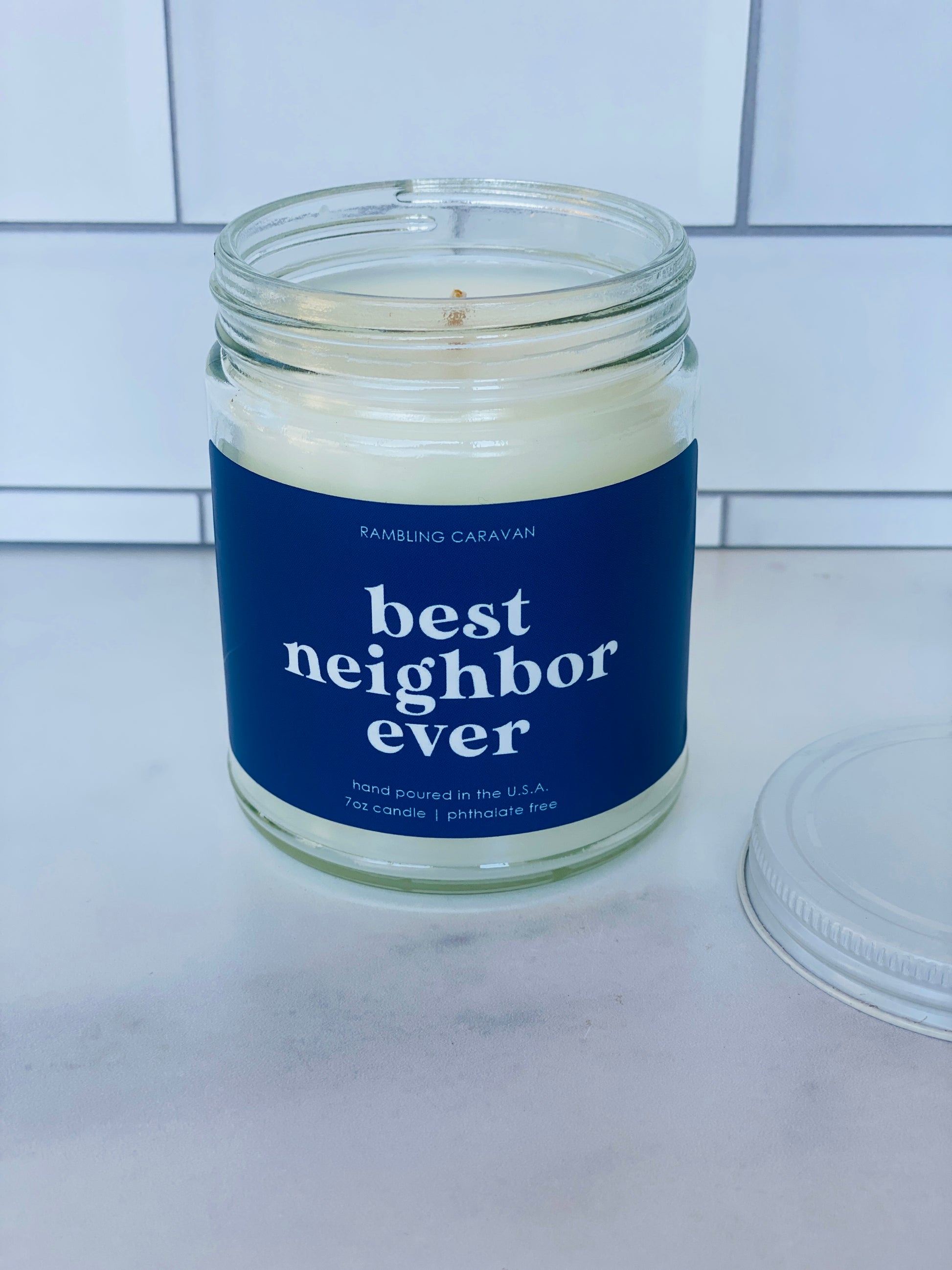 Best Neighbor Ever Candle - Rambling Caravan candles are inspired by home, travel and adventure. Made from a soy/coconut based wax blend, the candles are hand poured in Virginia Beach, Virginia. We use phthalate free fragrances and have an assortment of fragrances from which to choose. Many of our candles have different color labels to choose from as well. We use cotton wicks with no zinc or lead. We do not use additives, nor scent enhancers or UV blockers. The burn time is approximately 50 hours.