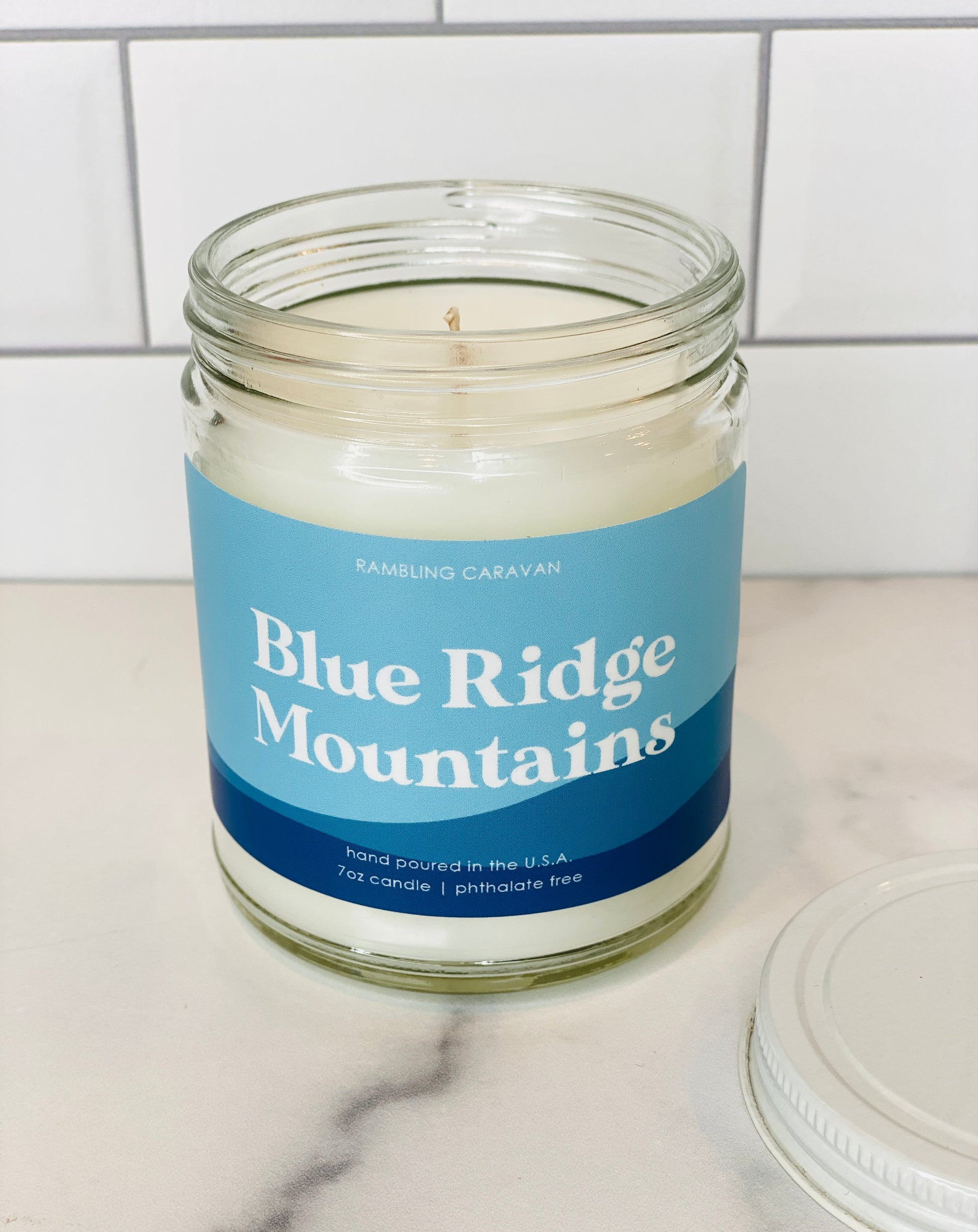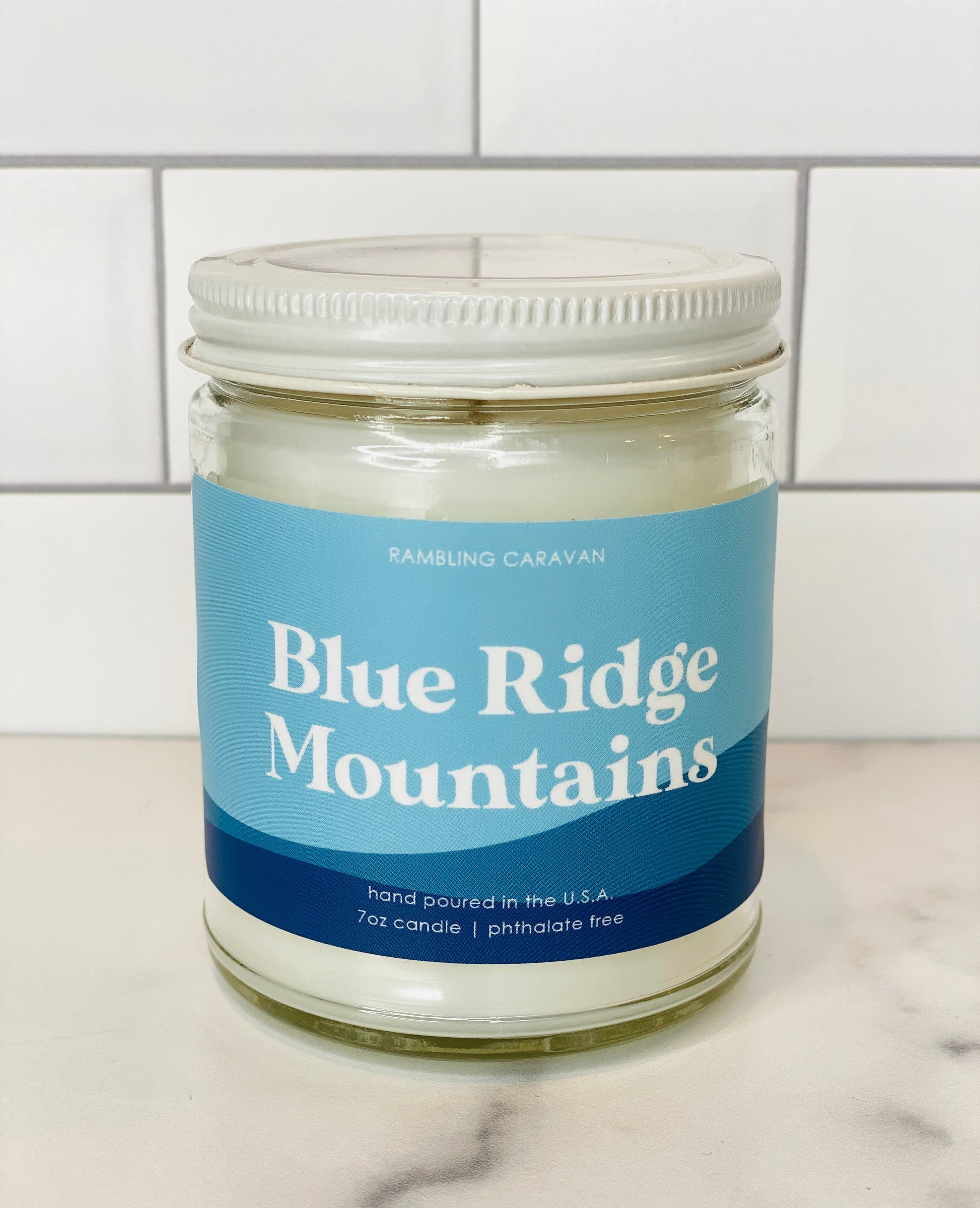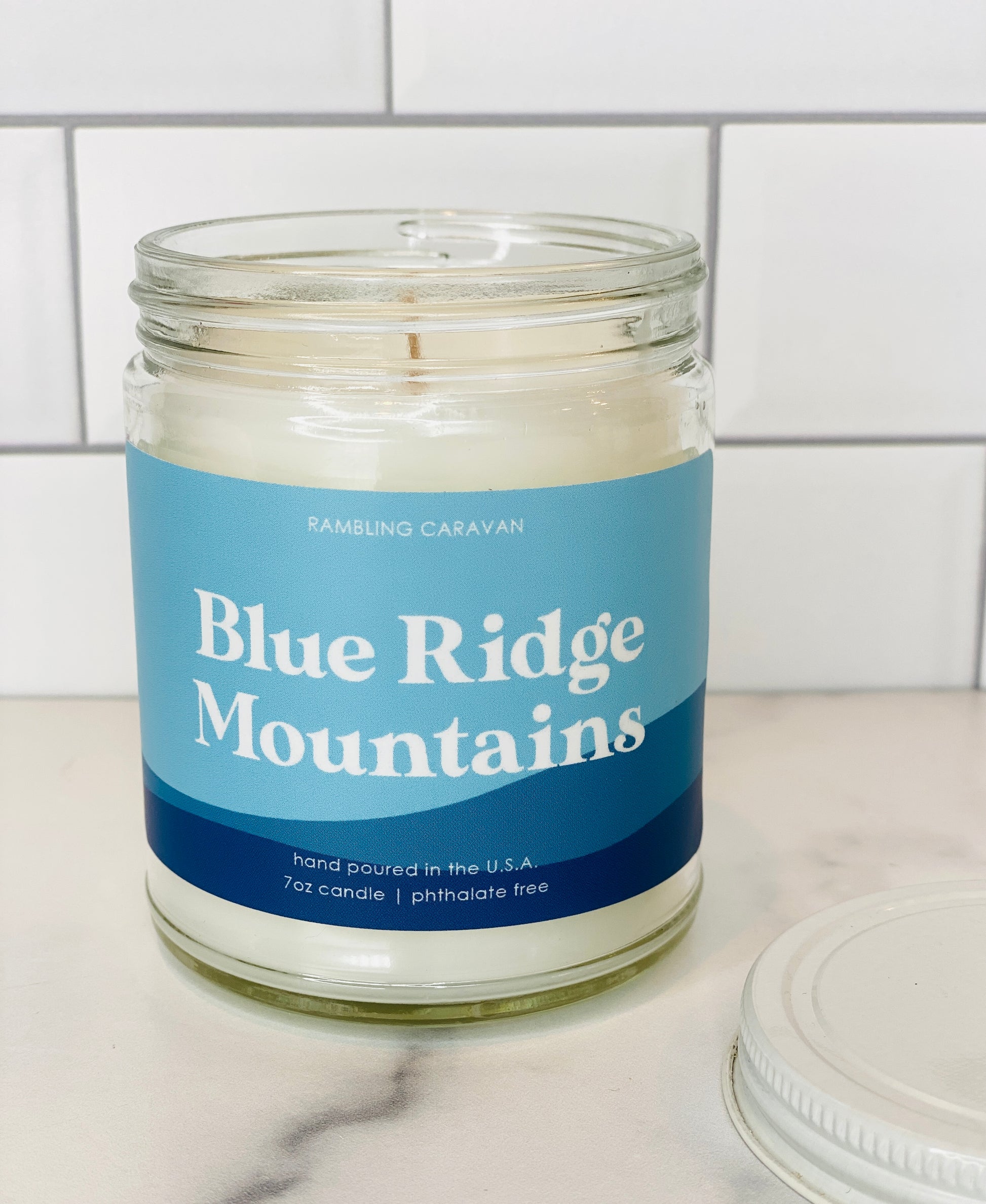 Blue Ridge Mountains Candle - Rambling Caravan candles are inspired by home, travel and adventure. Made from a soy/coconut based wax blend, the candles are hand poured in Virginia Beach, Virginia. We use phthalate free fragrances and have an assortment of fragrances from which to choose. Many of our candles have different color labels to choose from as well. We use cotton wicks with no zinc or lead. We do not use additives, nor scent enhancers or UV blockers. The burn time is approximately 50 hours.