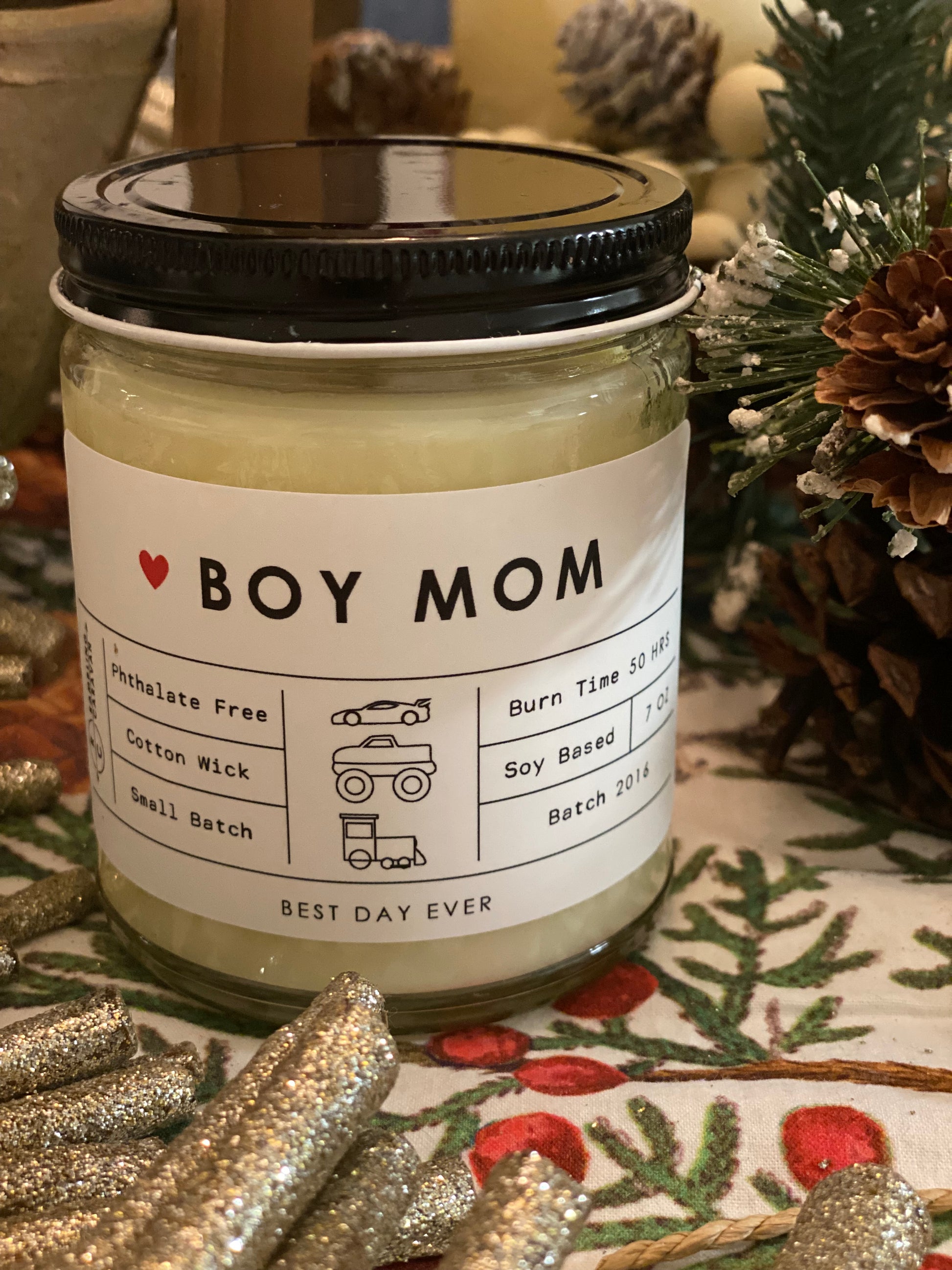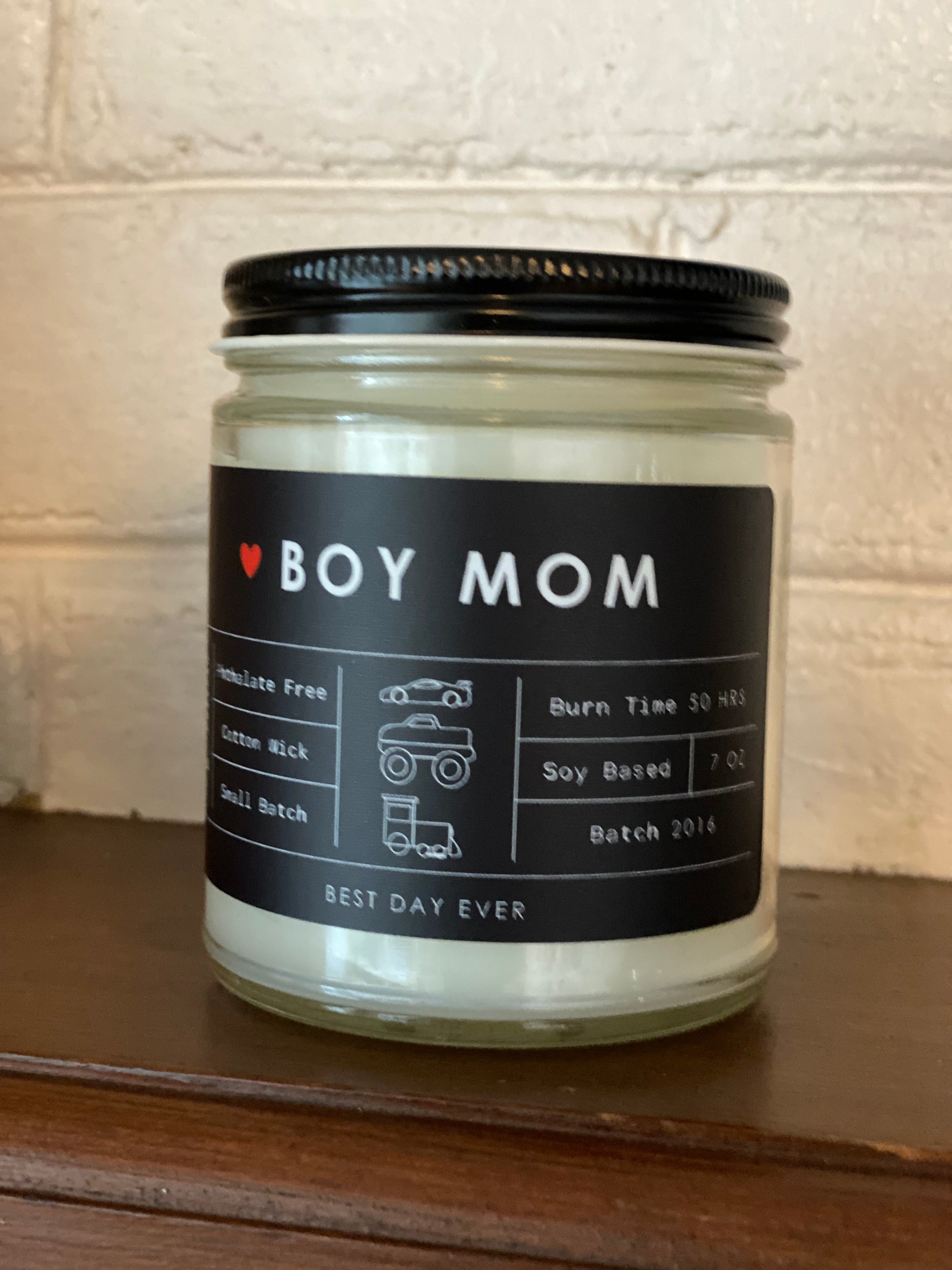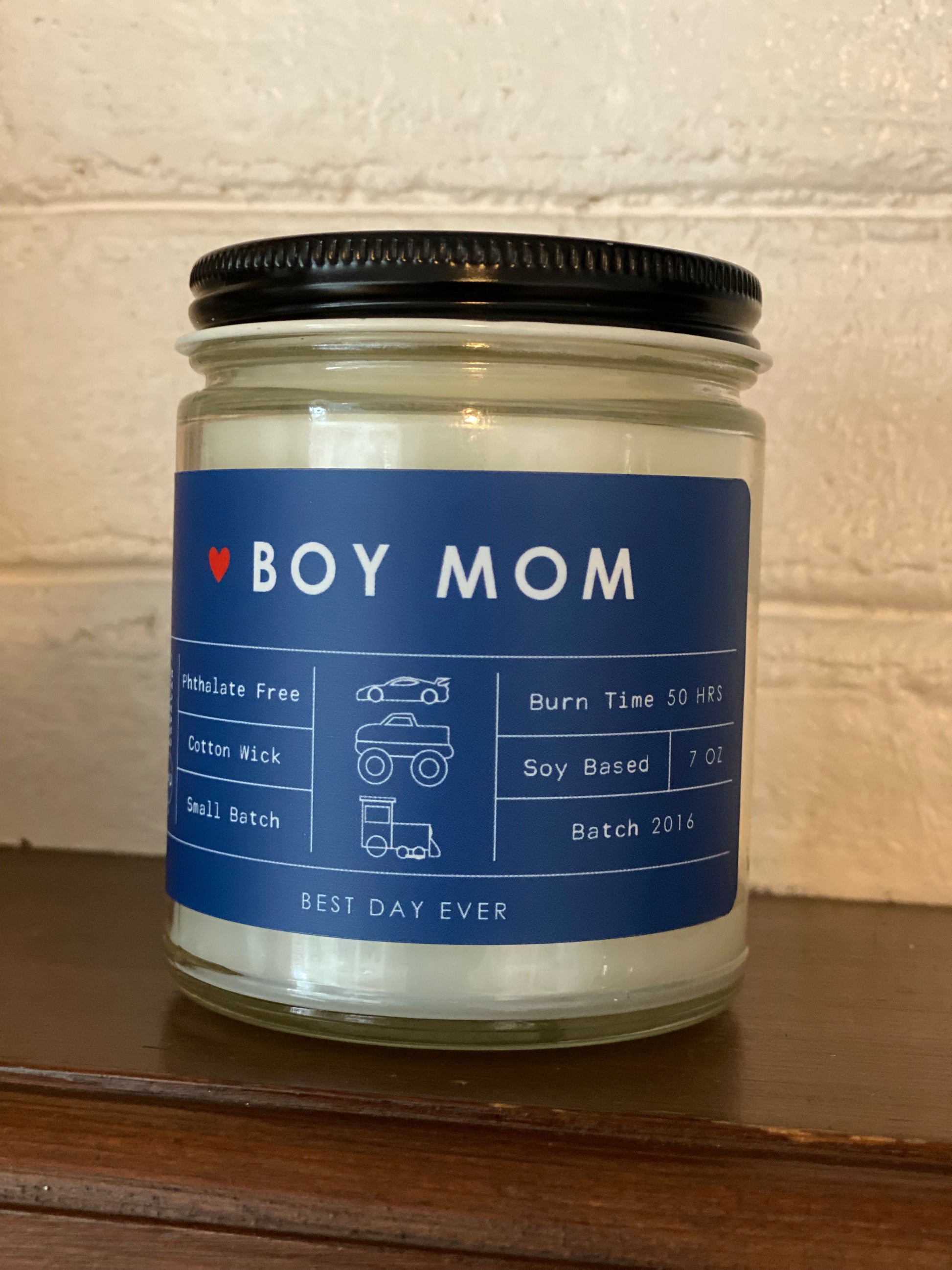Boy Mom Candle - Rambling Caravan candles are inspired by home, travel and adventure. Made from a soy/coconut based wax blend, the candles are hand poured in Virginia Beach, Virginia. We use phthalate free fragrances and have an assortment of fragrances from which to choose. Many of our candles have different color labels to choose from as well. We use cotton wicks with no zinc or lead. We do not use additives, nor scent enhancers or UV blockers. The burn time is approximately 50 hours.