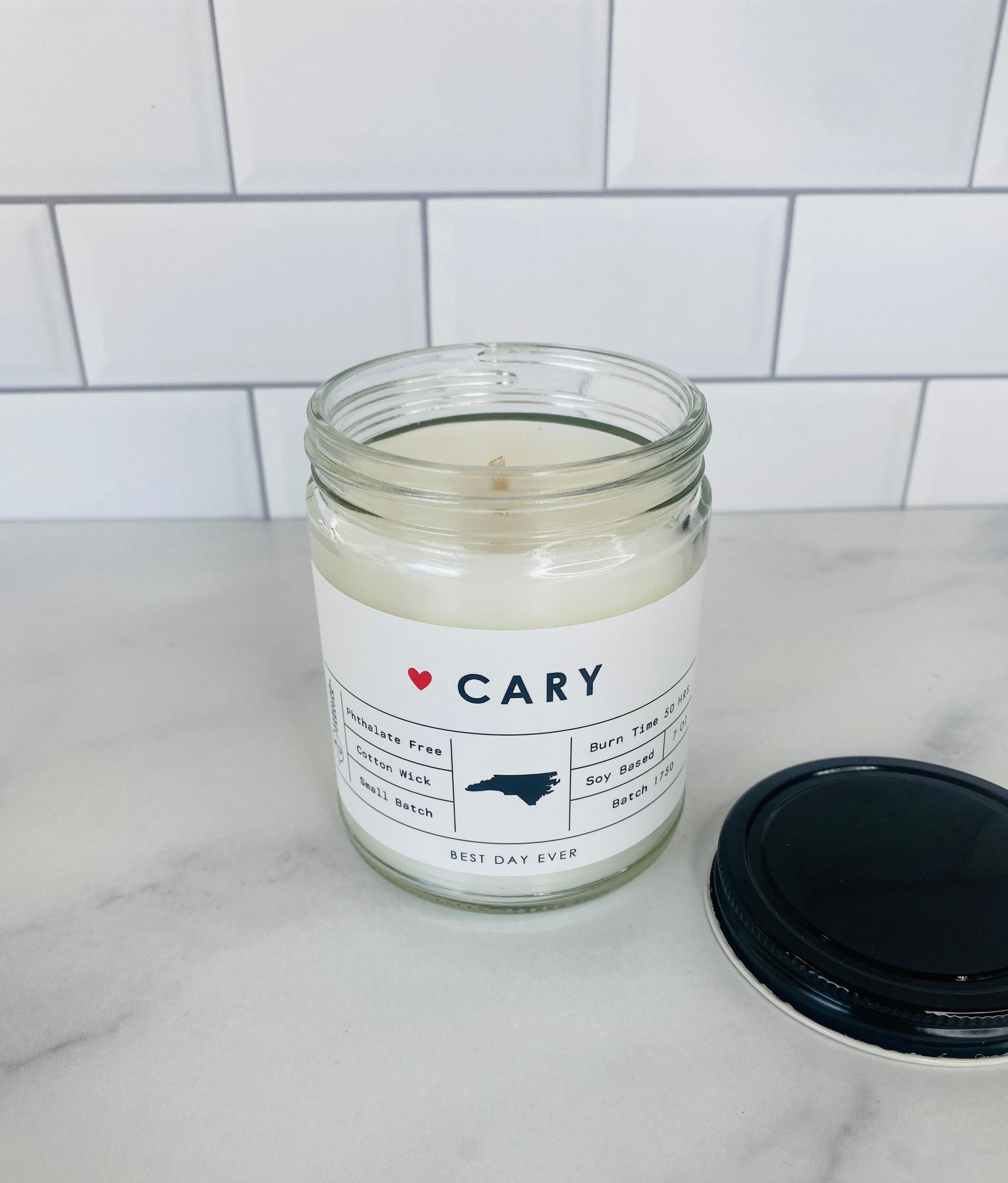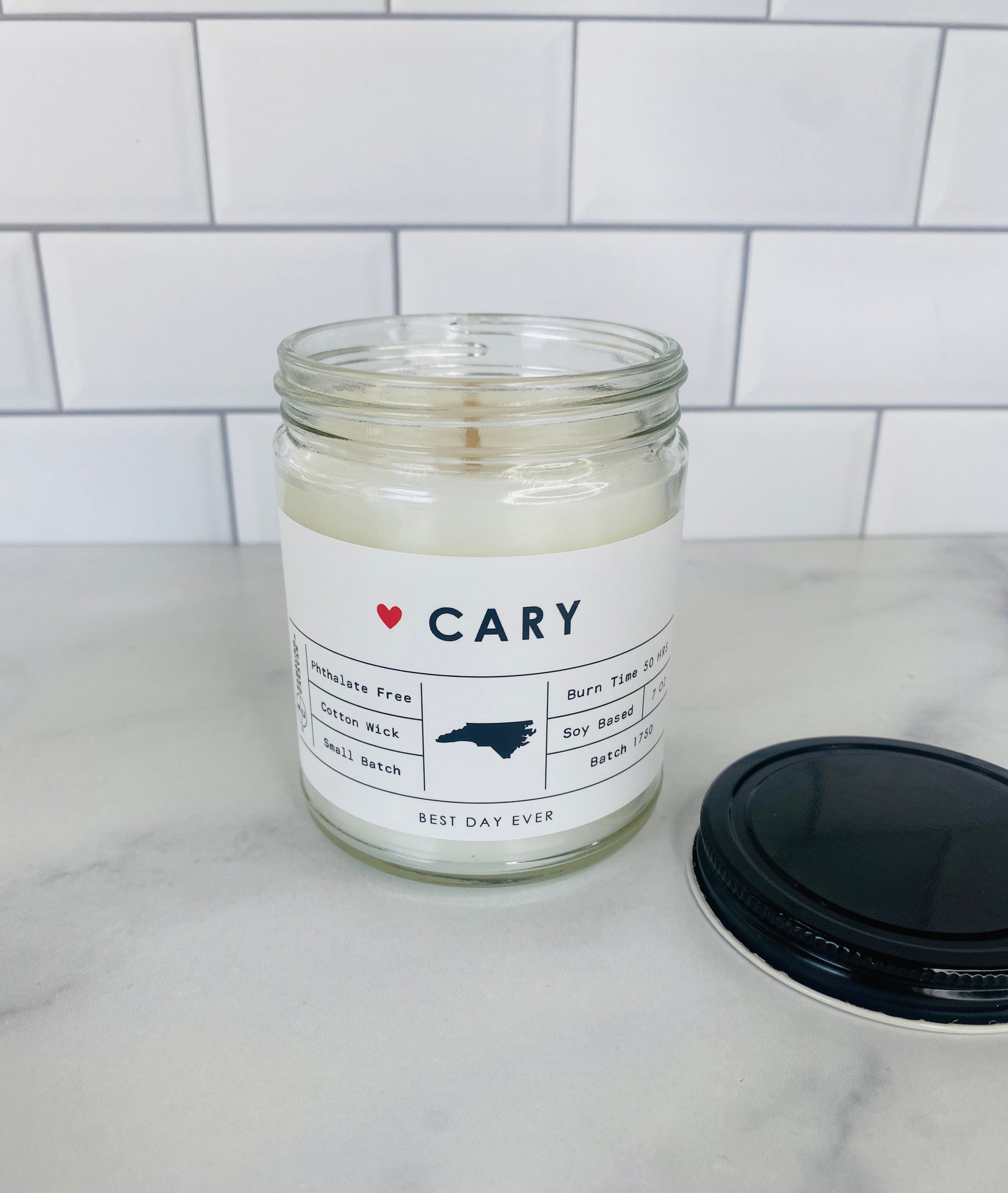 Cary, North Carolina Candle - Rambling Caravan candles are inspired by home, travel and adventure. Made from a soy/coconut based wax blend, the candles are hand poured in Virginia Beach, Virginia. We use phthalate free fragrances and have an assortment of fragrances from which to choose. Many of our candles have different color labels to choose from as well. We use cotton wicks with no zinc or lead. We do not use additives, nor scent enhancers or UV blockers. The burn time is approximately 50 hours.