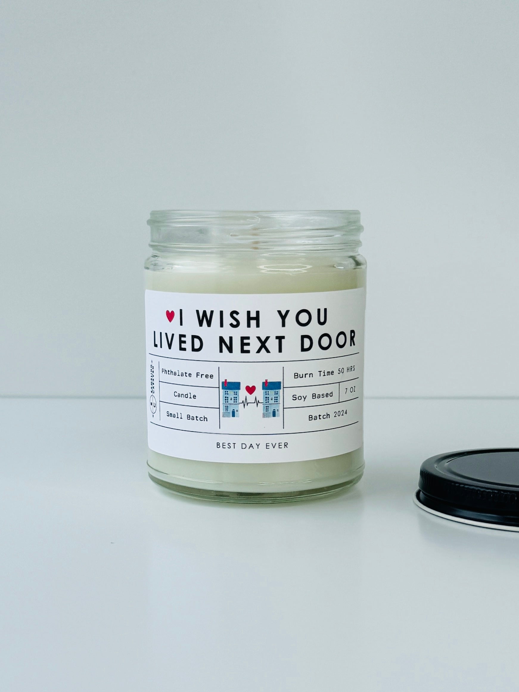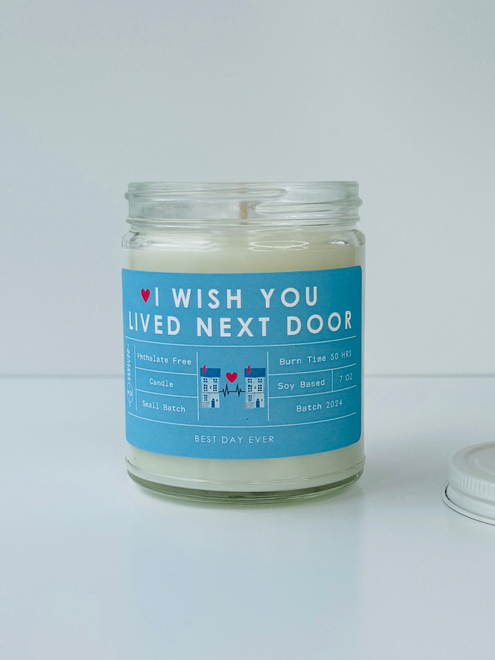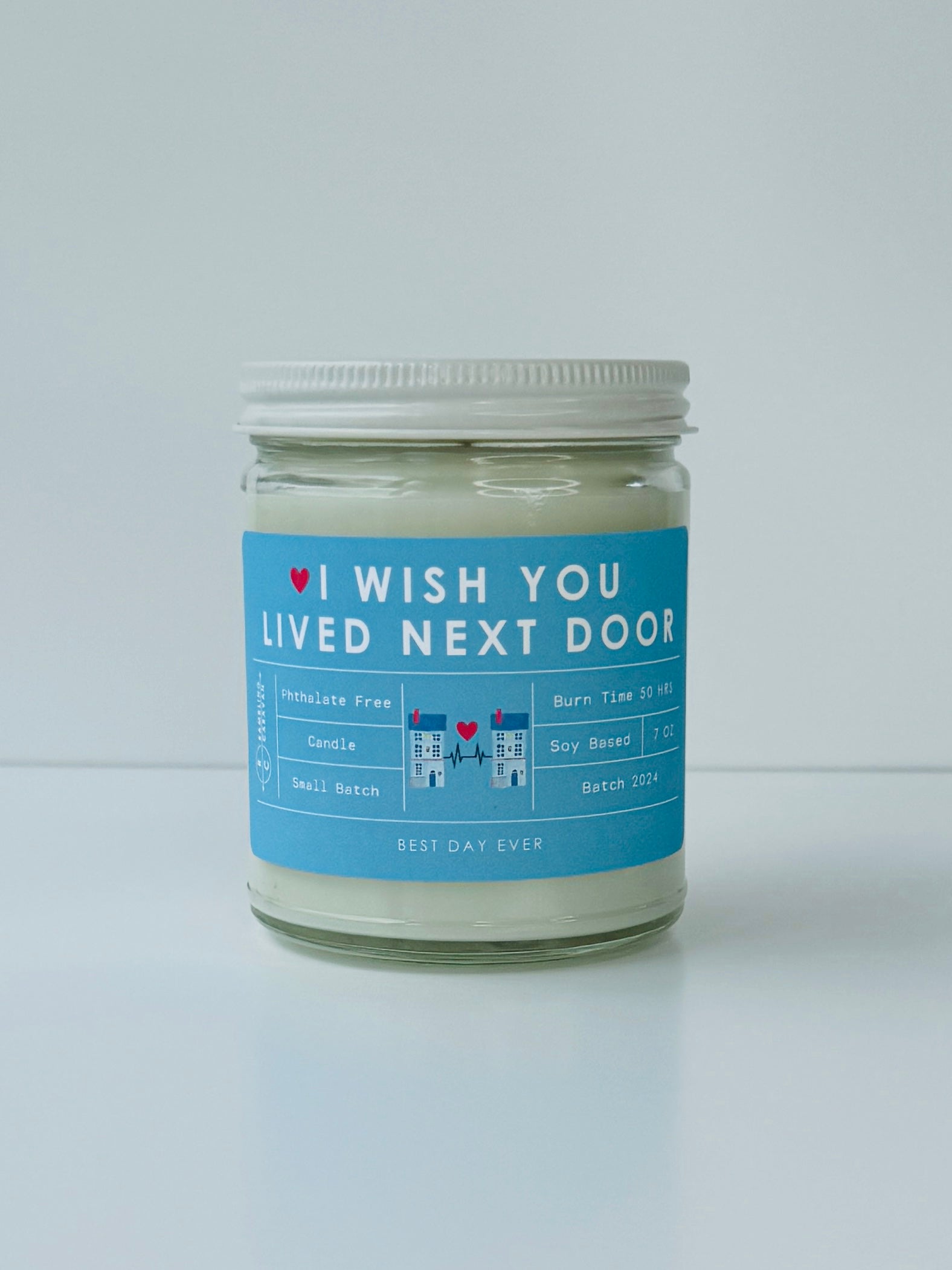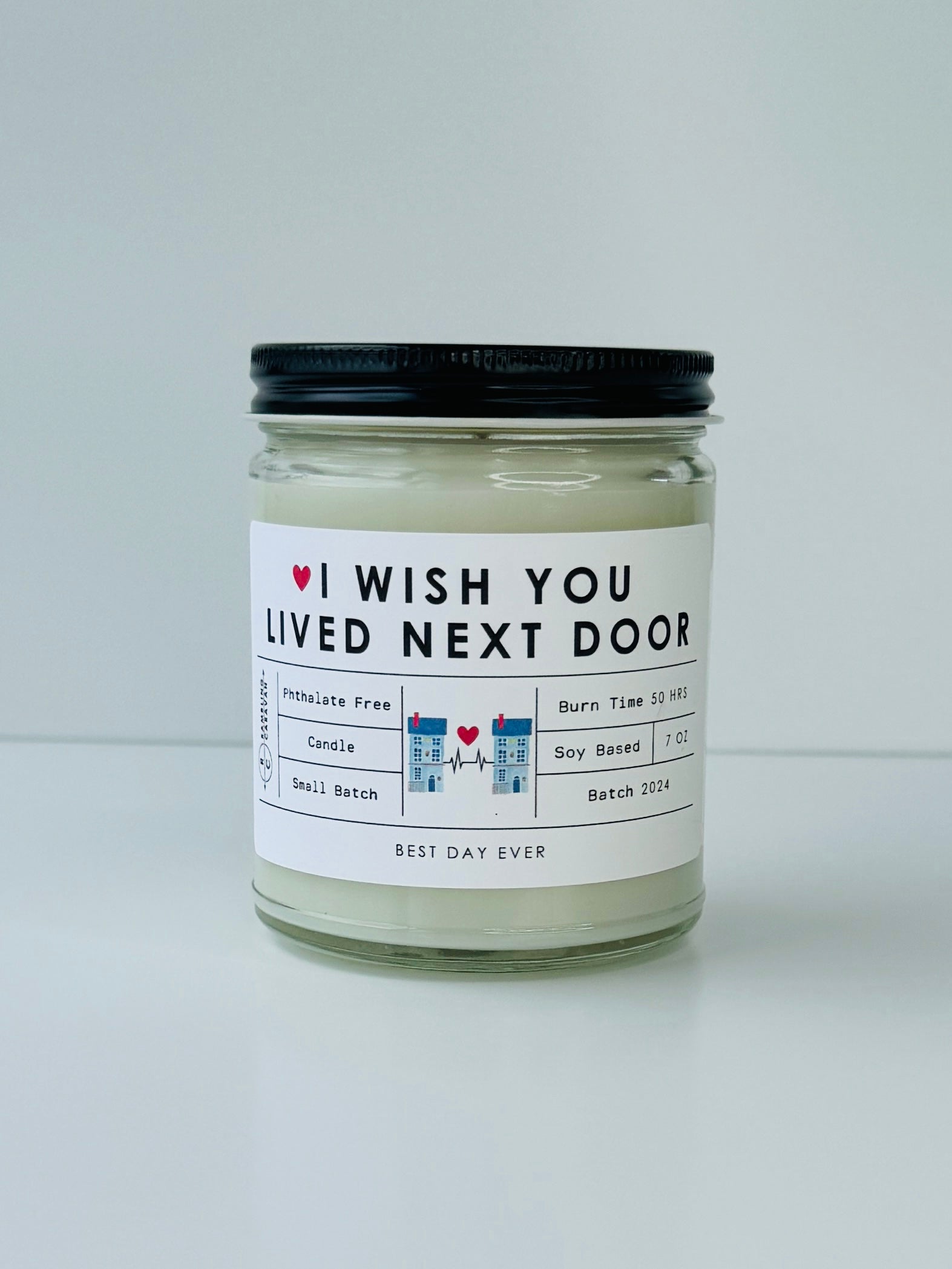 I Wish You Lived Next Door Candle - Rambling Caravan candles are inspired by home, travel and adventure. Made from a soy/coconut based wax blend, the candles are hand poured in Virginia Beach, Virginia. We use phthalate free fragrances and have an assortment of fragrances from which to choose. Many of our candles have different color labels to choose from as well. We use cotton wicks with no zinc or lead. We do not use additives, nor scent enhancers or UV blockers. The burn time is approximately 50 hours.