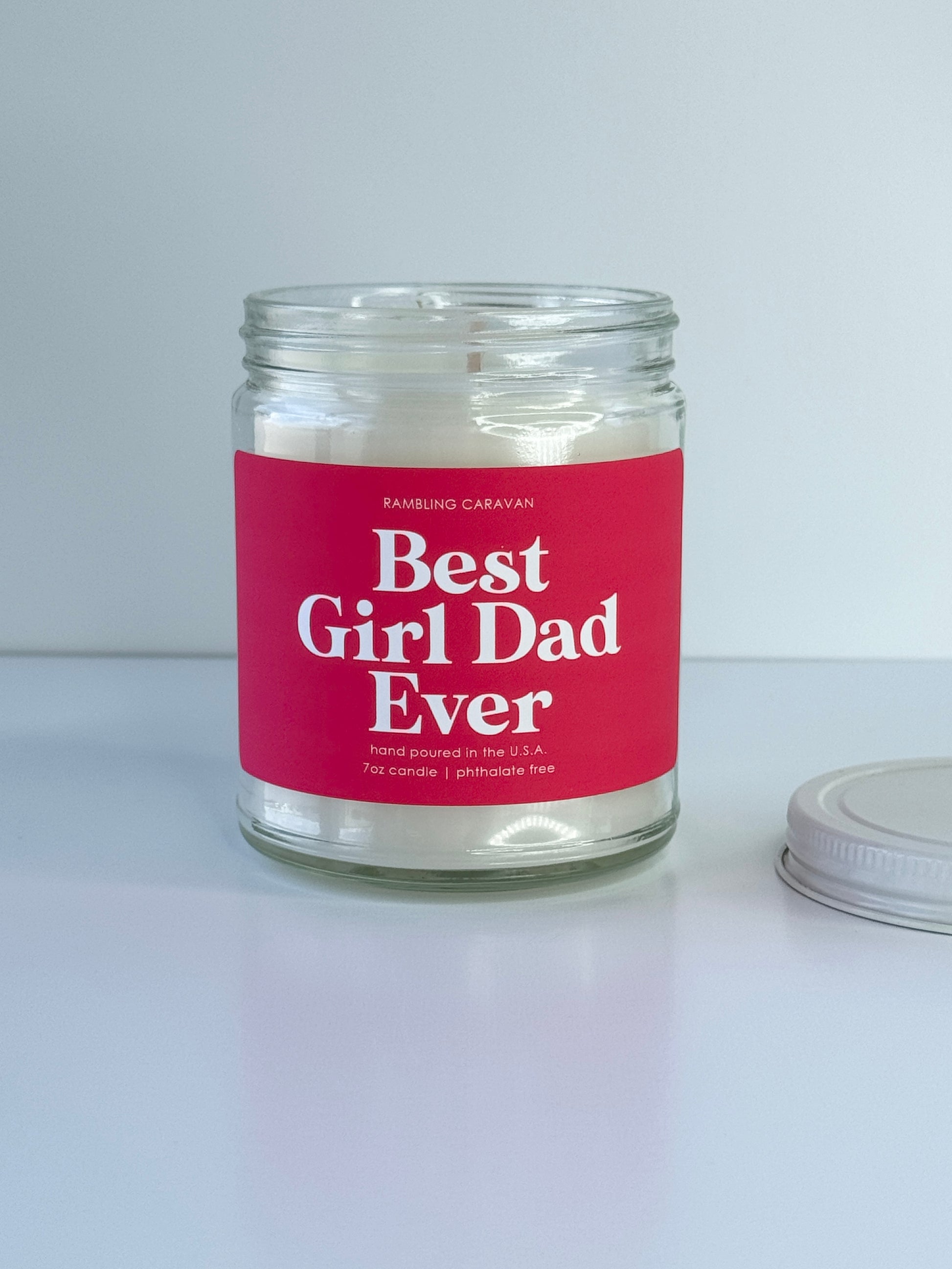 Best Girl Dad Ever Candle - Rambling Caravan candles are inspired by home, travel and adventure. Made from a soy/coconut based wax blend, the candles are hand poured in Virginia Beach, Virginia. We use phthalate free fragrances and have an assortment of fragrances from which to choose. Many of our candles have different color labels to choose from as well. We use cotton wicks with no zinc or lead. We do not use additives, nor scent enhancers or UV blockers. The burn time is approximately 50 hours.
