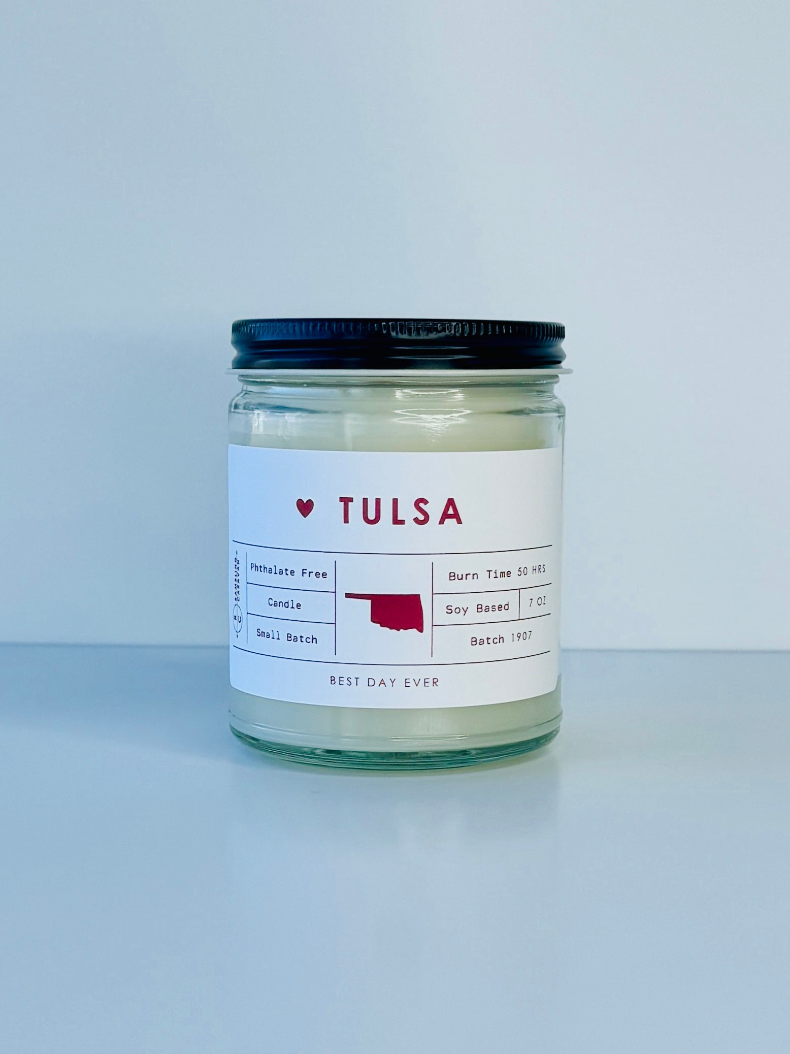 Tulsa, Oklahoma Candle - Rambling Caravan candles are inspired by home, travel and adventure. Made from a soy/coconut based wax blend, the candles are hand poured in Virginia Beach, Virginia. We use phthalate free fragrances and have an assortment of fragrances from which to choose. Many of our candles have different color labels to choose from as well. We use cotton wicks with no zinc or lead. We do not use additives, nor scent enhancers or UV blockers. The burn time is approximately 50 hours.