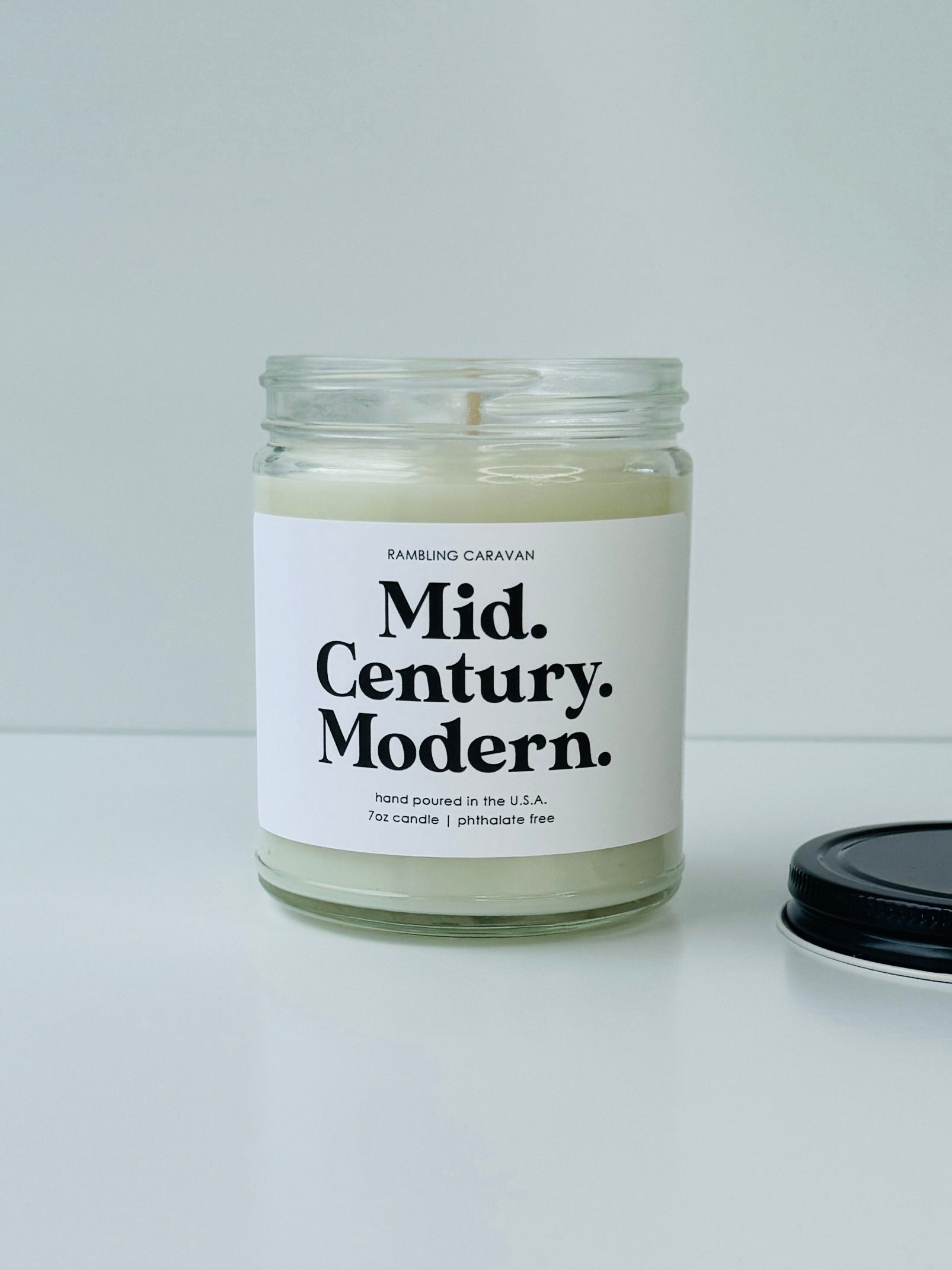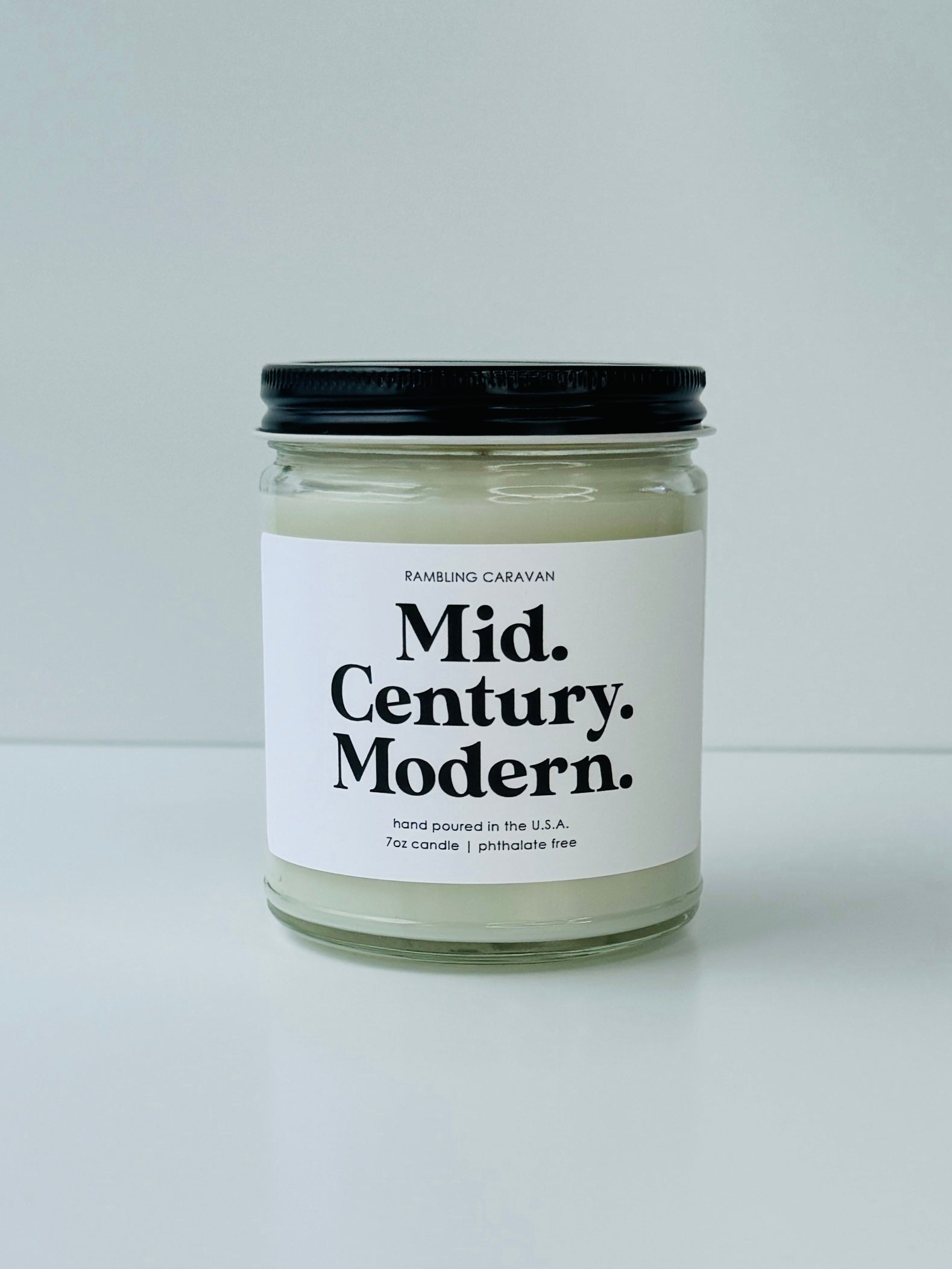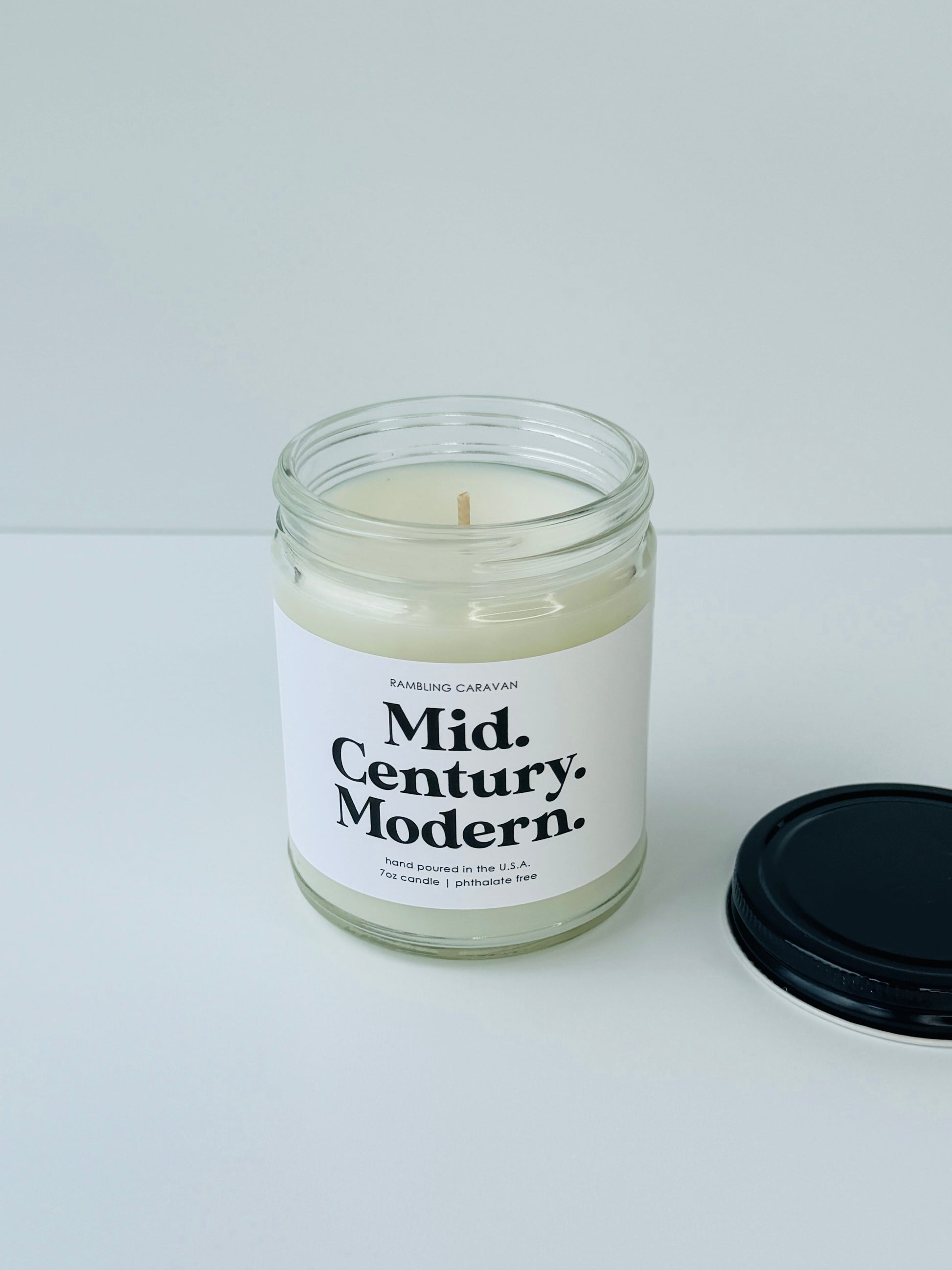Mid. Century. Modern. Candle - Rambling Caravan candles are inspired by home, travel and adventure. Made from a soy/coconut based wax blend, the candles are hand poured in Virginia Beach, Virginia. We use phthalate free fragrances and have an assortment of fragrances from which to choose. Many of our candles have different color labels to choose from as well. We use cotton wicks with no zinc or lead. We do not use additives, nor scent enhancers or UV blockers. The burn time is approximately 50 hours.