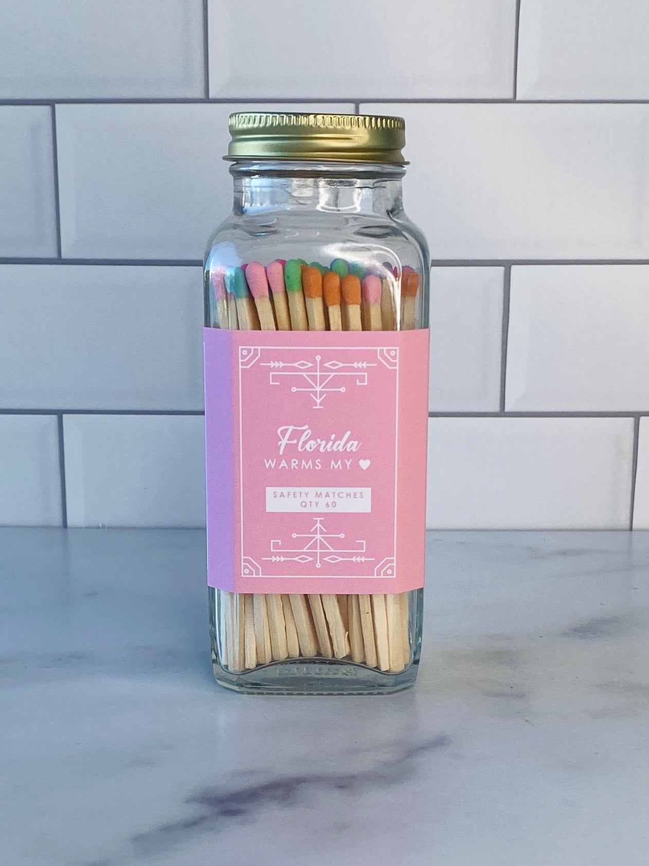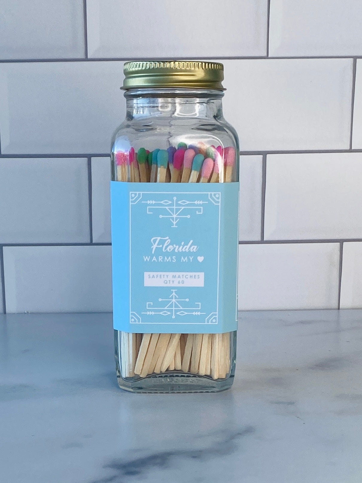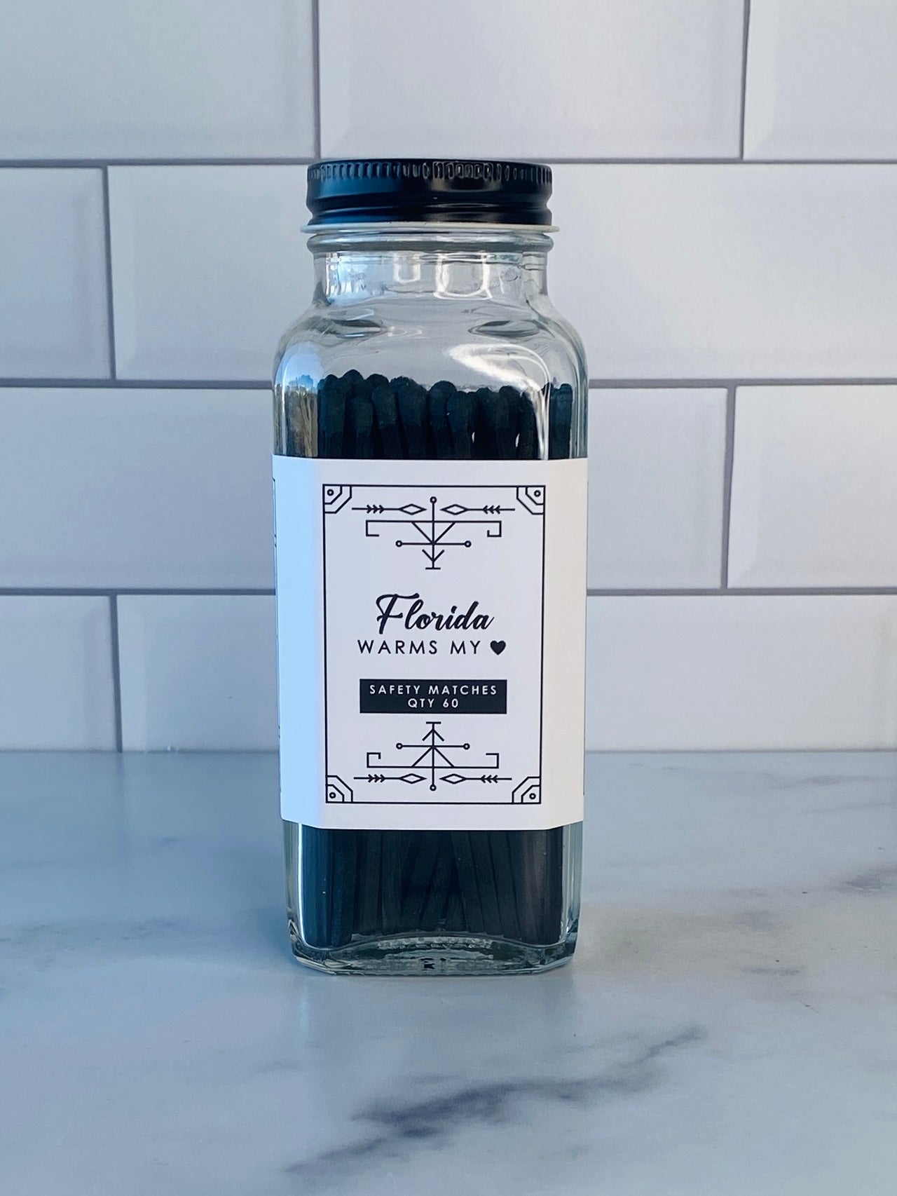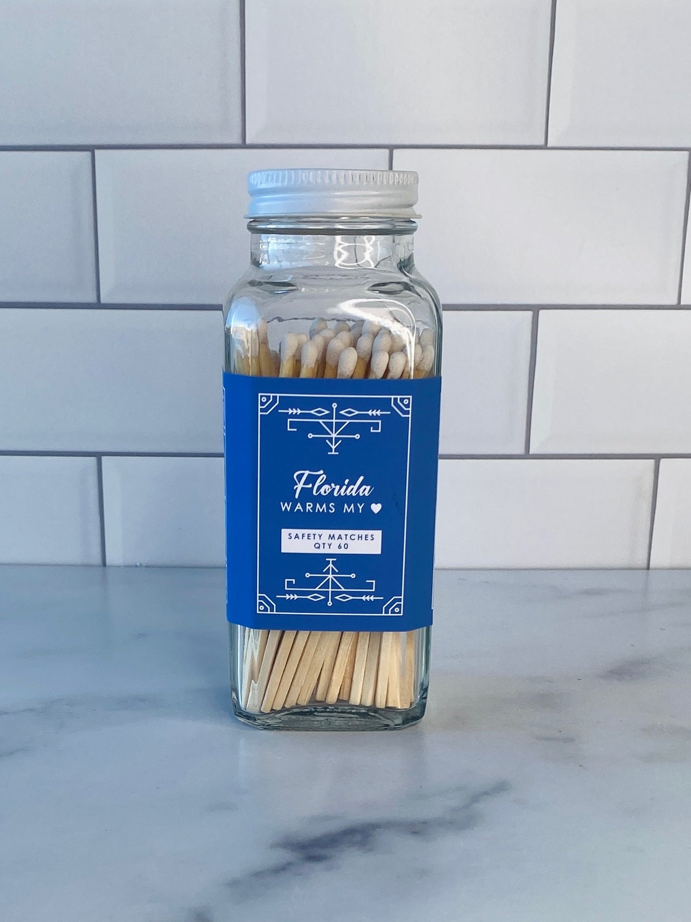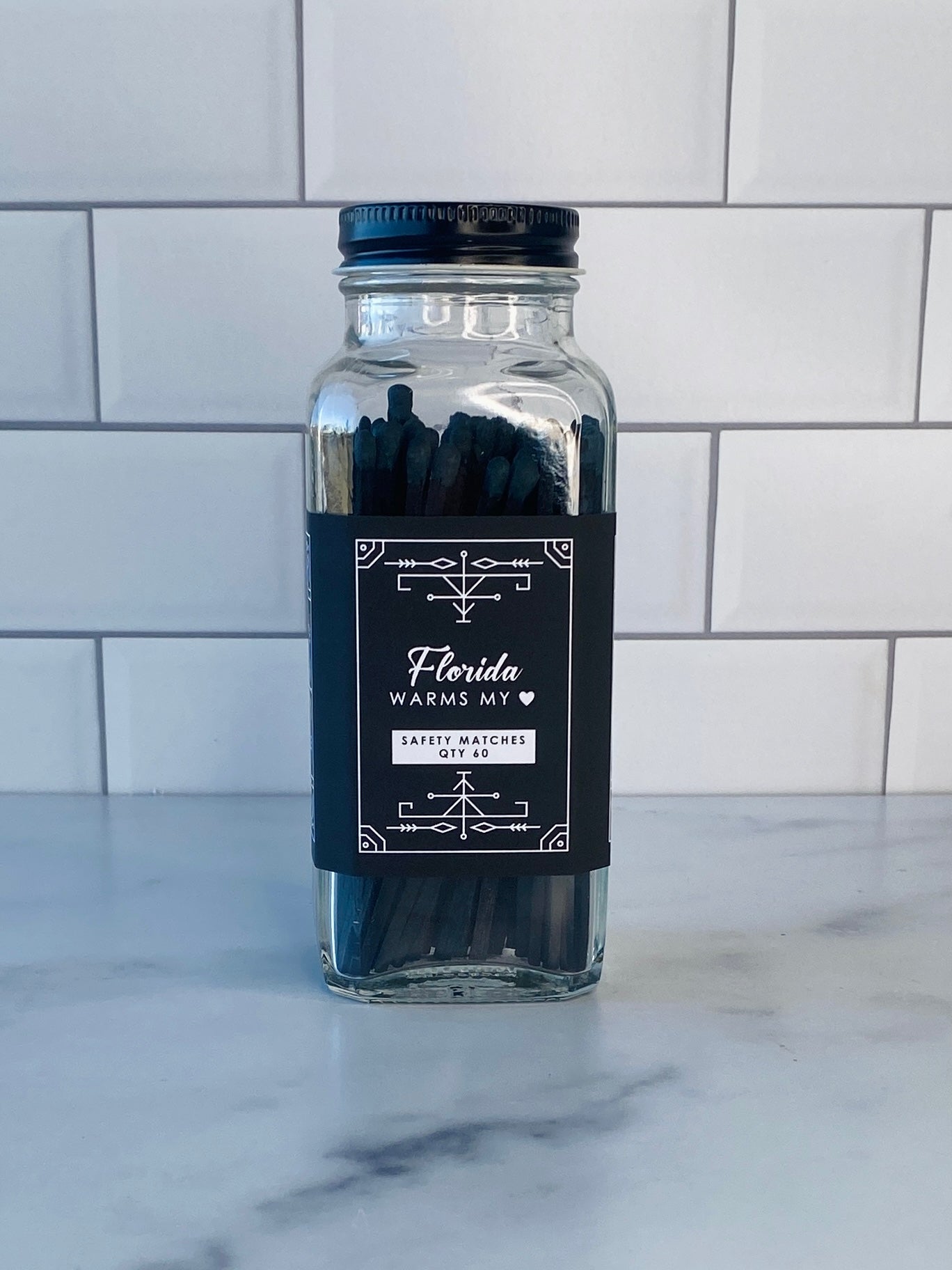 Our stylish safety matches are the perfect gift along side one of our soy coconut wax candles. Each clear jar contains 60 matches with a striker located on the bottom. Be sure to use caution and handle with care. Close the bottle before striking the match. Always keep out of reach of children and pets.