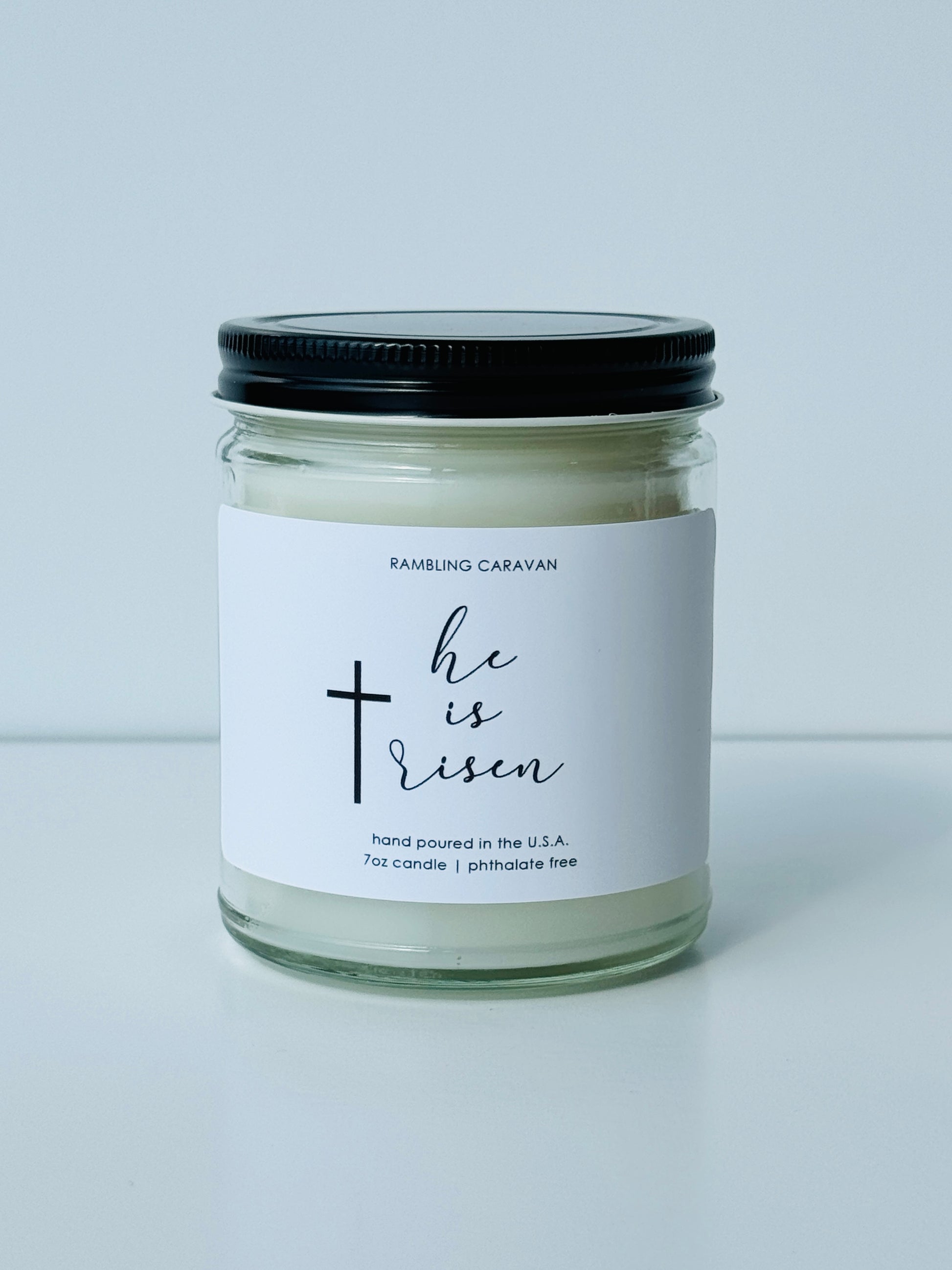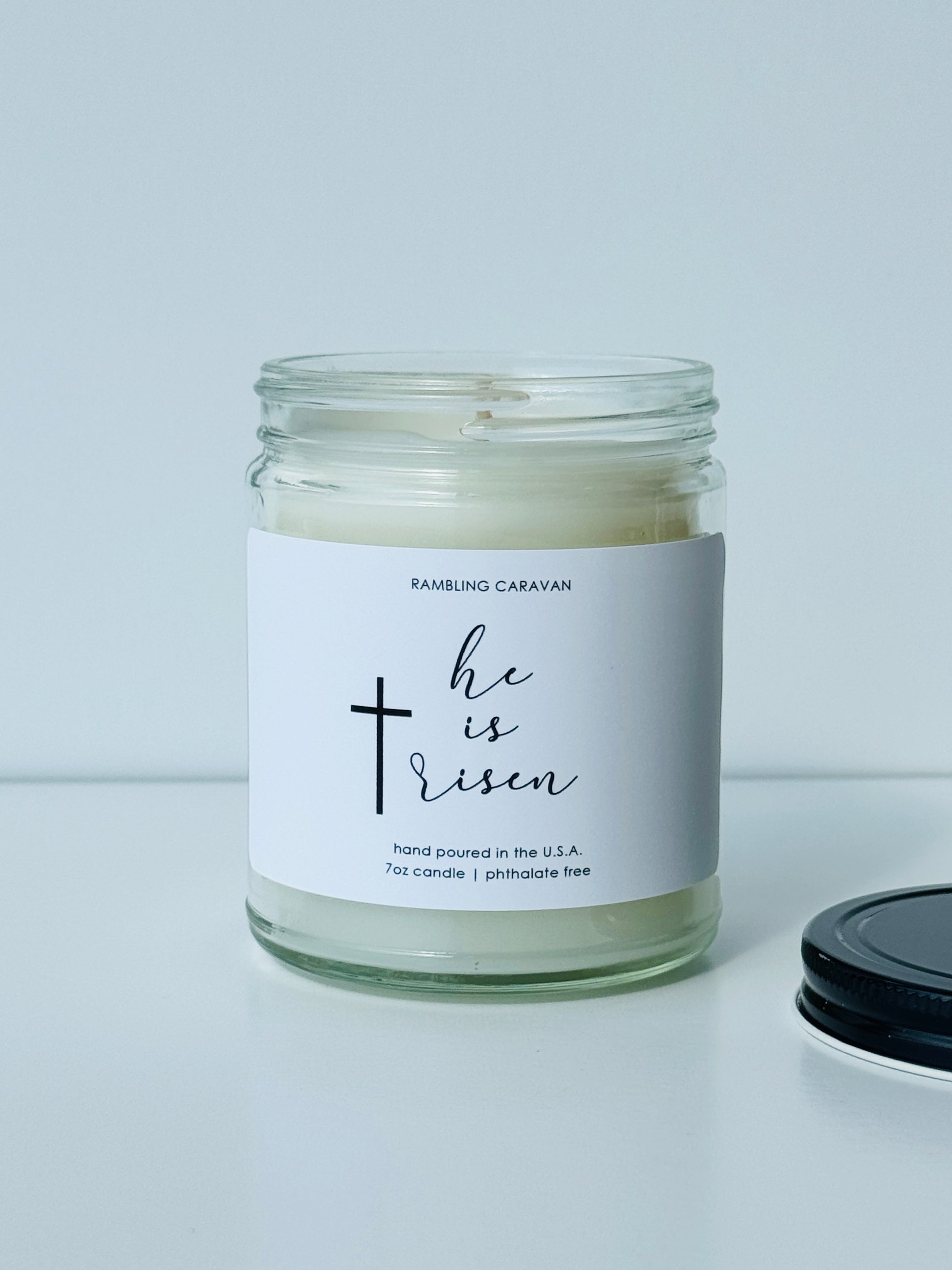 He Is Risen Candle - Rambling Caravan candles are inspired by home, travel and adventure. Made from a soy/coconut based wax blend, the candles are hand poured in Virginia Beach, Virginia. We use phthalate free fragrances and have an assortment of fragrances from which to choose. Many of our candles have different color labels to choose from as well. We use cotton wicks with no zinc or lead. We do not use additives, nor scent enhancers or UV blockers. The burn time is approximately 50 hours.