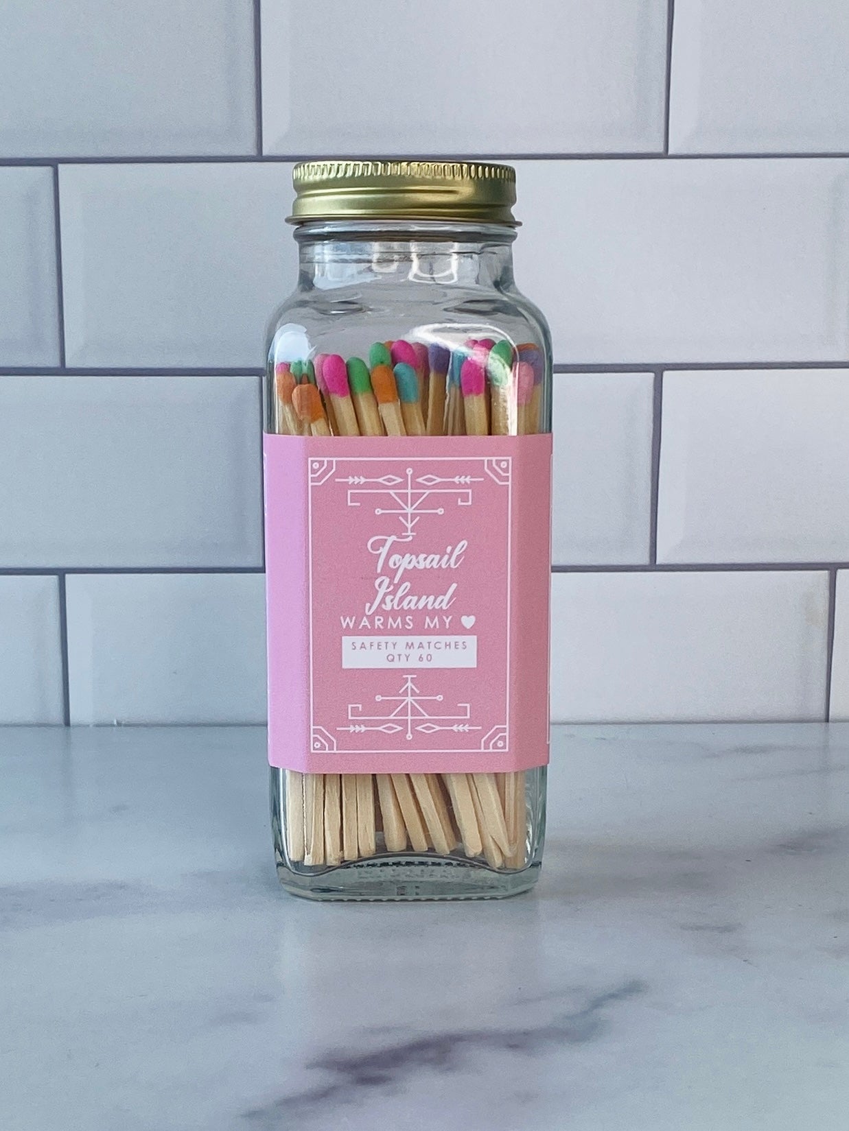 Our stylish safety matches are the perfect gift along side one of our soy coconut wax candles. Each clear jar contains 60 matches with a striker located on the bottom. Be sure to use caution and handle with care. Close the bottle before striking the match. Always keep out of reach of children and pets.