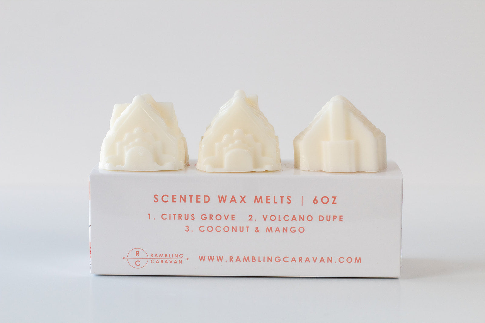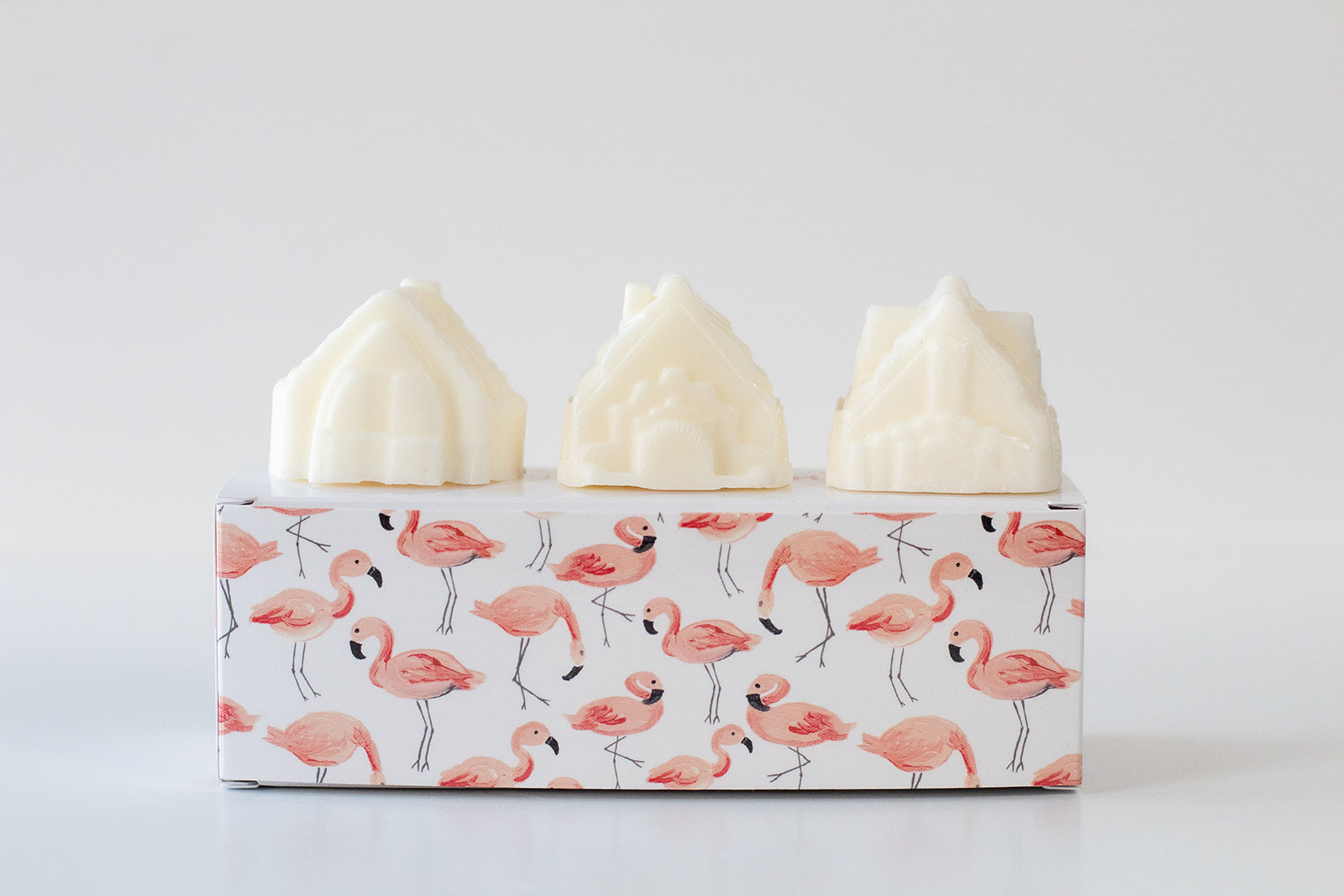 Pink Flamingos is apart of our Home Sweet Home Wax Melt Collection. Pink Flamingos contains 3 scented wax melts in the following fragrances: Citrus Grove, Volcano Dupe and Coconut & Mango. These can be used with tea-light warmers or electric warmers approved for wax melts.