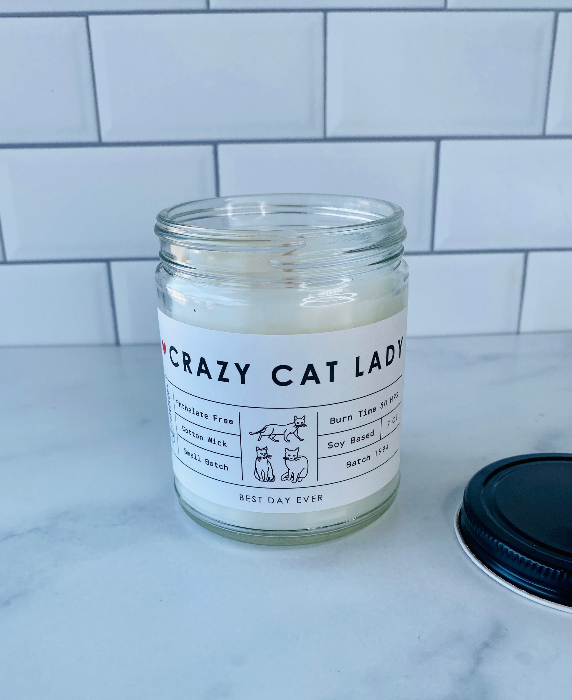 Crazy Cat Lady Candle - This story is so funny! We had the candle "Dog Mom" for so long and women kept asking me where the Cat Mom Candle was. One woman went on and on about how dog people get all the love. Needless to say, I went home and got busy making a label for the Crazy Cat Lady. Ha! - Rambling Caravan candles are inspired by home, travel and adventure. Made from a soy/coconut based wax blend, the candles are hand poured in Virginia Beach, Virginia. We use phthalate free fragrances and have an assortment of fragrances from which to choose. Many of our candles have different color labels to choose from as well. We use cotton wicks with no zinc or lead. We do not use additives, nor scent enhancers or UV blockers. The burn time is approximately 50 hours.