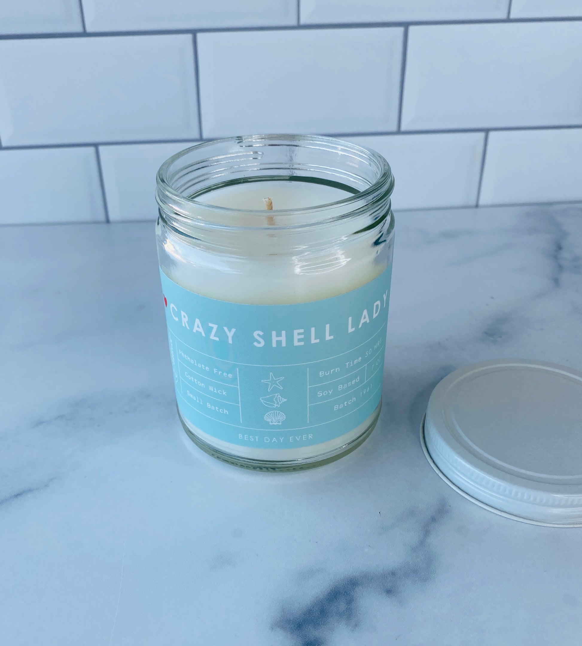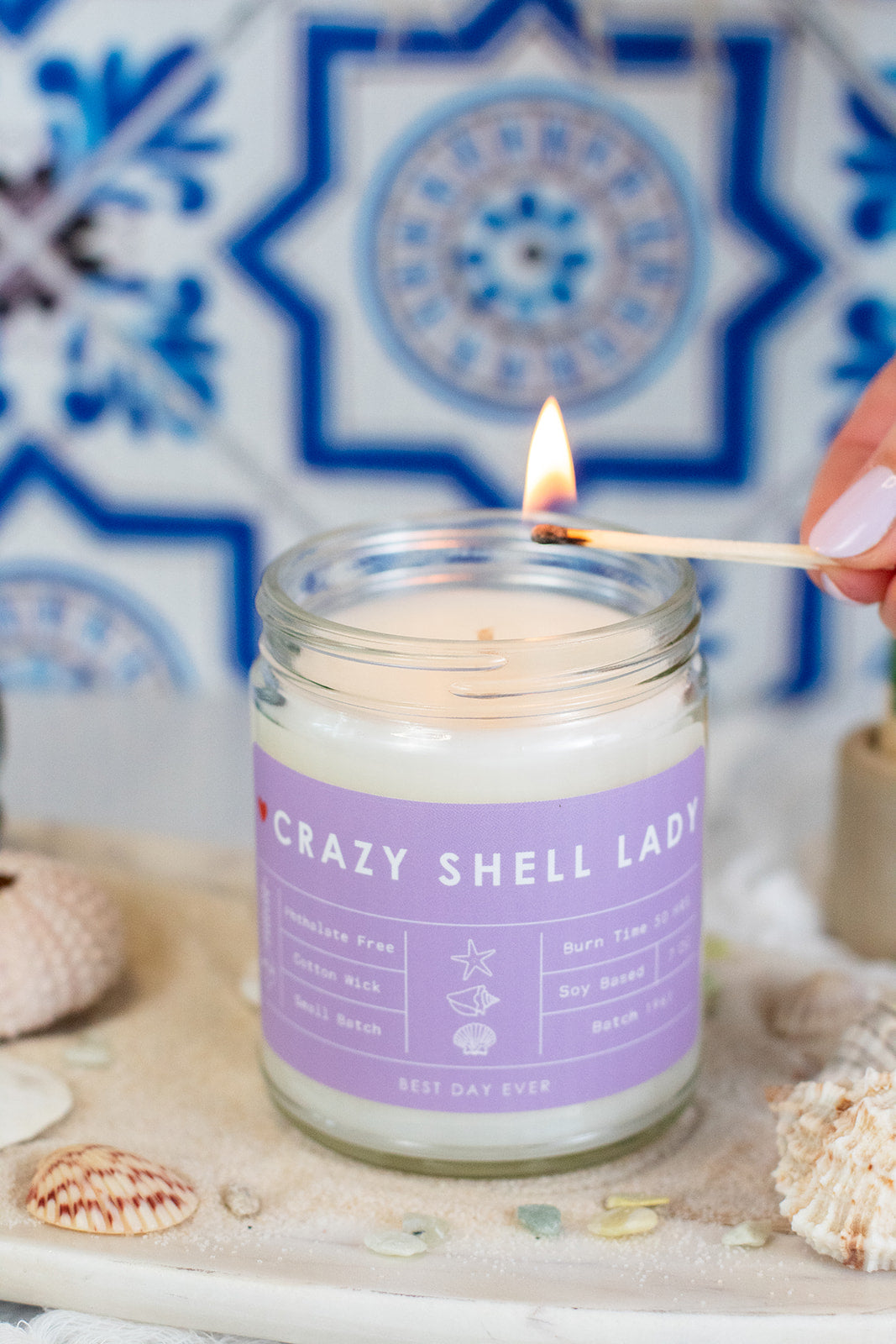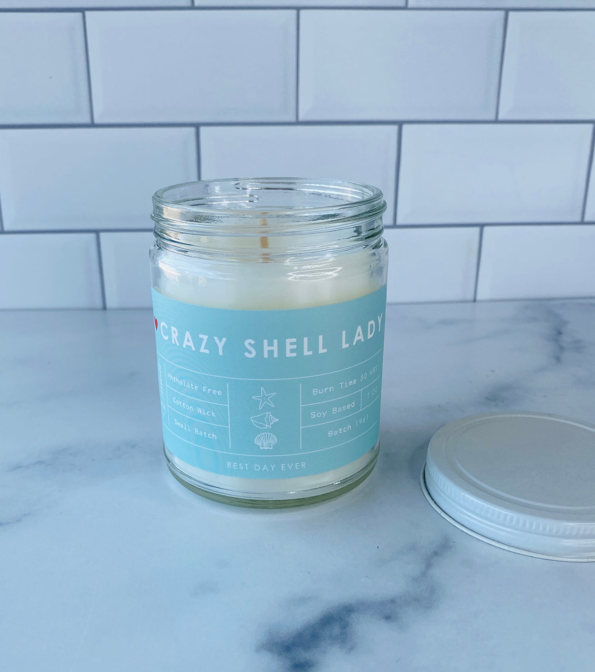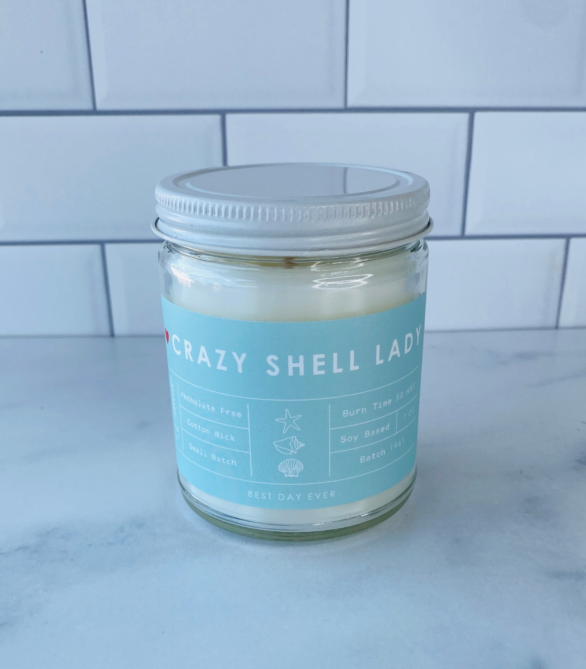Crazy Shell Lady Candle - I love going down to Florida and finding shells and I noticed there are a lot of us women out seeking the best finds. The excitement of the find is awesome. - Rambling Caravan candles are inspired by home, travel and adventure. Made from a soy/coconut based wax blend, the candles are hand poured in Virginia Beach, Virginia. We use phthalate free fragrances and have an assortment of fragrances from which to choose. Many of our candles have different color labels to choose from as well. We use cotton wicks with no zinc or lead. We do not use additives, nor scent enhancers or UV blockers. The burn time is approximately 50 hours.
