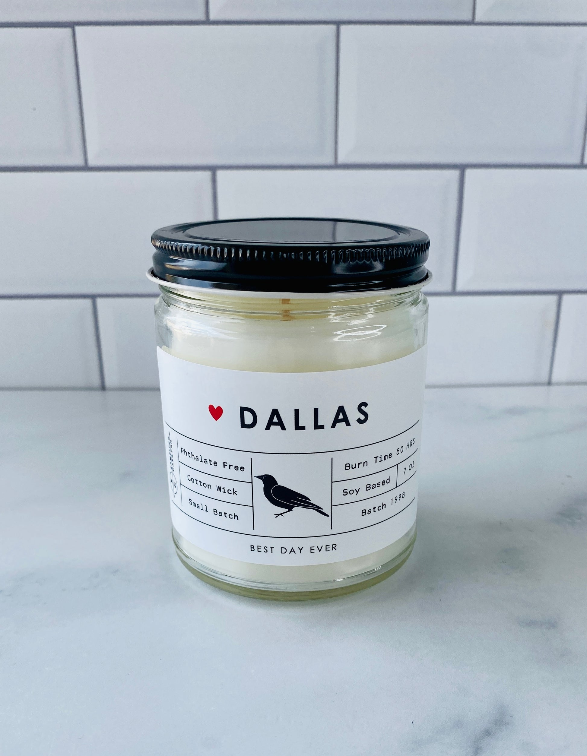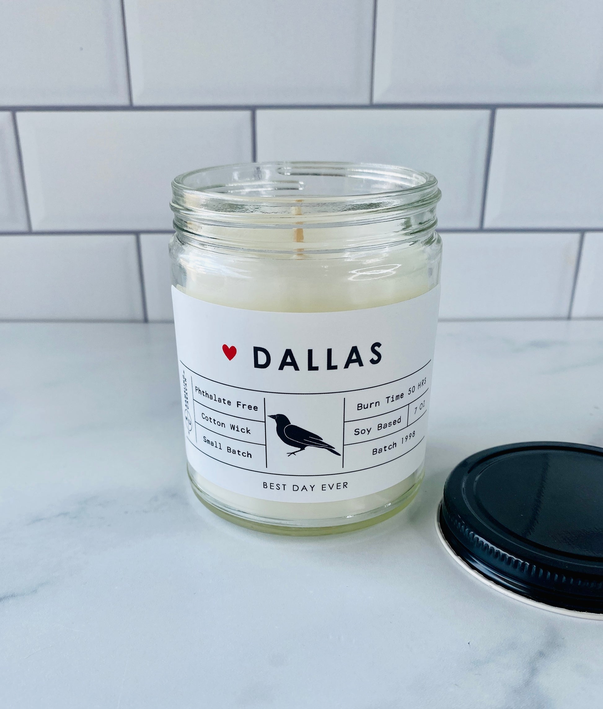 Dallas, Texas Candle - Rambling Caravan candles are inspired by home, travel and adventure. Made from a soy/coconut based wax blend, the candles are hand poured in Virginia Beach, Virginia. We use phthalate free fragrances and have an assortment of fragrances from which to choose. Many of our candles have different color labels to choose from as well. We use cotton wicks with no zinc or lead. We do not use additives, nor scent enhancers or UV blockers. The burn time is approximately 50 hours.
