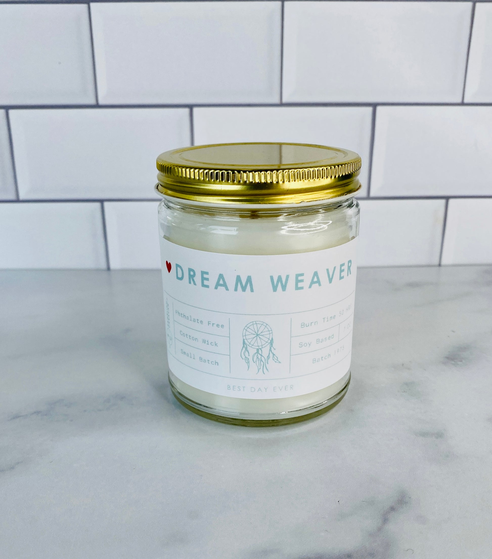Dream Weaver Candle - Rambling Caravan candles are inspired by home, travel and adventure. Made from a soy/coconut based wax blend, the candles are hand poured in Virginia Beach, Virginia. We use phthalate free fragrances and have an assortment of fragrances from which to choose. Many of our candles have different color labels to choose from as well. We use cotton wicks with no zinc or lead. We do not use additives, nor scent enhancers or UV blockers. The burn time is approximately 50 hours.