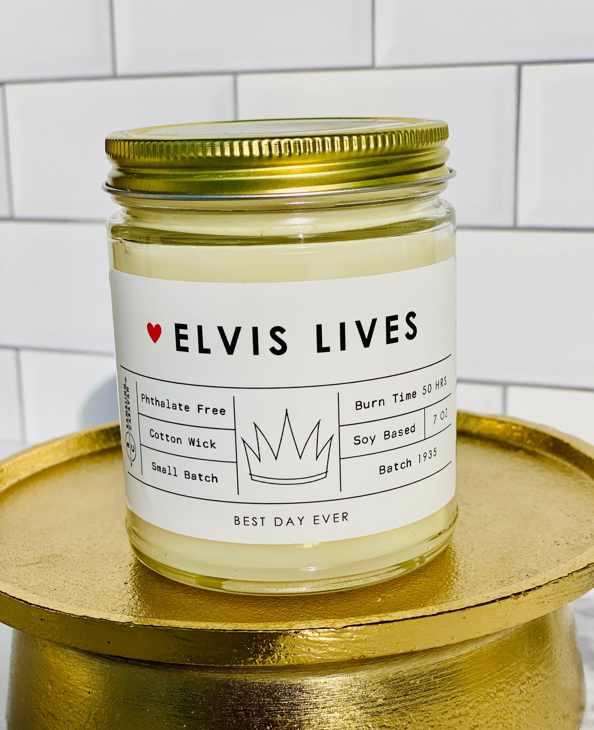 Elvis Lives Candle - Rambling Caravan candles are inspired by home, travel and adventure. Made from a soy/coconut based wax blend, the candles are hand poured in Virginia Beach, Virginia. We use phthalate free fragrances and have an assortment of fragrances from which to choose. Many of our candles have different color labels to choose from as well. We use cotton wicks with no zinc or lead. We do not use additives, nor scent enhancers or UV blockers. The burn time is approximately 50 hours.