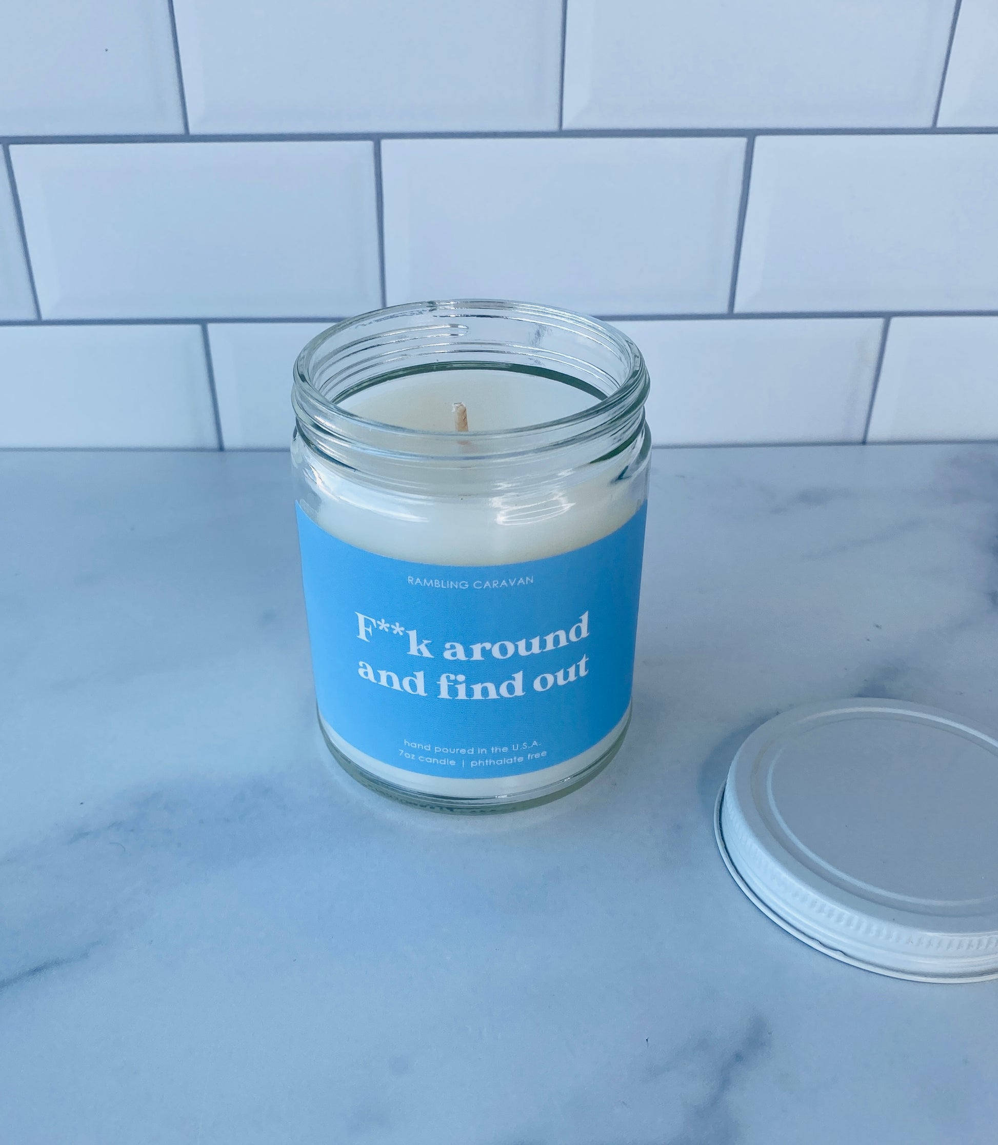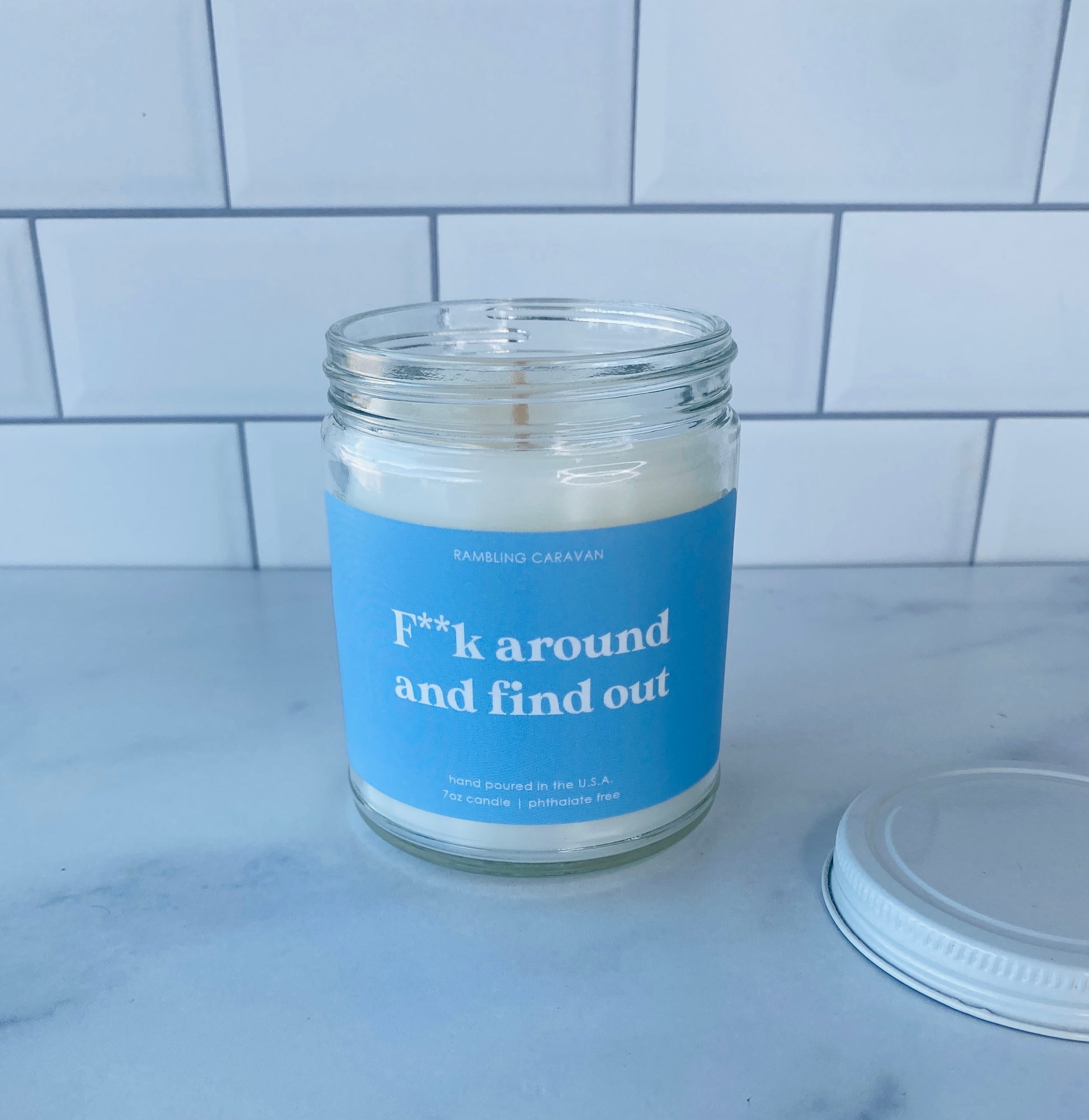 F**k around and find out Candle - Rambling Caravan candles are inspired by home, travel and adventure. Made from a soy/coconut based wax blend, the candles are hand poured in Virginia Beach, Virginia. We use phthalate free fragrances and have an assortment of fragrances from which to choose. Many of our candles have different color labels to choose from as well. We use cotton wicks with no zinc or lead. We do not use additives, nor scent enhancers or UV blockers. The burn time is approximately 50 hours.