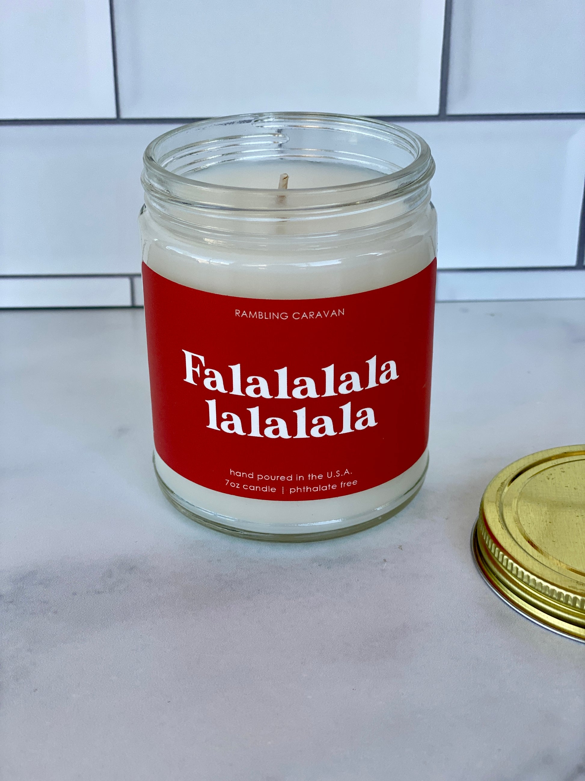 Falalalala-lalalala Candle - Rambling Caravan candles are inspired by home, travel and adventure. Made from a soy/coconut based wax blend, the candles are hand poured in Virginia Beach, Virginia. We use phthalate free fragrances and have an assortment of fragrances from which to choose. Many of our candles have different color labels to choose from as well. We use cotton wicks with no zinc or lead. We do not use additives, nor scent enhancers or UV blockers. The burn time is approximately 50 hours.