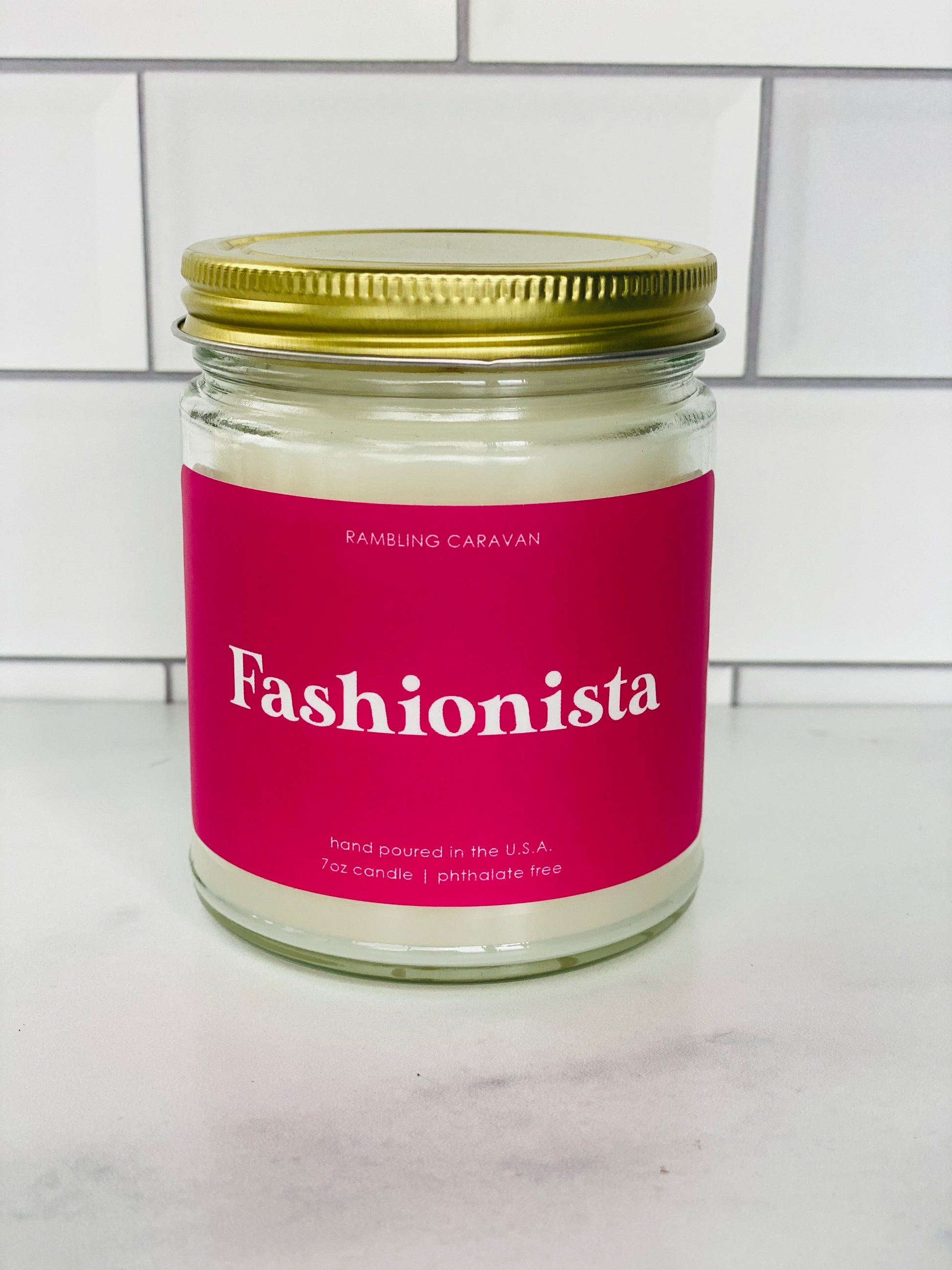 Fashionista Candle - Rambling Caravan candles are inspired by home, travel and adventure. Made from a soy/coconut based wax blend, the candles are hand poured in Virginia Beach, Virginia. We use phthalate free fragrances and have an assortment of fragrances from which to choose. Many of our candles have different color labels to choose from as well. We use cotton wicks with no zinc or lead. We do not use additives, nor scent enhancers or UV blockers. The burn time is approximately 50 hours.