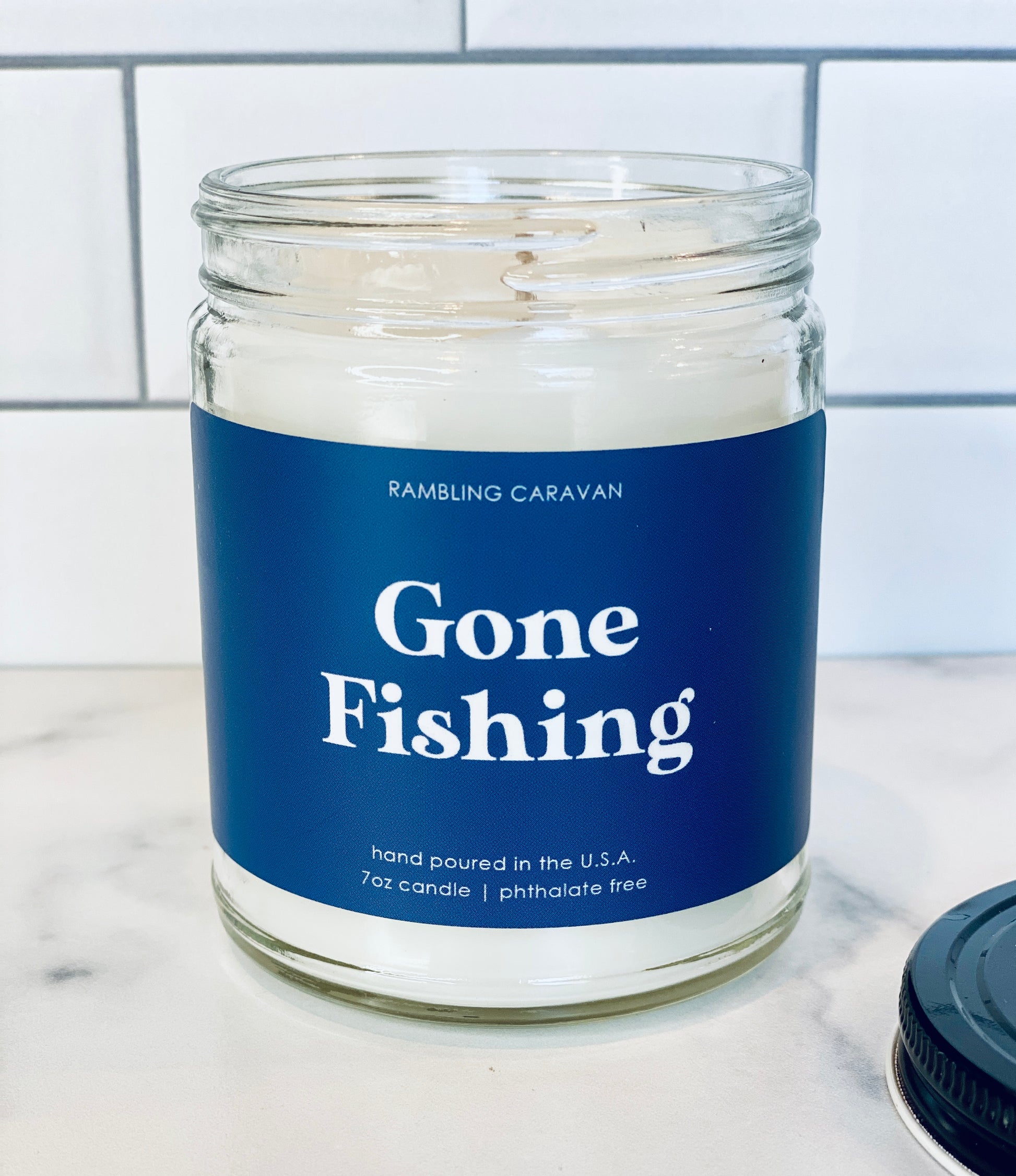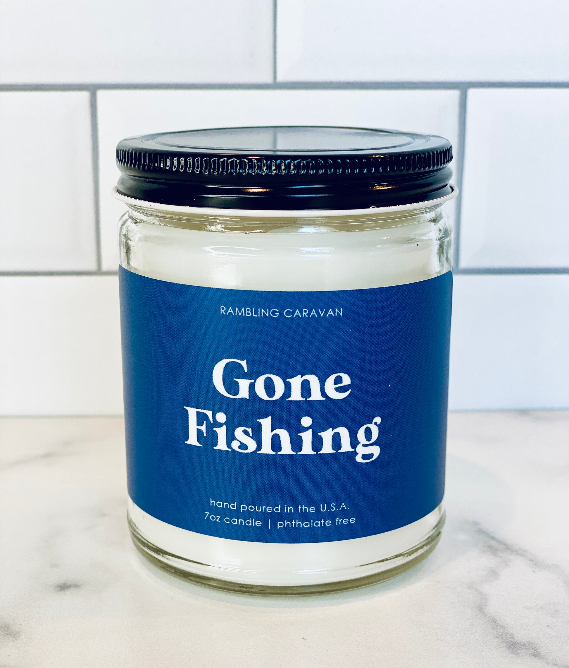 Gone Fishing Candle - Rambling Caravan candles are inspired by home, travel and adventure. Made from a soy/coconut based wax blend, the candles are hand poured in Virginia Beach, Virginia. We use phthalate free fragrances and have an assortment of fragrances from which to choose. Many of our candles have different color labels to choose from as well. We use cotton wicks with no zinc or lead. We do not use additives, nor scent enhancers or UV blockers. The burn time is approximately 50 hours.