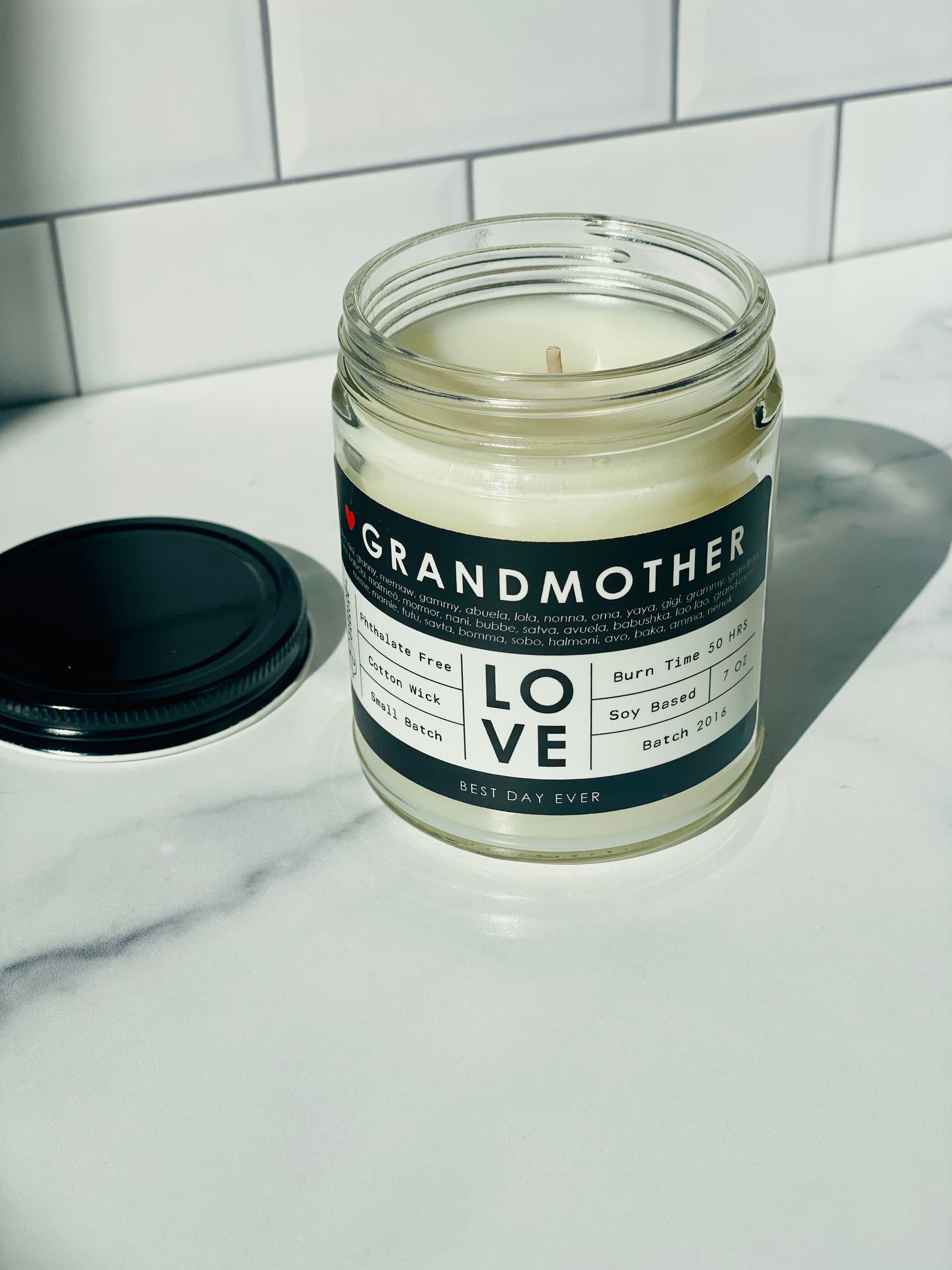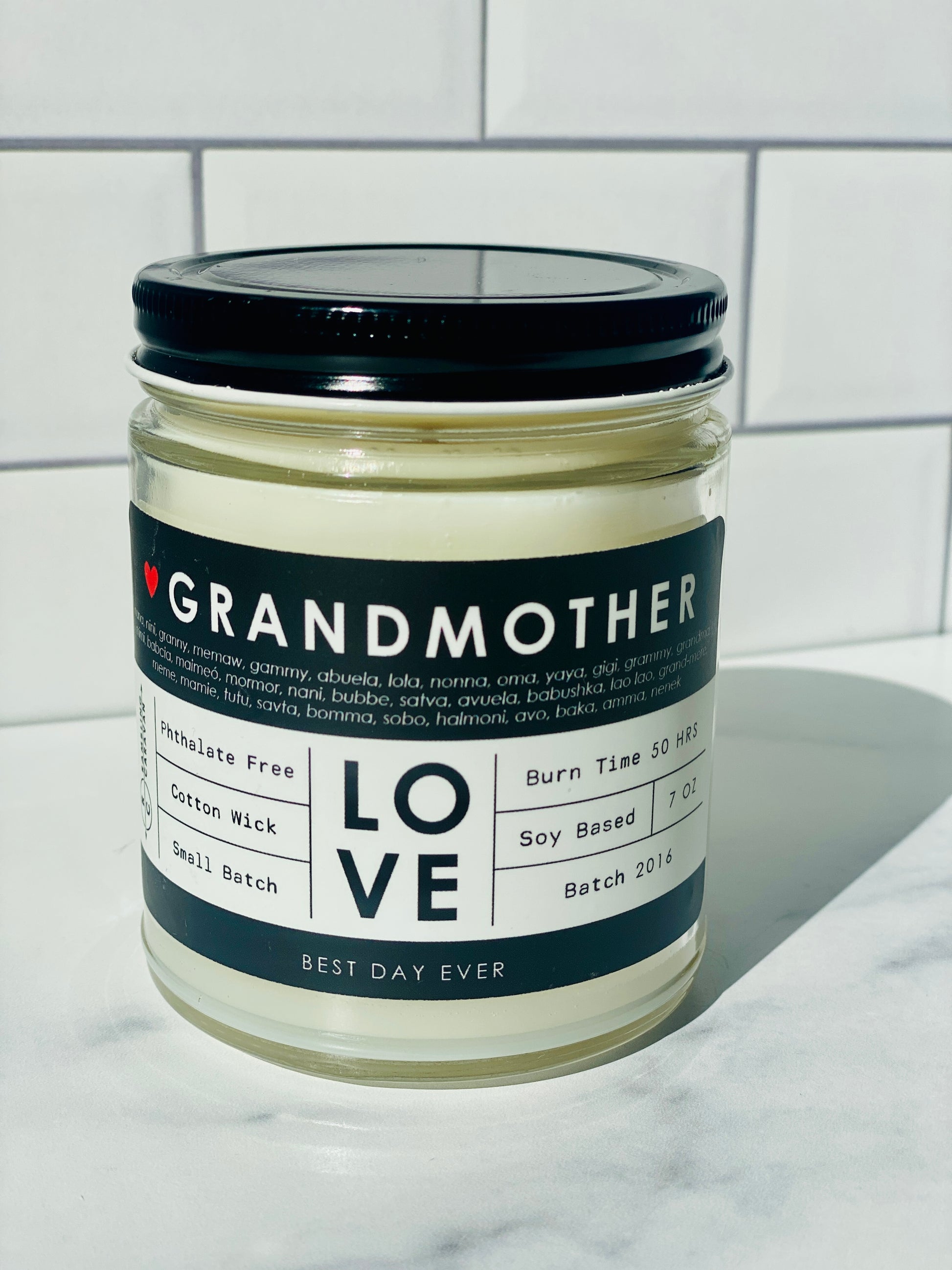 Grandmother Candle - Rambling Caravan candles are inspired by home, travel and adventure. Made from a soy/coconut based wax blend, the candles are hand poured in Virginia Beach, Virginia. We use phthalate free fragrances and have an assortment of fragrances from which to choose. Many of our candles have different color labels to choose from as well. We use cotton wicks with no zinc or lead. We do not use additives, nor scent enhancers or UV blockers. The burn time is approximately 50 hours.