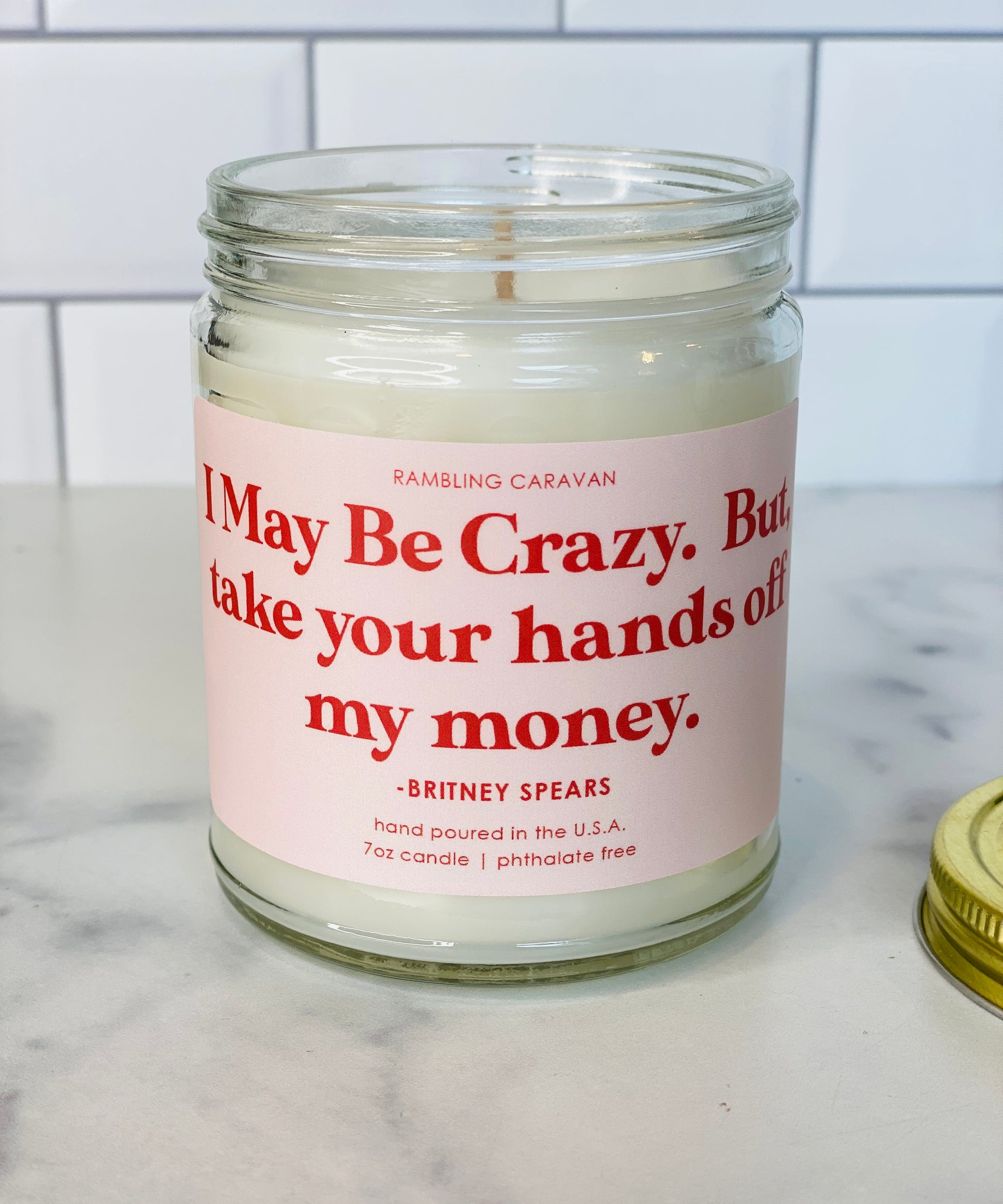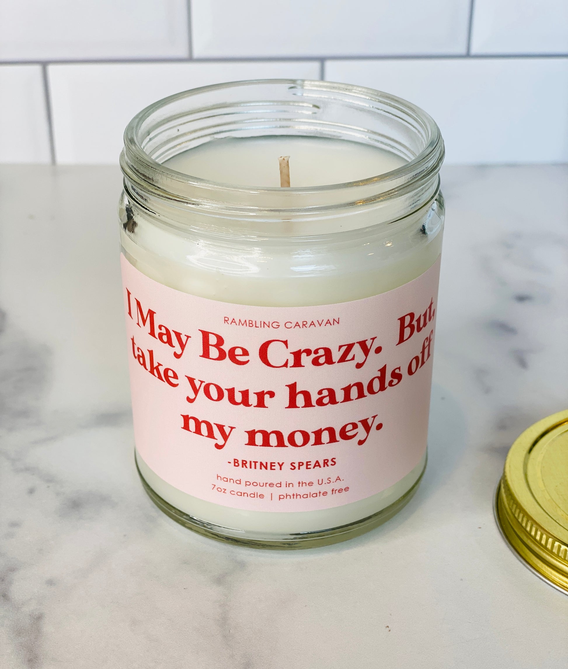I May Be Crazy. But, take your hands off my money Candle - Rambling Caravan candles are inspired by home, travel and adventure. Made from a soy/coconut based wax blend, the candles are hand poured in Virginia Beach, Virginia. We use phthalate free fragrances and have an assortment of fragrances from which to choose. Many of our candles have different color labels to choose from as well. We use cotton wicks with no zinc or lead. We do not use additives, nor scent enhancers or UV blockers. The burn time is approximately 50 hours.