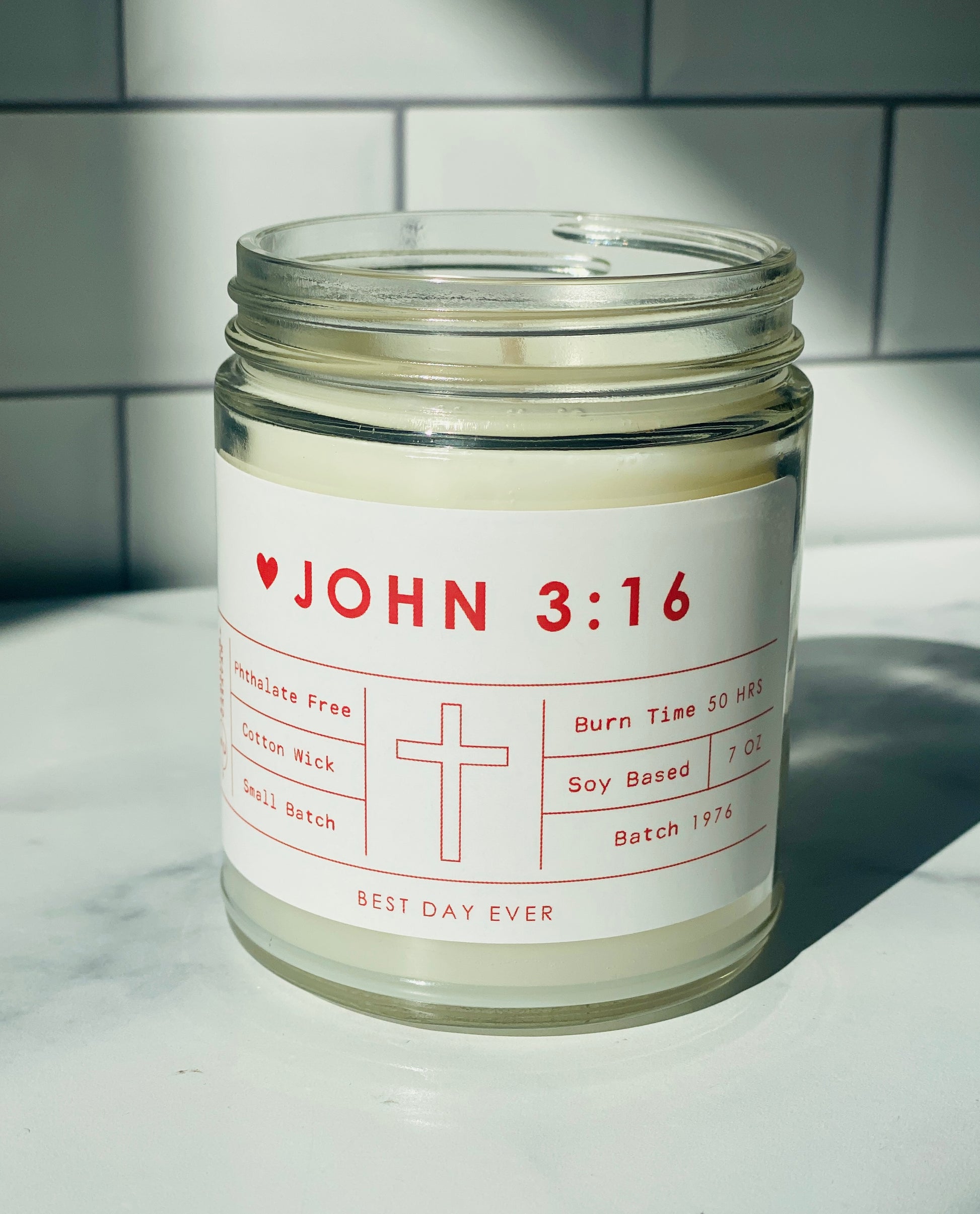 John 3:16 Candle - Rambling Caravan candles are inspired by home, travel and adventure. Made from a soy/coconut based wax blend, the candles are hand poured in Virginia Beach, Virginia. We use phthalate free fragrances and have an assortment of fragrances from which to choose. Many of our candles have different color labels to choose from as well. We use cotton wicks with no zinc or lead. We do not use additives, nor scent enhancers or UV blockers. The burn time is approximately 50 hours.