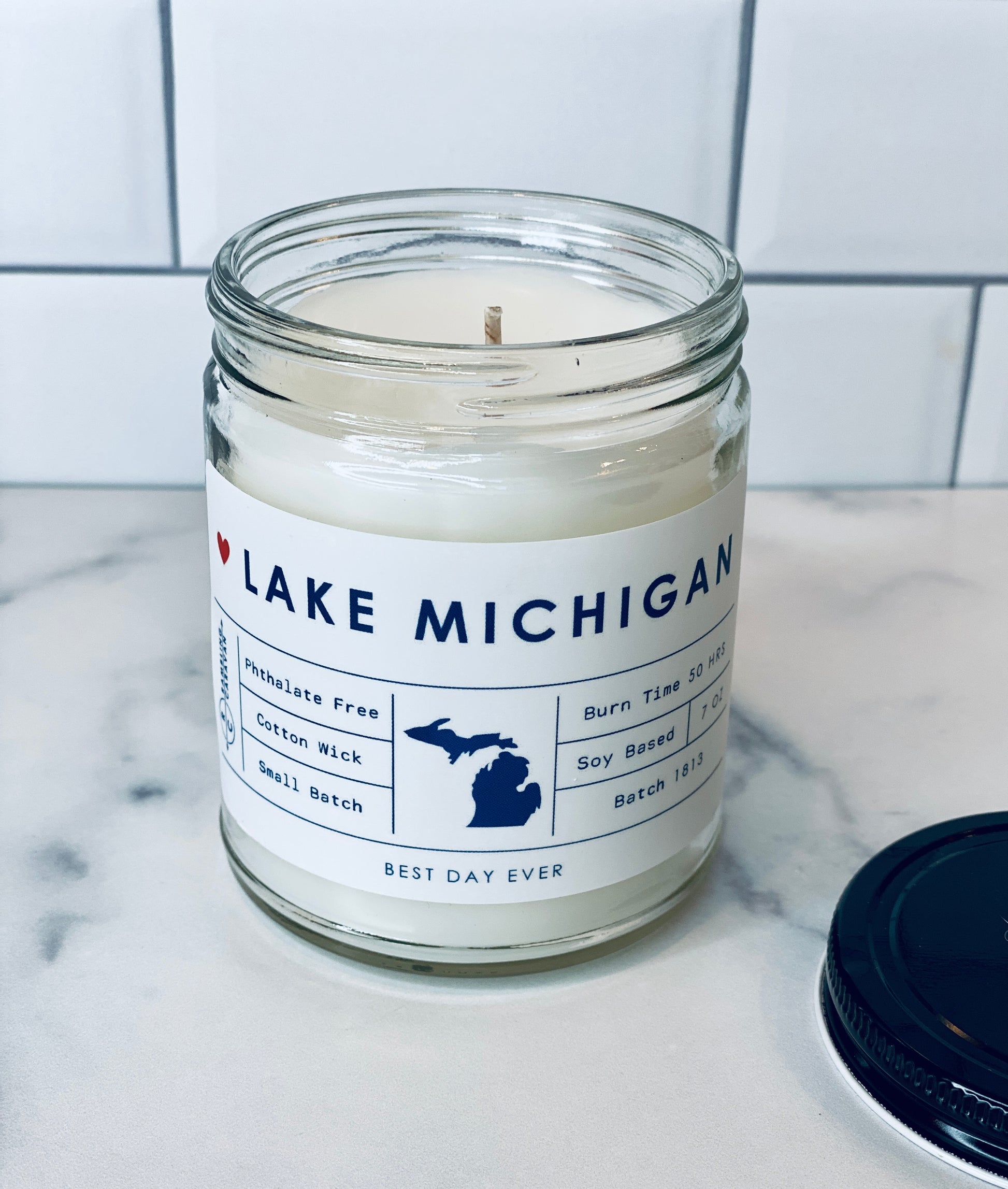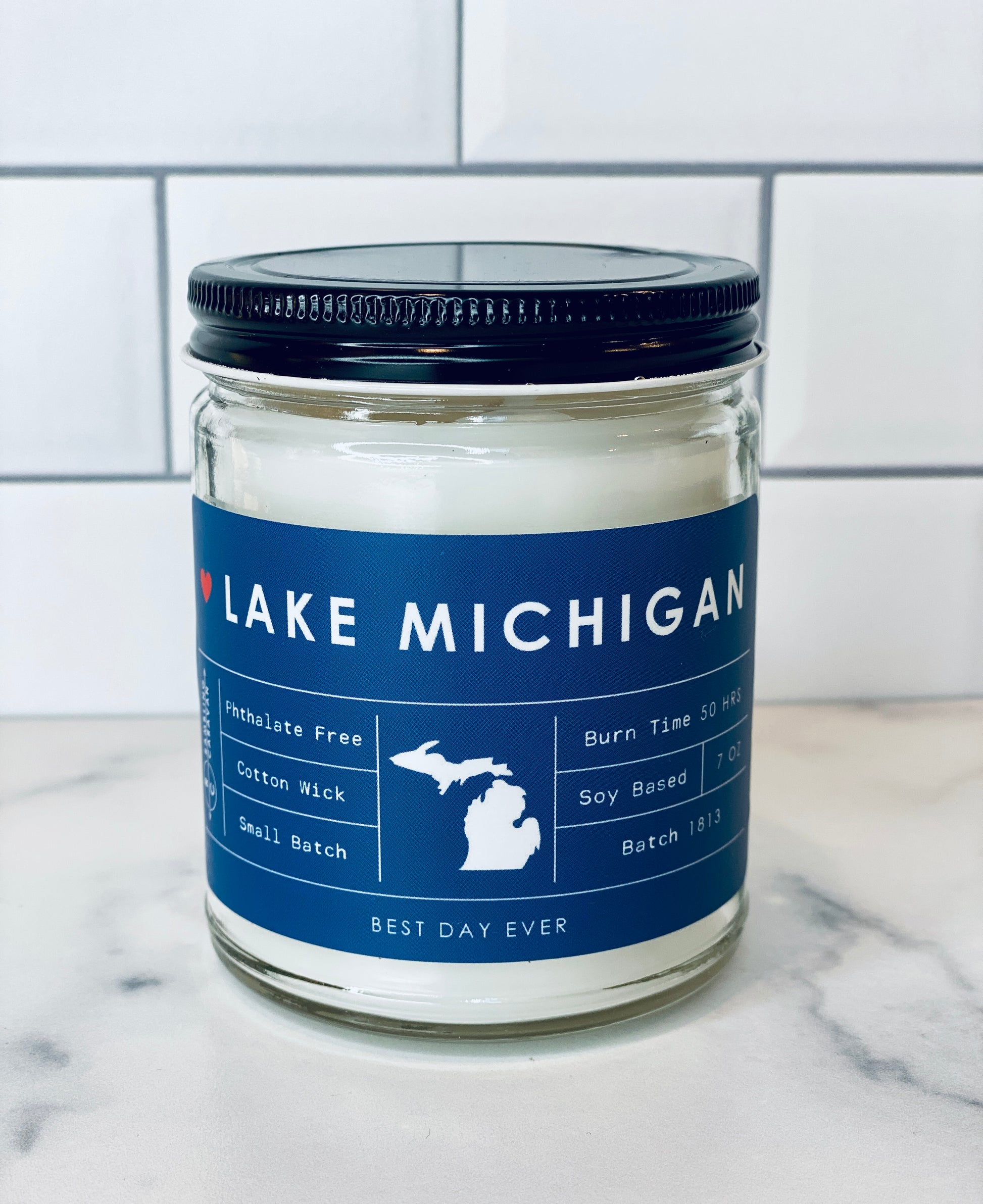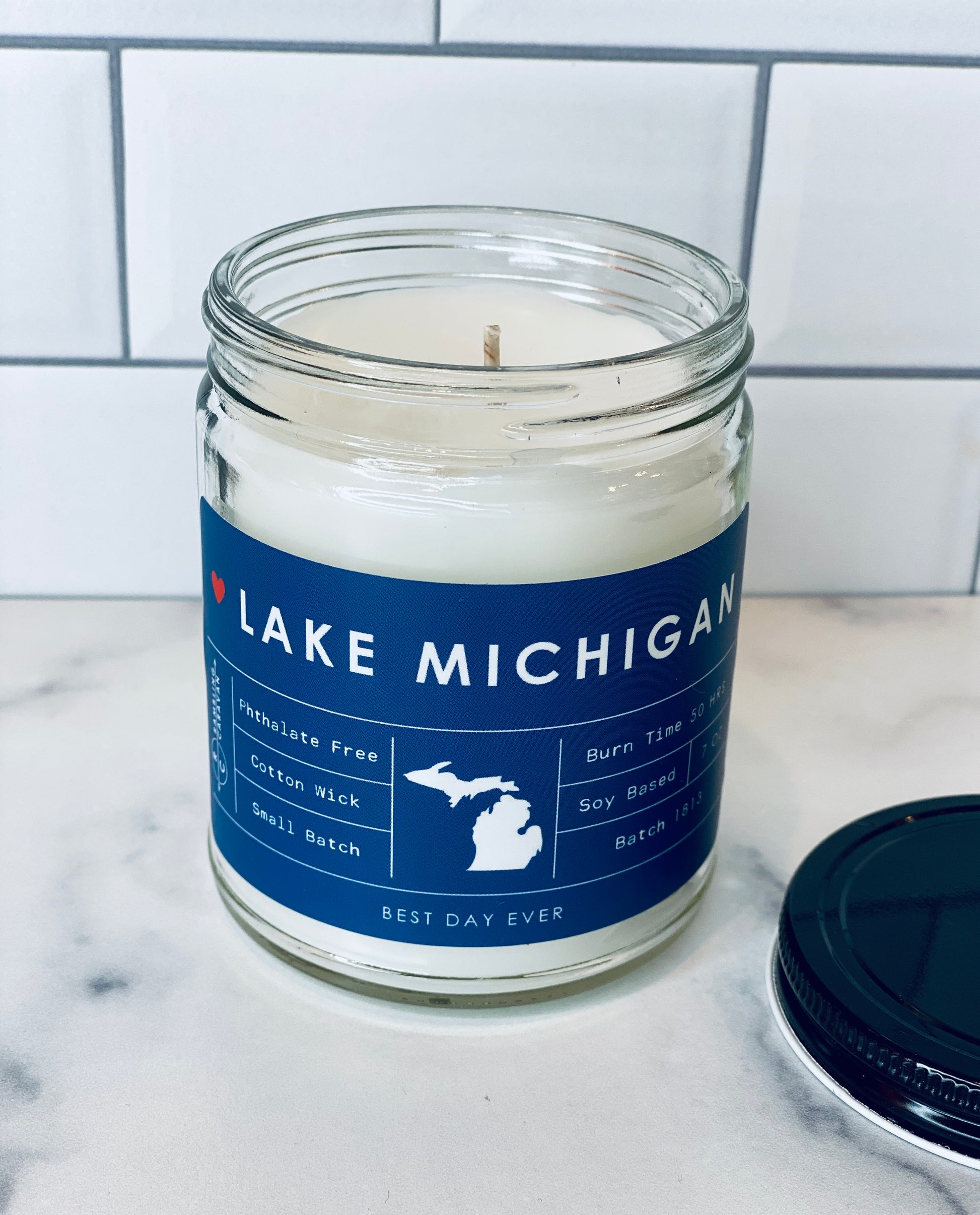 Lake Michigan Candle - Rambling Caravan candles are inspired by home, travel and adventure. Made from a soy/coconut based wax blend, the candles are hand poured in Virginia Beach, Virginia. We use phthalate free fragrances and have an assortment of fragrances from which to choose. Many of our candles have different color labels to choose from as well. We use cotton wicks with no zinc or lead. We do not use additives, nor scent enhancers or UV blockers. The burn time is approximately 50 hours.