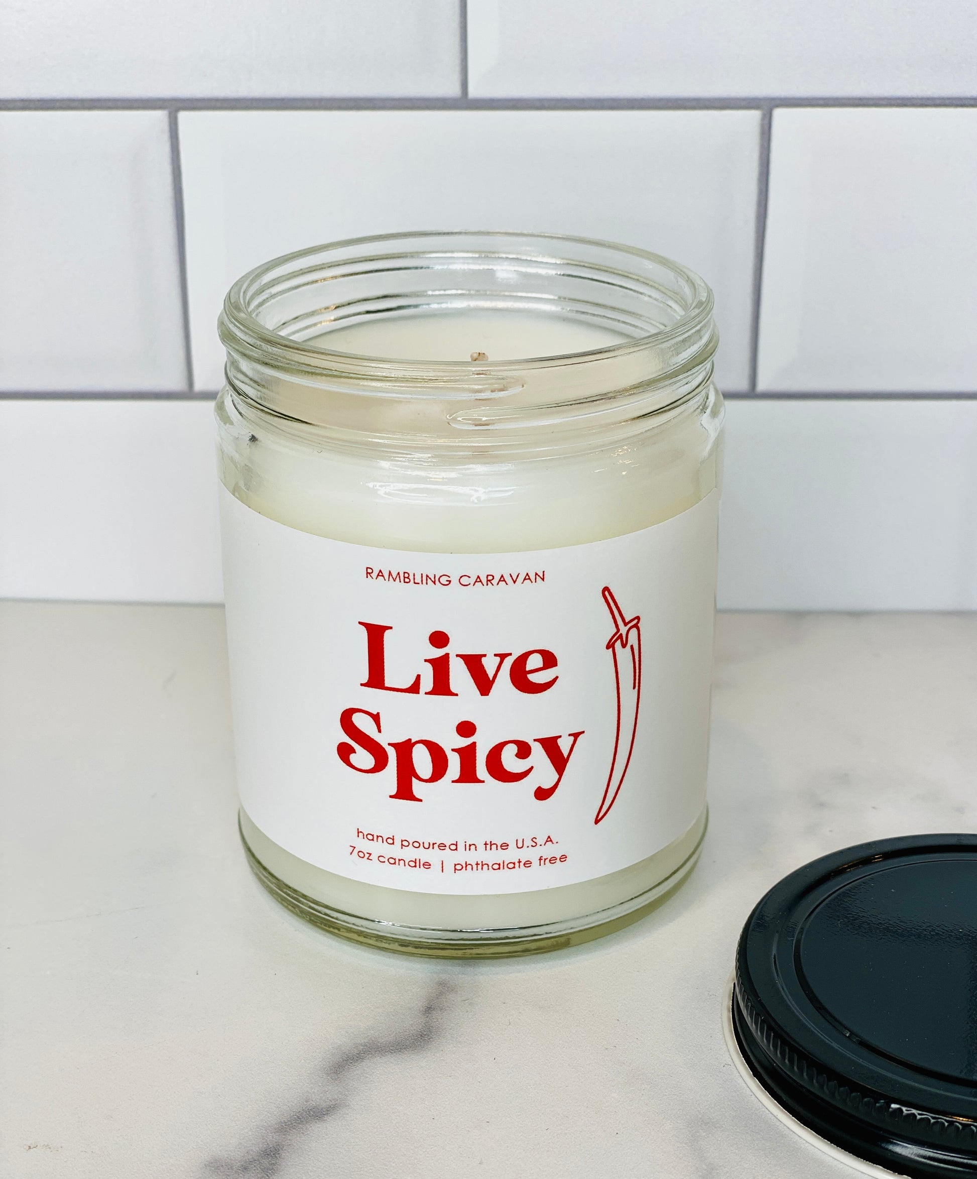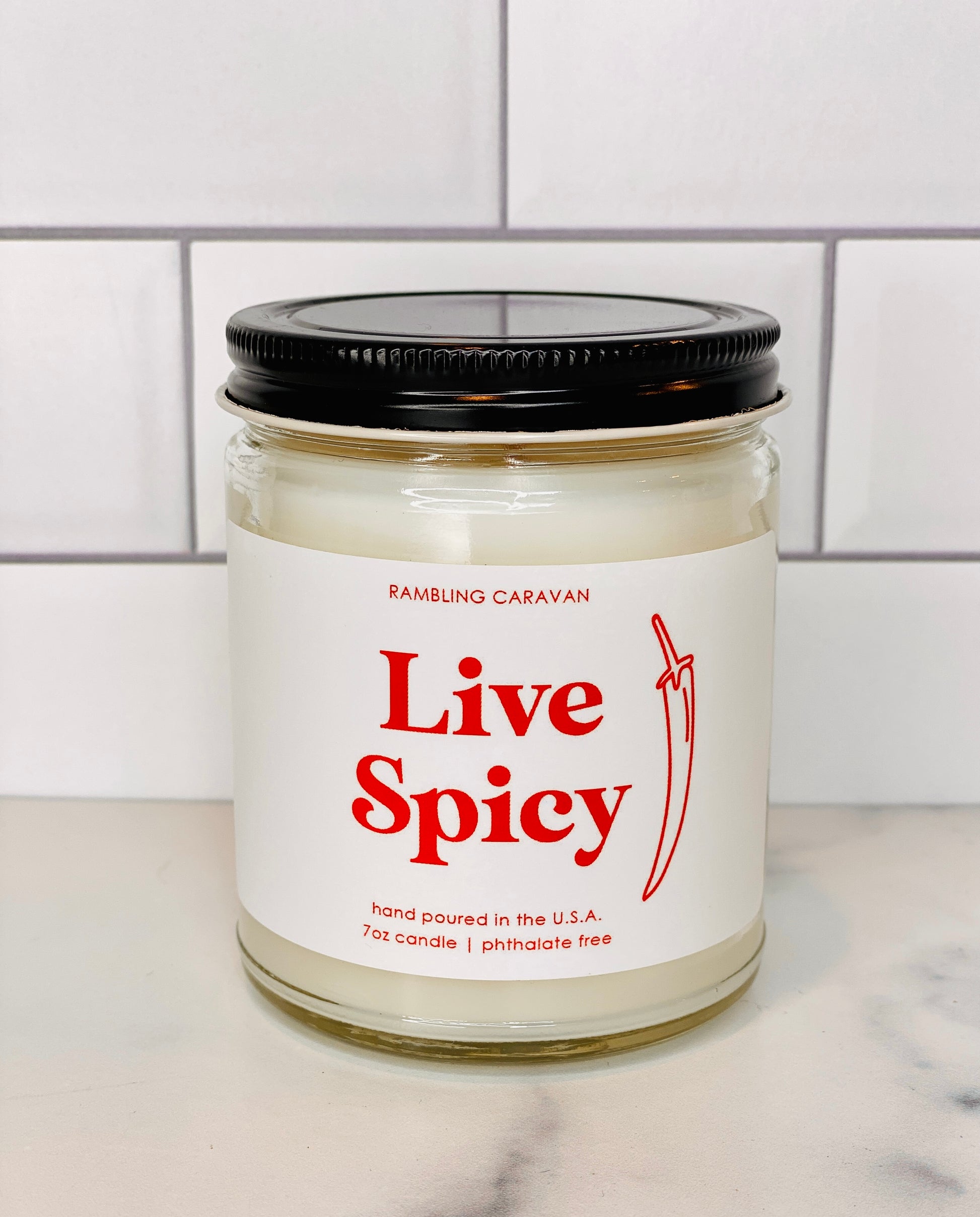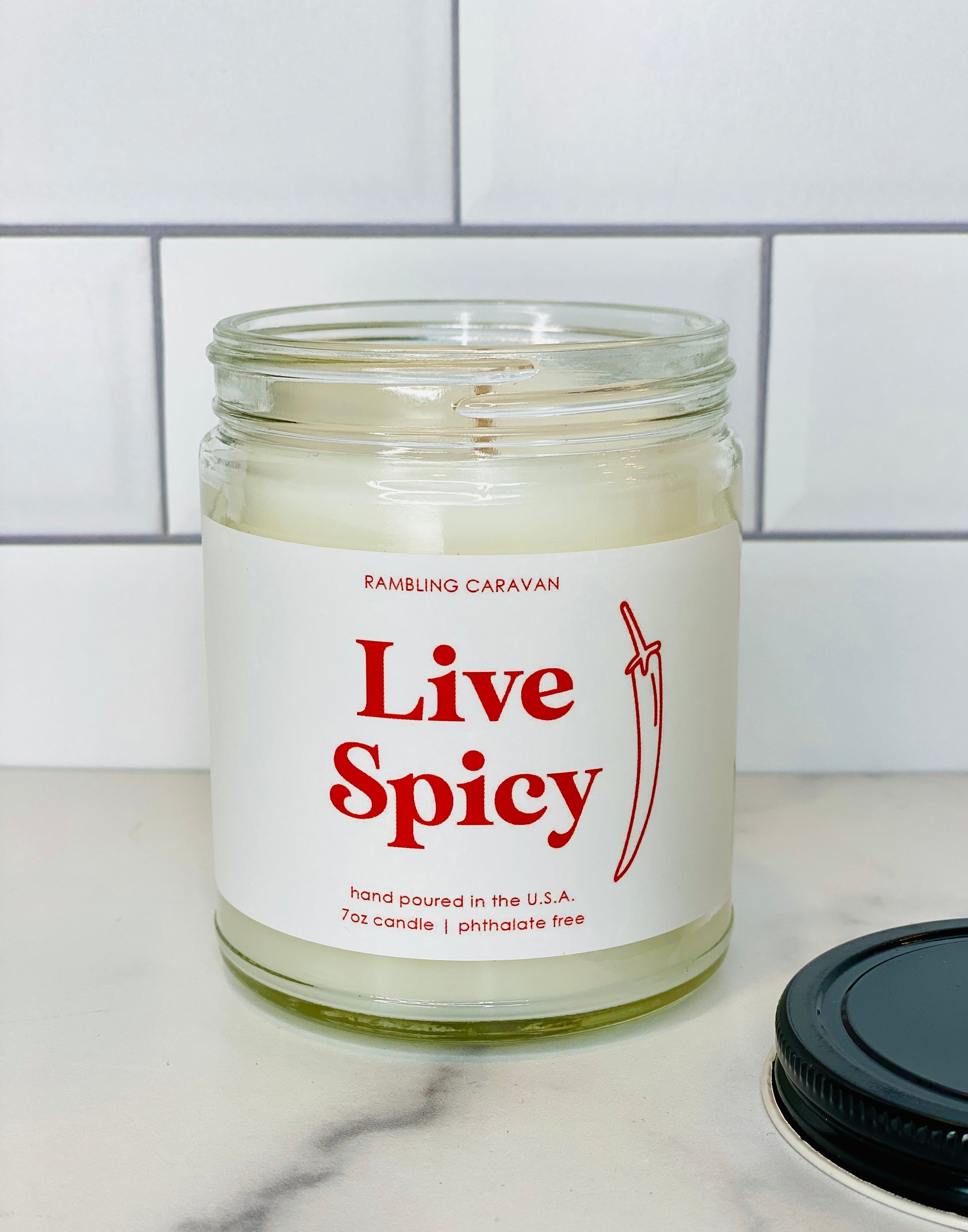 Live Spicy Candle - Rambling Caravan candles are inspired by home, travel and adventure. Made from a soy/coconut based wax blend, the candles are hand poured in Virginia Beach, Virginia. We use phthalate free fragrances and have an assortment of fragrances from which to choose. Many of our candles have different color labels to choose from as well. We use cotton wicks with no zinc or lead. We do not use additives, nor scent enhancers or UV blockers. The burn time is approximately 50 hours.