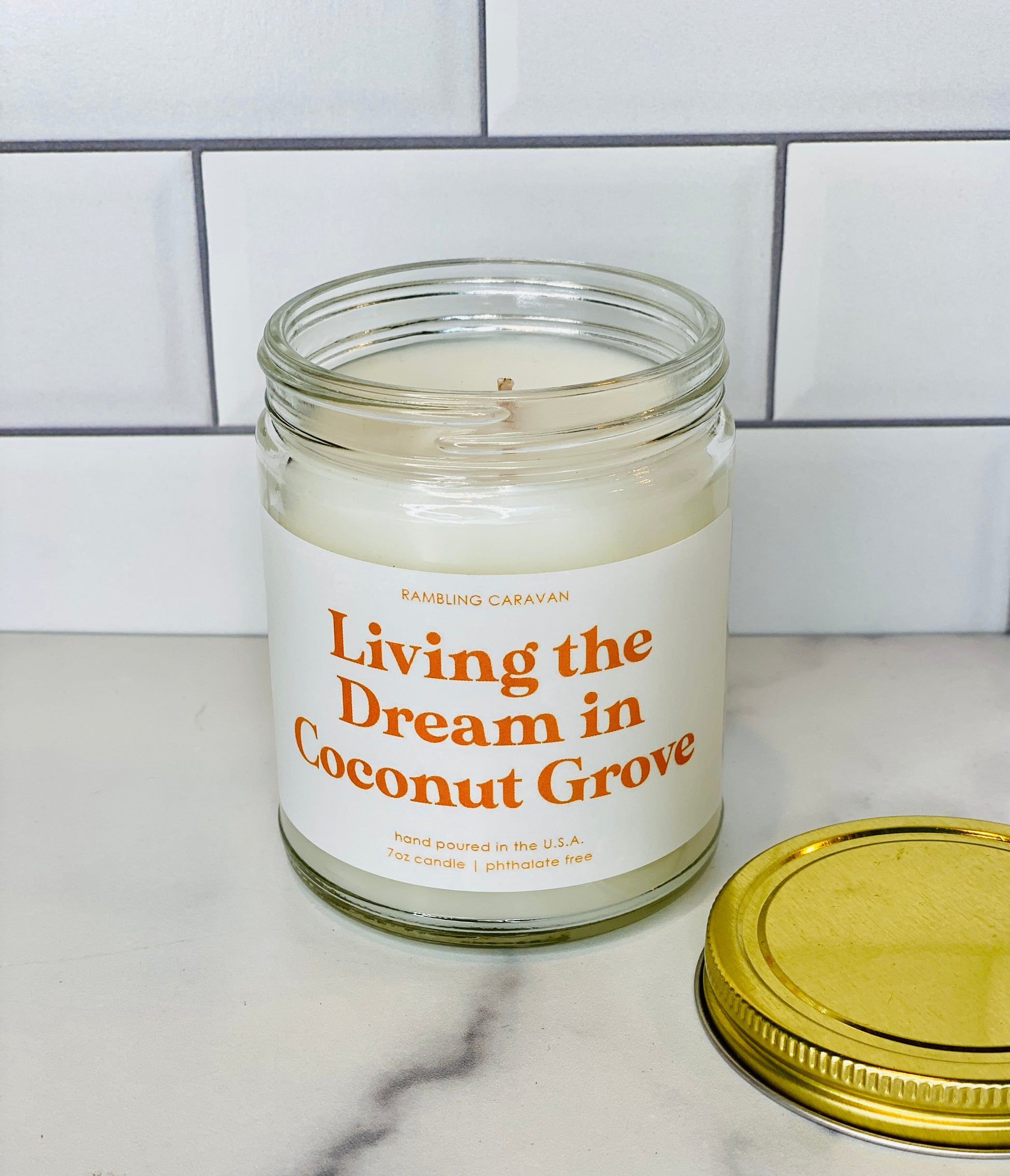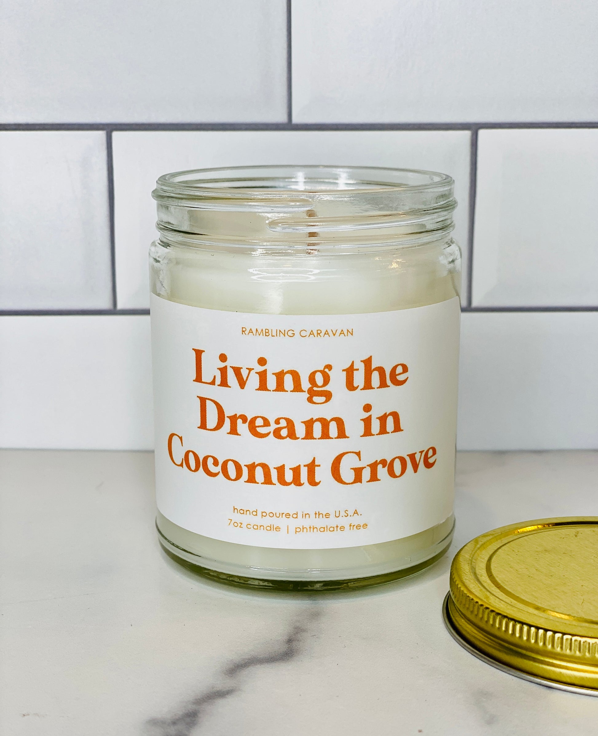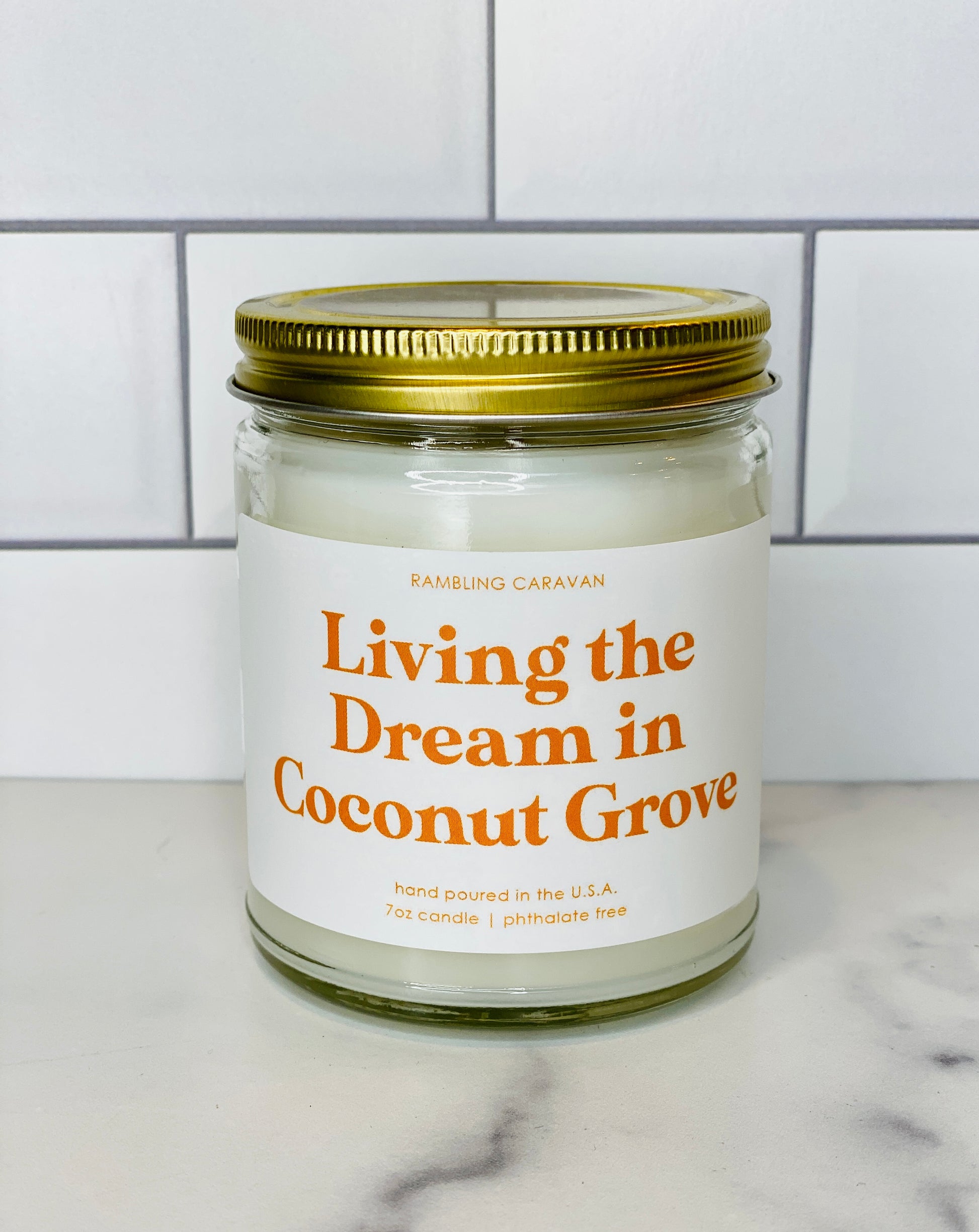 Living the Dream in Coconut Grove Candle - Rambling Caravan candles are inspired by home, travel and adventure. Made from a soy/coconut based wax blend, the candles are hand poured in Virginia Beach, Virginia. We use phthalate free fragrances and have an assortment of fragrances from which to choose. Many of our candles have different color labels to choose from as well. We use cotton wicks with no zinc or lead. We do not use additives, nor scent enhancers or UV blockers. The burn time is approximately 50 hours.
