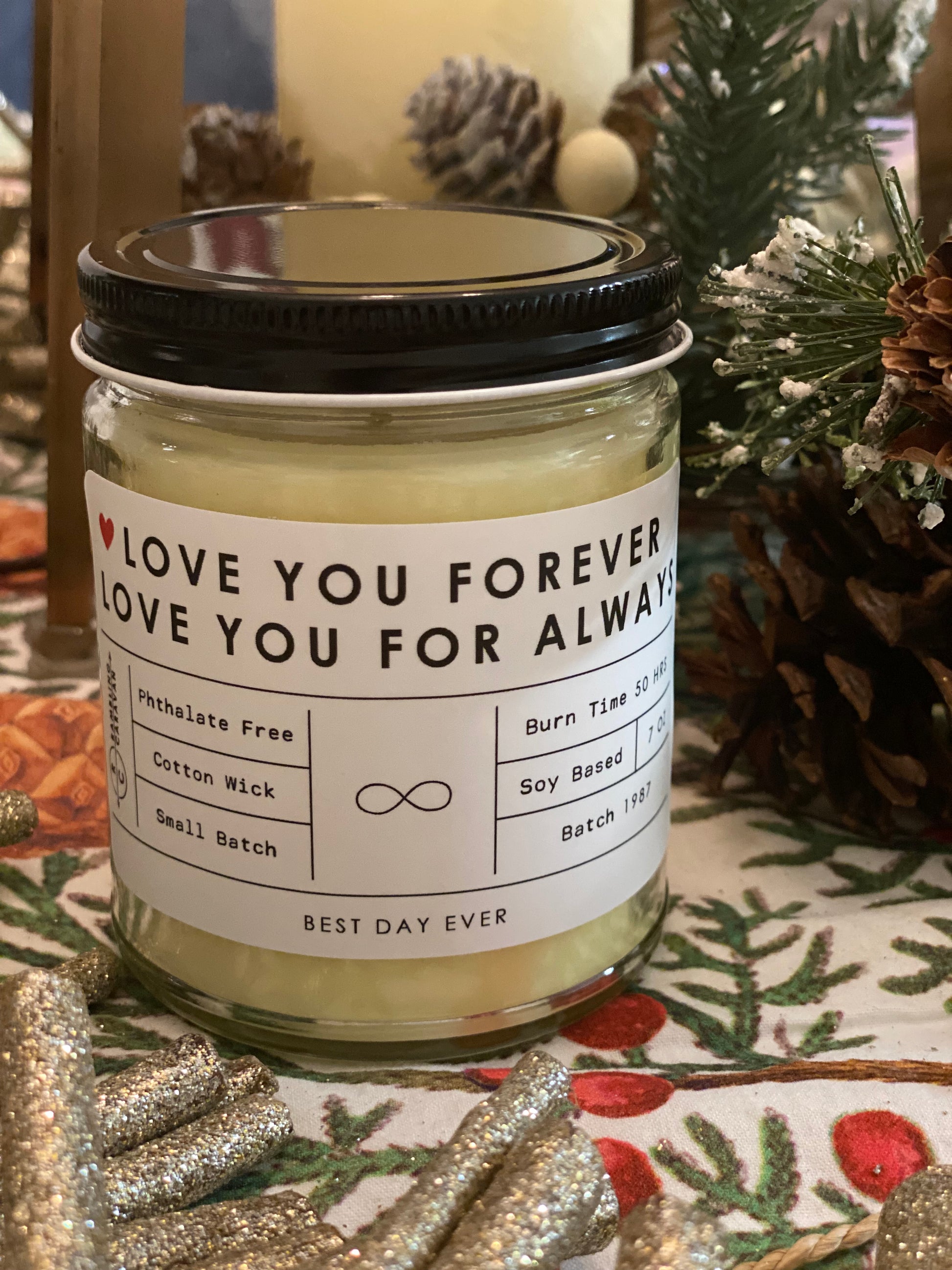Love You Forever Love You For Always Candle - Rambling Caravan candles are inspired by home, travel and adventure. Made from a soy/coconut based wax blend, the candles are hand poured in Virginia Beach, Virginia. We use phthalate free fragrances and have an assortment of fragrances from which to choose. Many of our candles have different color labels to choose from as well. We use cotton wicks with no zinc or lead. We do not use additives, nor scent enhancers or UV blockers. The burn time is approximately 50 hours.