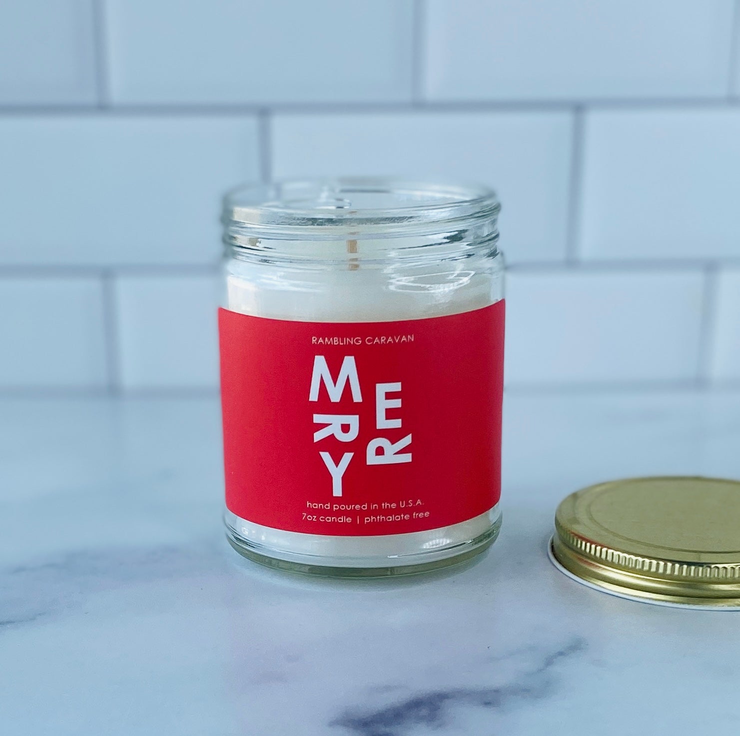 Merry Candle - Rambling Caravan candles are inspired by home, travel and adventure. Made from a soy/coconut based wax blend, the candles are hand poured in Virginia Beach, Virginia. We use phthalate free fragrances and have an assortment of fragrances from which to choose. Many of our candles have different color labels to choose from as well. We use cotton wicks with no zinc or lead. We do not use additives, nor scent enhancers or UV blockers. The burn time is approximately 50 hours.