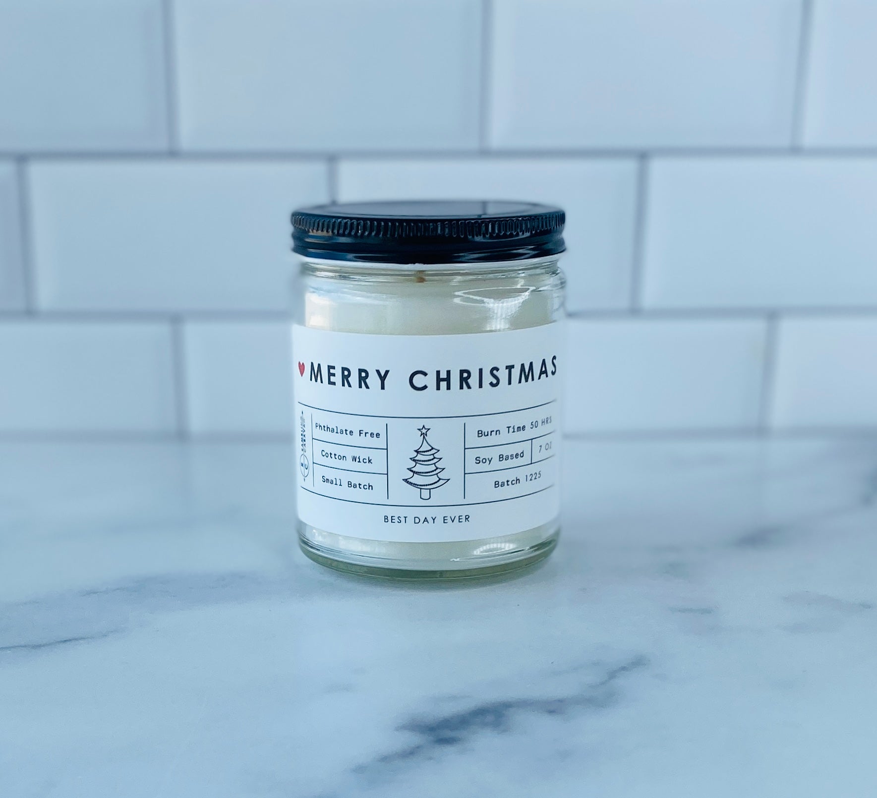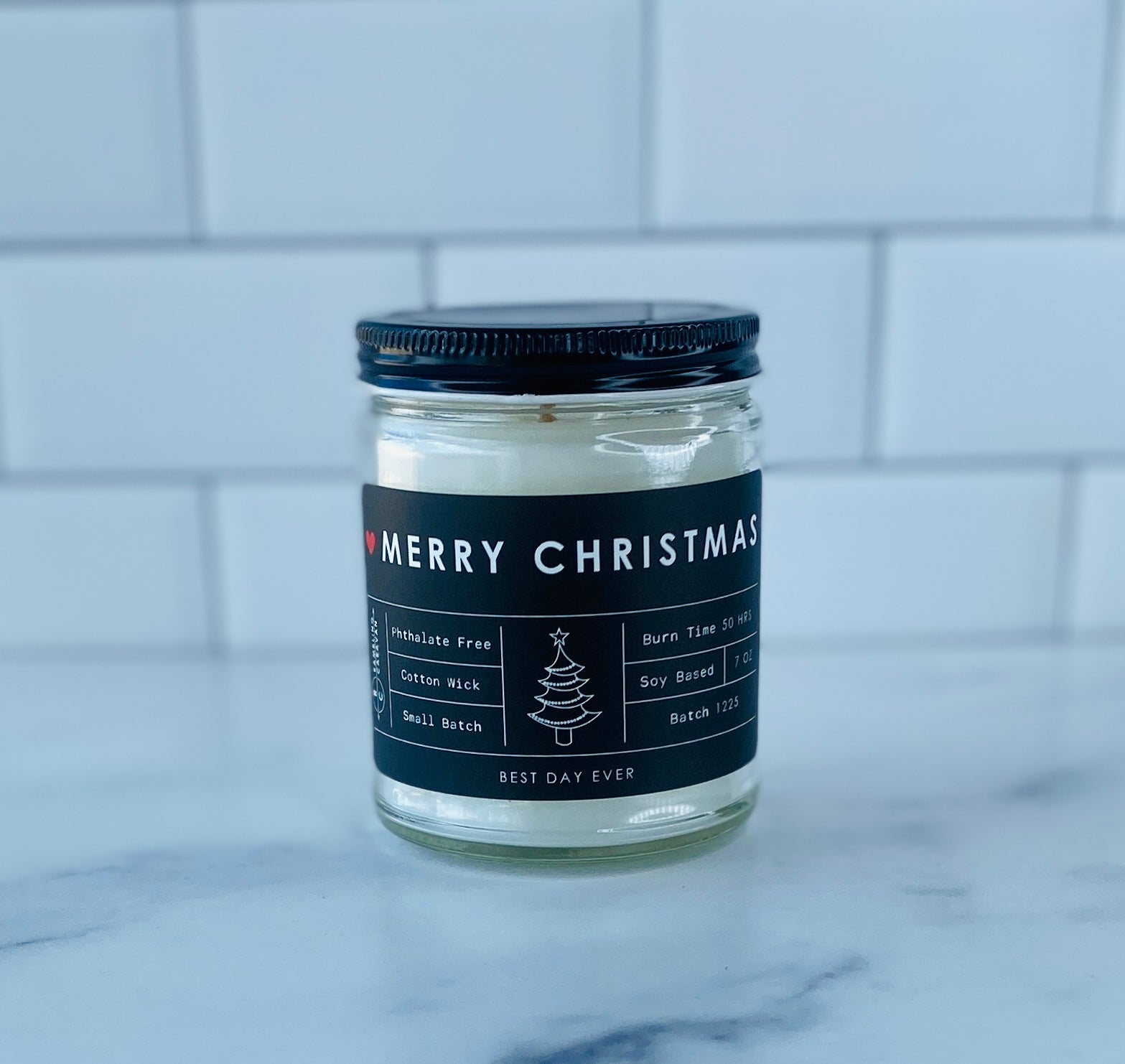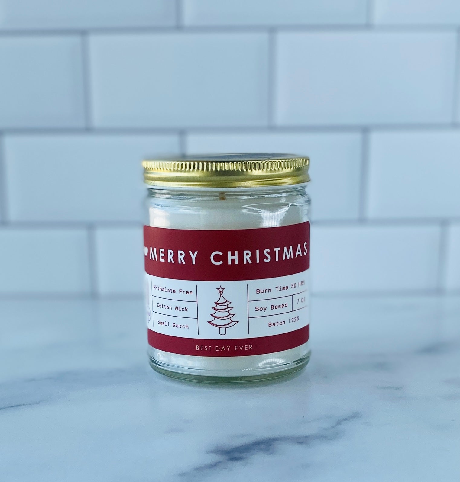 Merry Christmas Candle - Rambling Caravan candles are inspired by home, travel and adventure. Made from a soy/coconut based wax blend, the candles are hand poured in Virginia Beach, Virginia. We use phthalate free fragrances and have an assortment of fragrances from which to choose. Many of our candles have different color labels to choose from as well. We use cotton wicks with no zinc or lead. We do not use additives, nor scent enhancers or UV blockers. The burn time is approximately 50 hours.