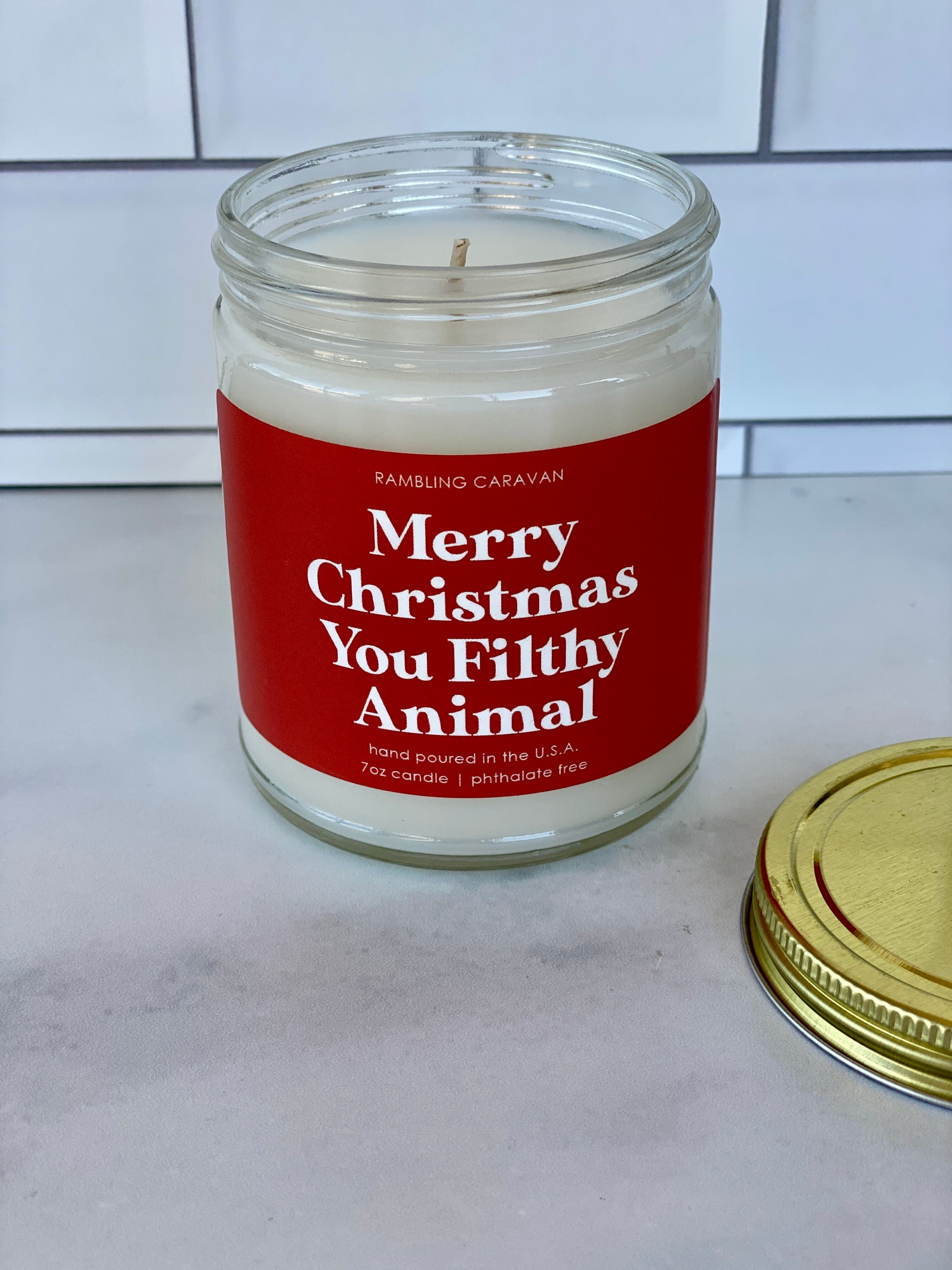 Merry Christmas You Filthy Animal Candle - Rambling Caravan candles are inspired by home, travel and adventure. Made from a soy/coconut based wax blend, the candles are hand poured in Virginia Beach, Virginia. We use phthalate free fragrances and have an assortment of fragrances from which to choose. Many of our candles have different color labels to choose from as well. We use cotton wicks with no zinc or lead. We do not use additives, nor scent enhancers or UV blockers. The burn time is approximately 50 hours.