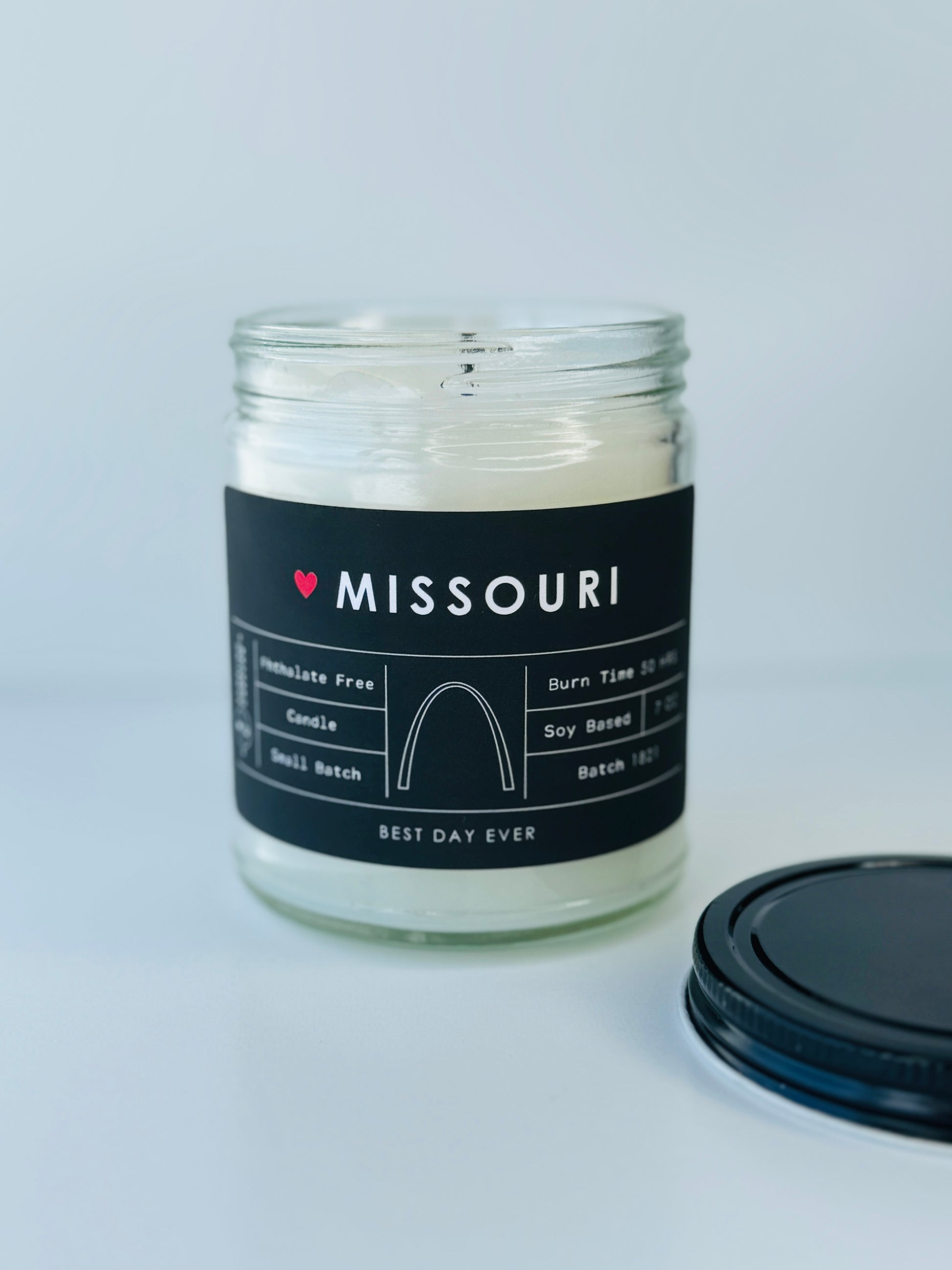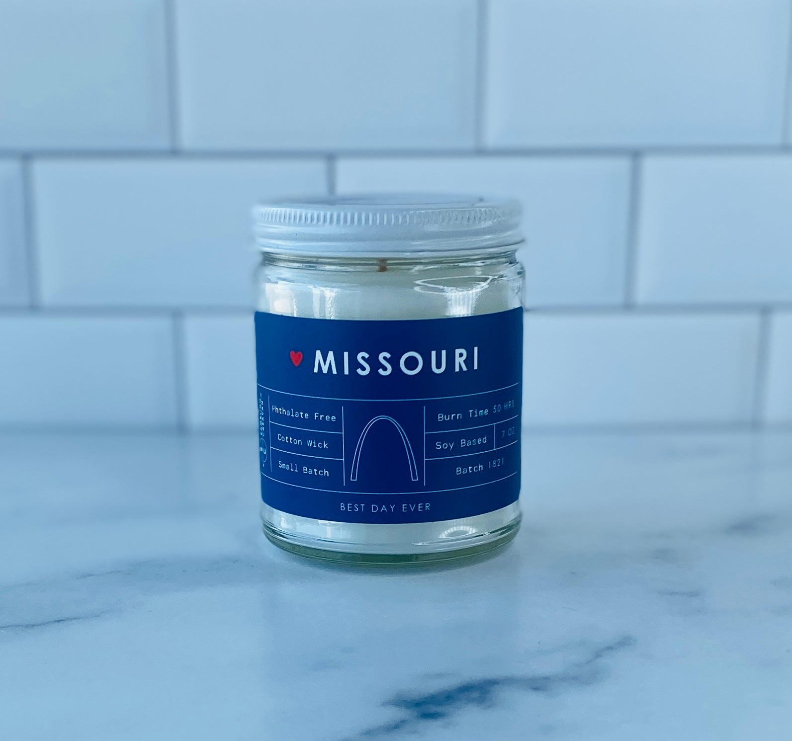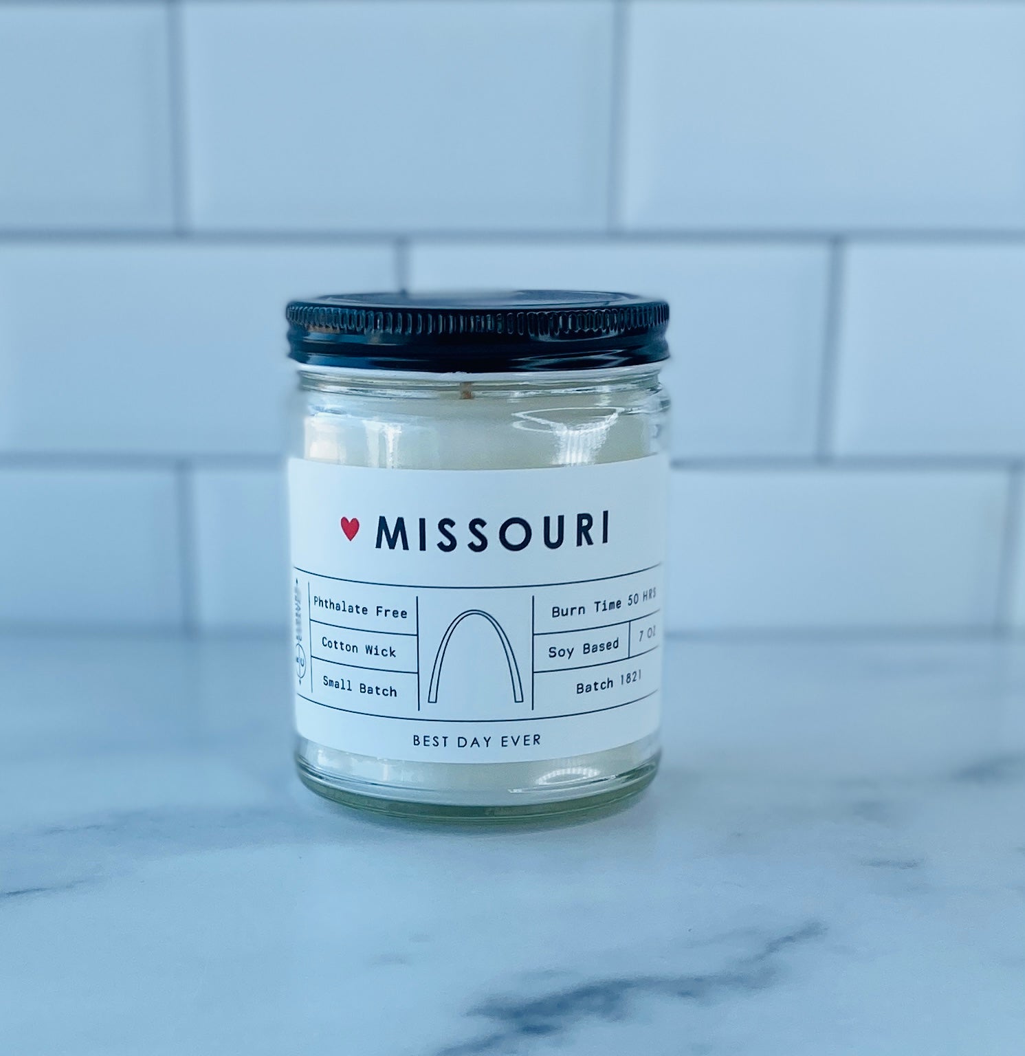 Missouri Candle - Rambling Caravan candles are inspired by home, travel and adventure. Made from a soy/coconut based wax blend, the candles are hand poured in Virginia Beach, Virginia. We use phthalate free fragrances and have an assortment of fragrances from which to choose. Many of our candles have different color labels to choose from as well. We use cotton wicks with no zinc or lead. We do not use additives, nor scent enhancers or UV blockers. The burn time is approximately 50 hours.