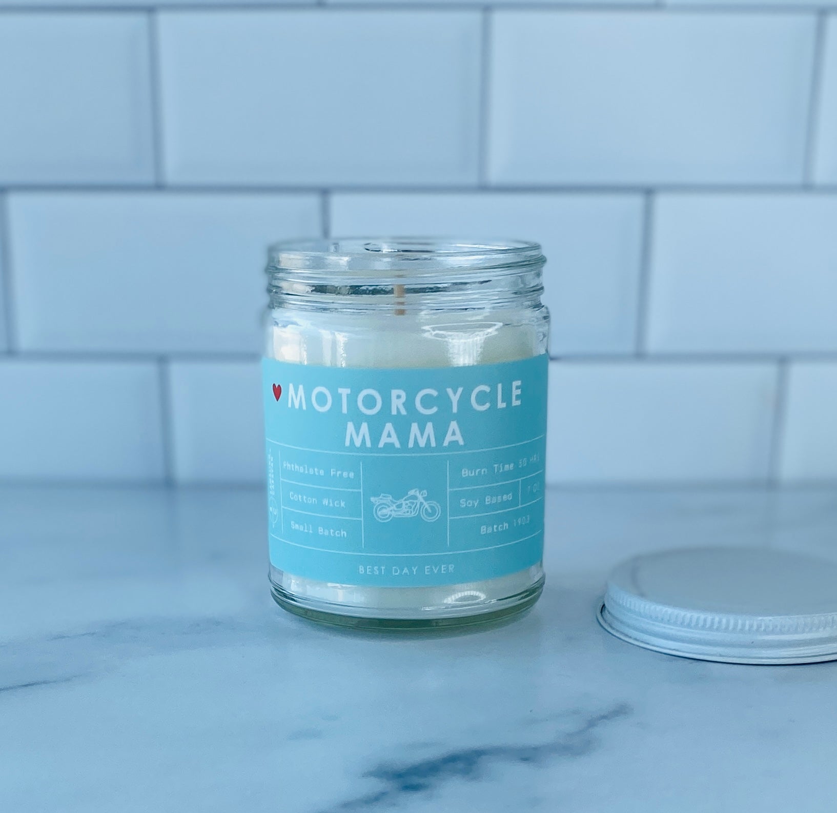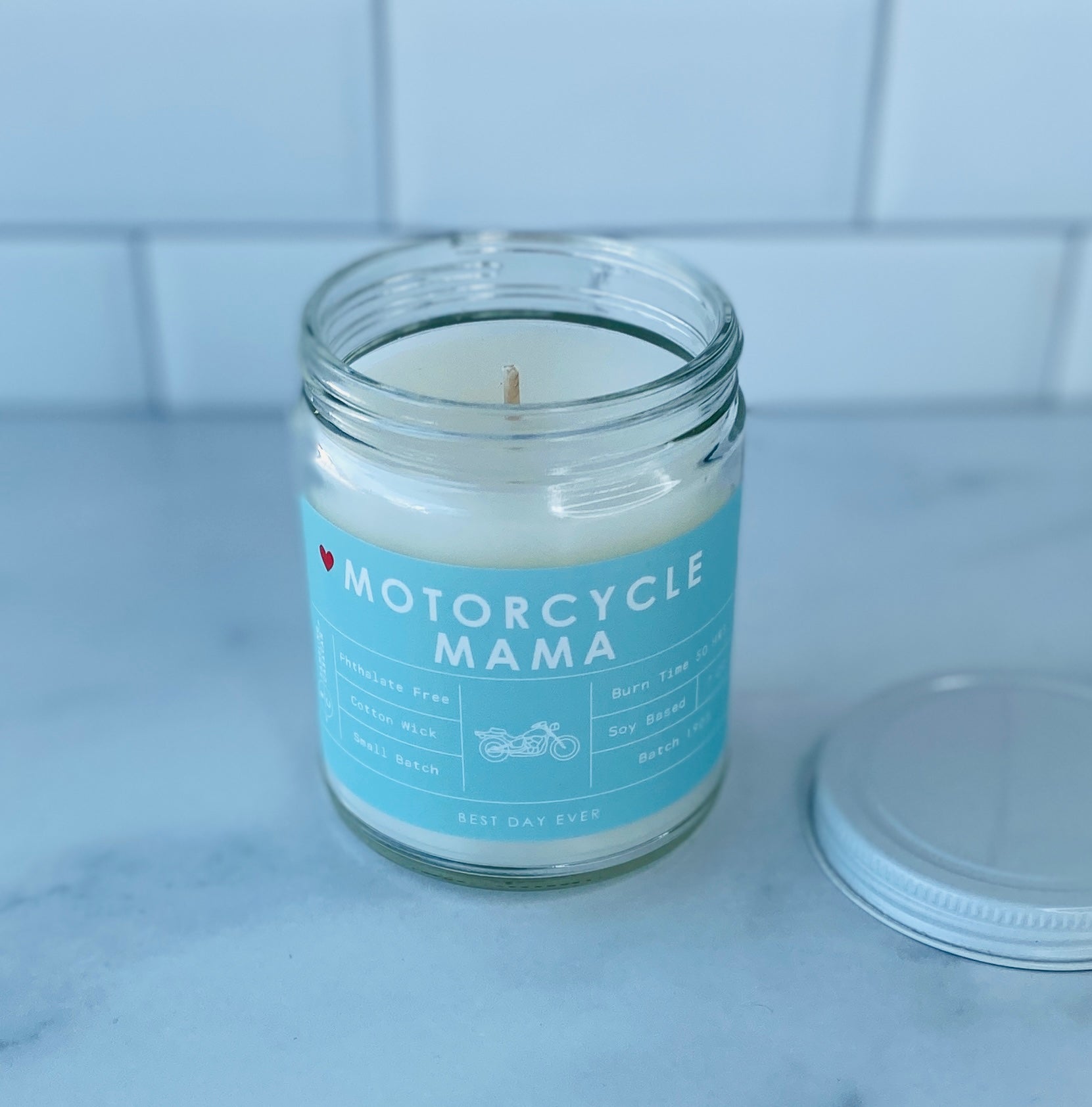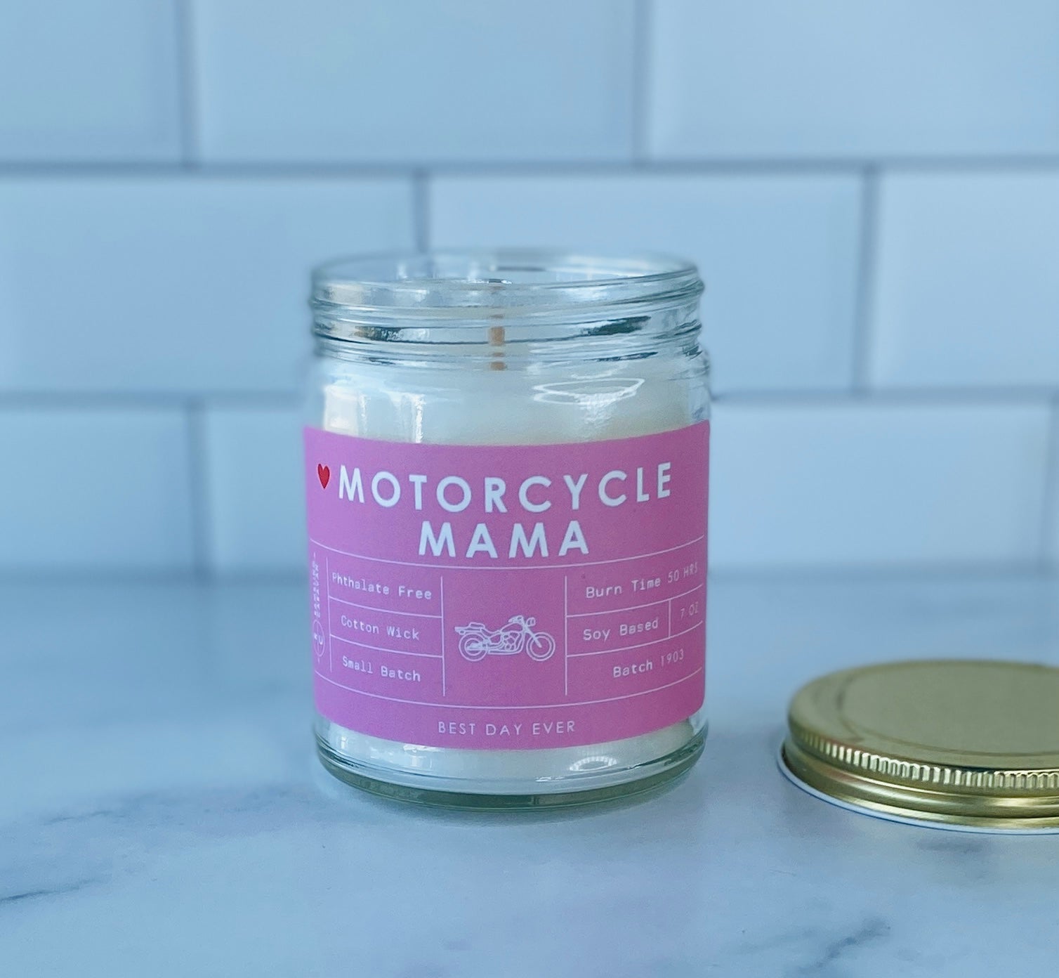 Motorcycle Mama Candle - Rambling Caravan candles are inspired by home, travel and adventure. Made from a soy/coconut based wax blend, the candles are hand poured in Virginia Beach, Virginia. We use phthalate free fragrances and have an assortment of fragrances from which to choose. Many of our candles have different color labels to choose from as well. We use cotton wicks with no zinc or lead. We do not use additives, nor scent enhancers or UV blockers. The burn time is approximately 50 hours.