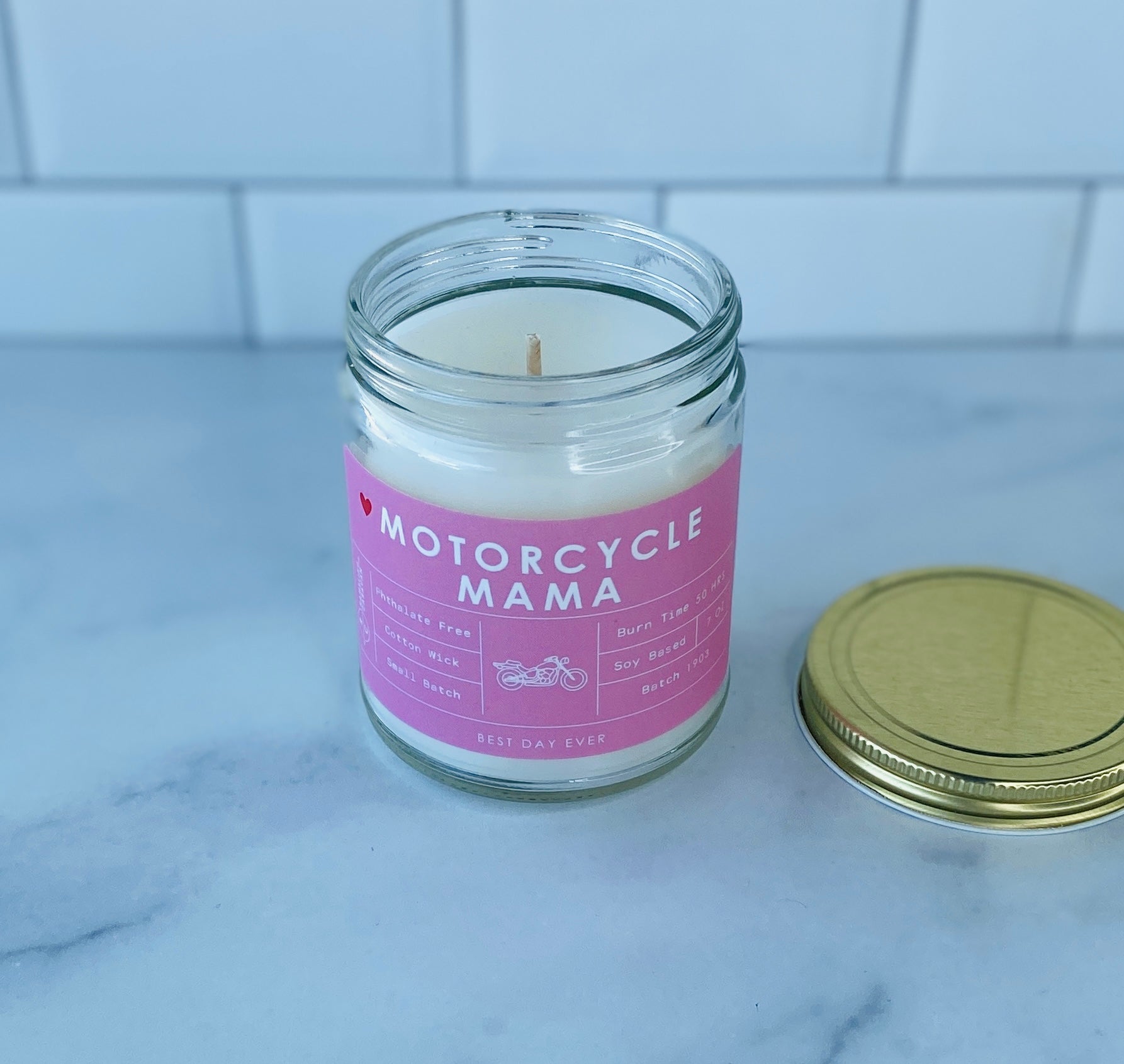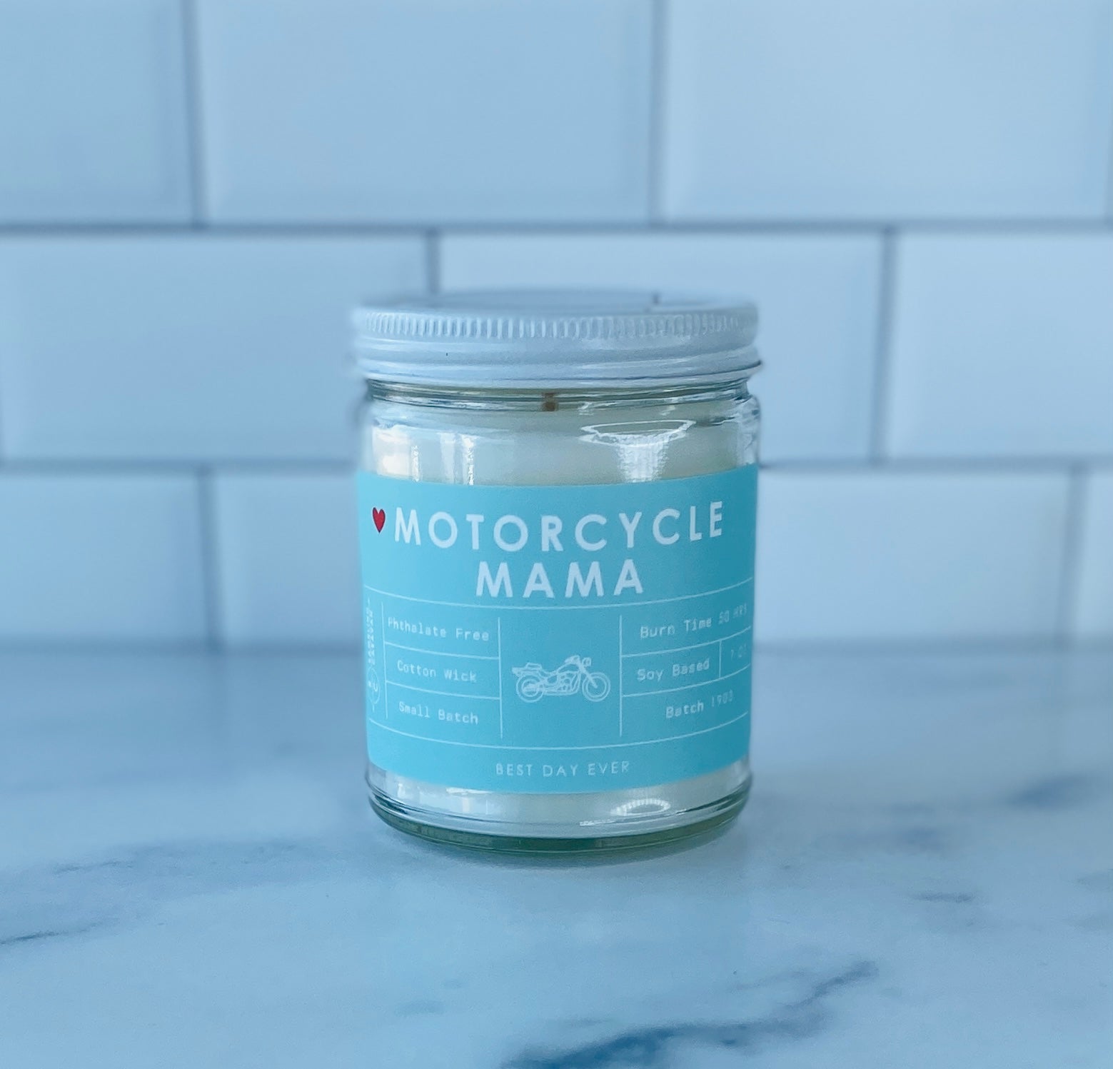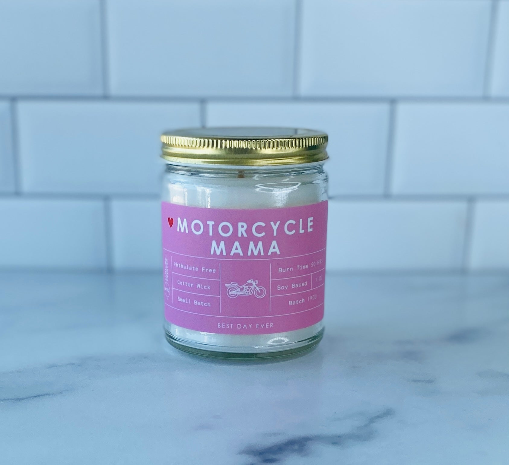 Motorcycle Mama Candle - Rambling Caravan candles are inspired by home, travel and adventure. Made from a soy/coconut based wax blend, the candles are hand poured in Virginia Beach, Virginia. We use phthalate free fragrances and have an assortment of fragrances from which to choose. Many of our candles have different color labels to choose from as well. We use cotton wicks with no zinc or lead. We do not use additives, nor scent enhancers or UV blockers. The burn time is approximately 50 hours.