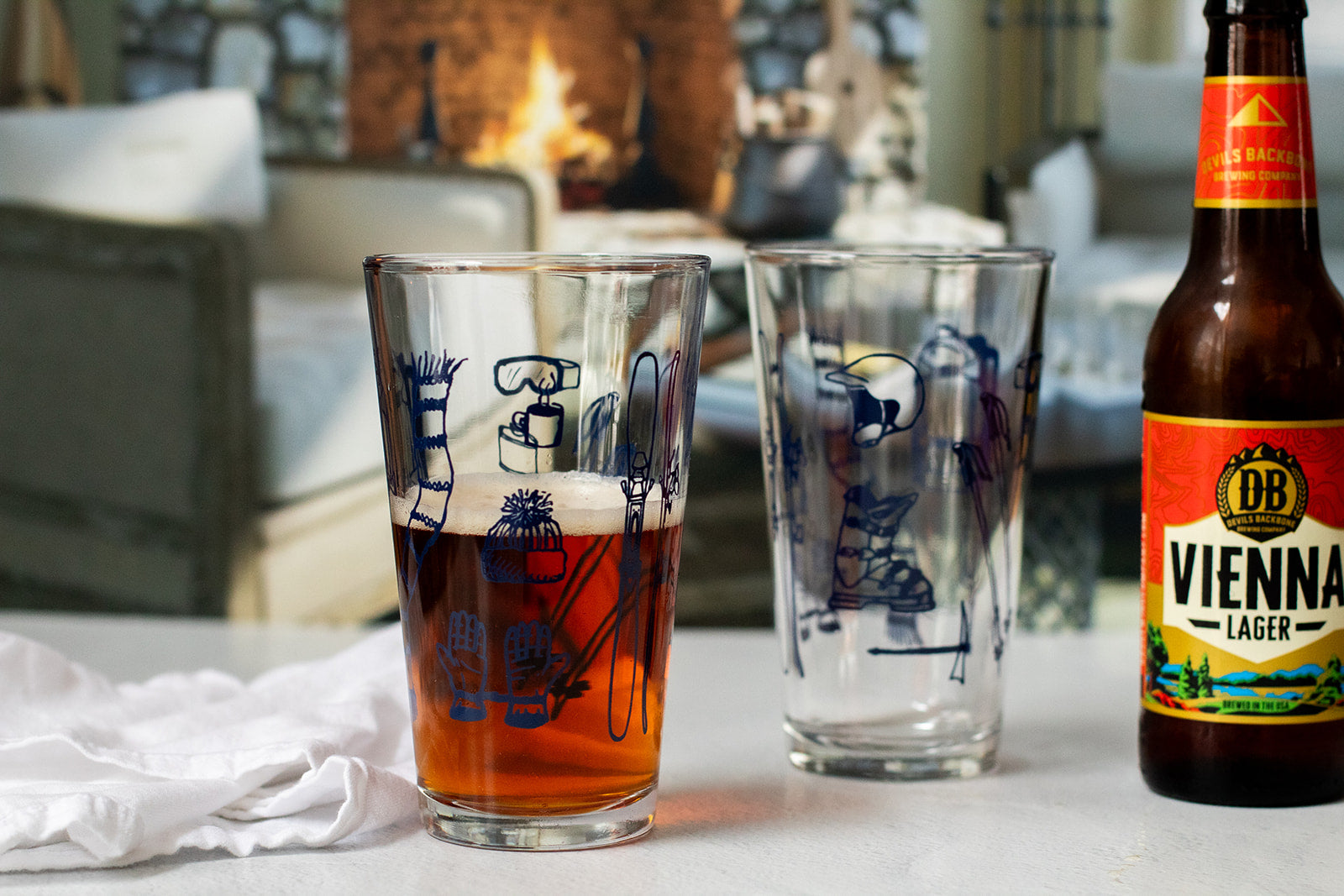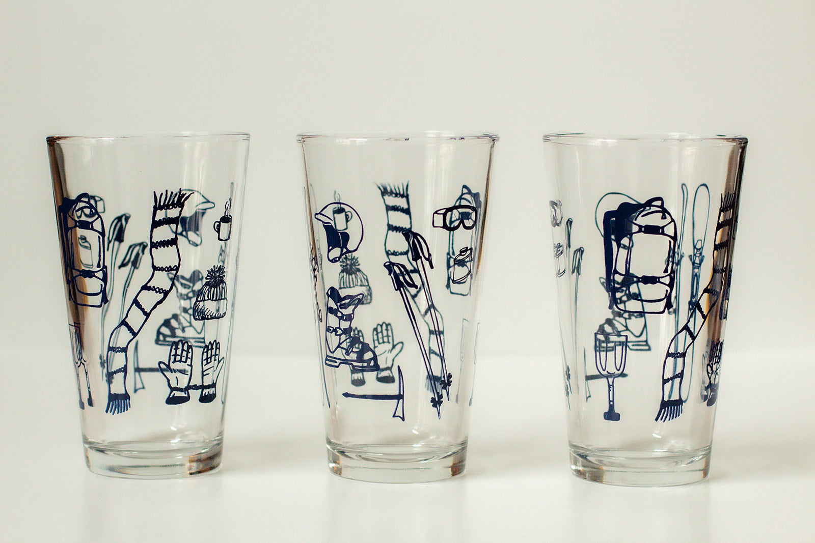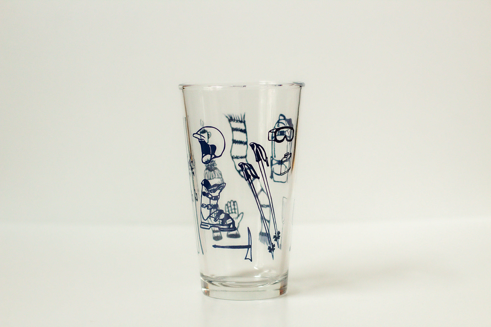 Hit the slopes! Pair your location name with our collection of classic downhill skiing gear on a durable 16oz pint glass. Skis, boots, poles, a backpack, knit beanie and scarf, helmet, a backpack and shovel for backcountry adventures... even a flask and a mug for hot cocoa at the end of the day!