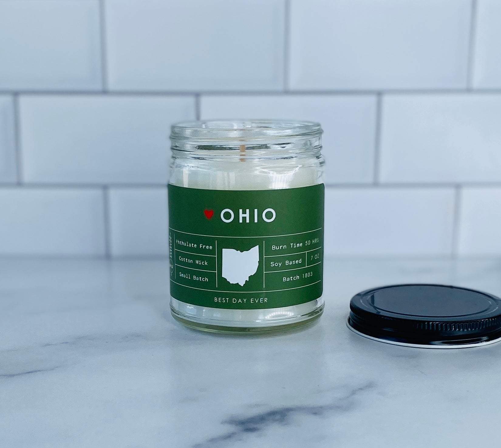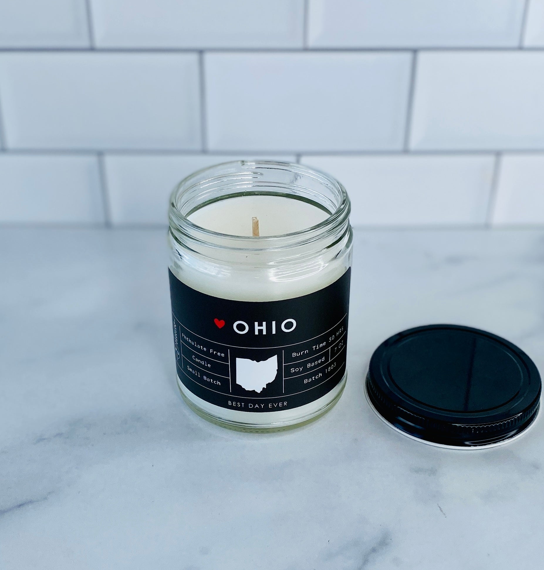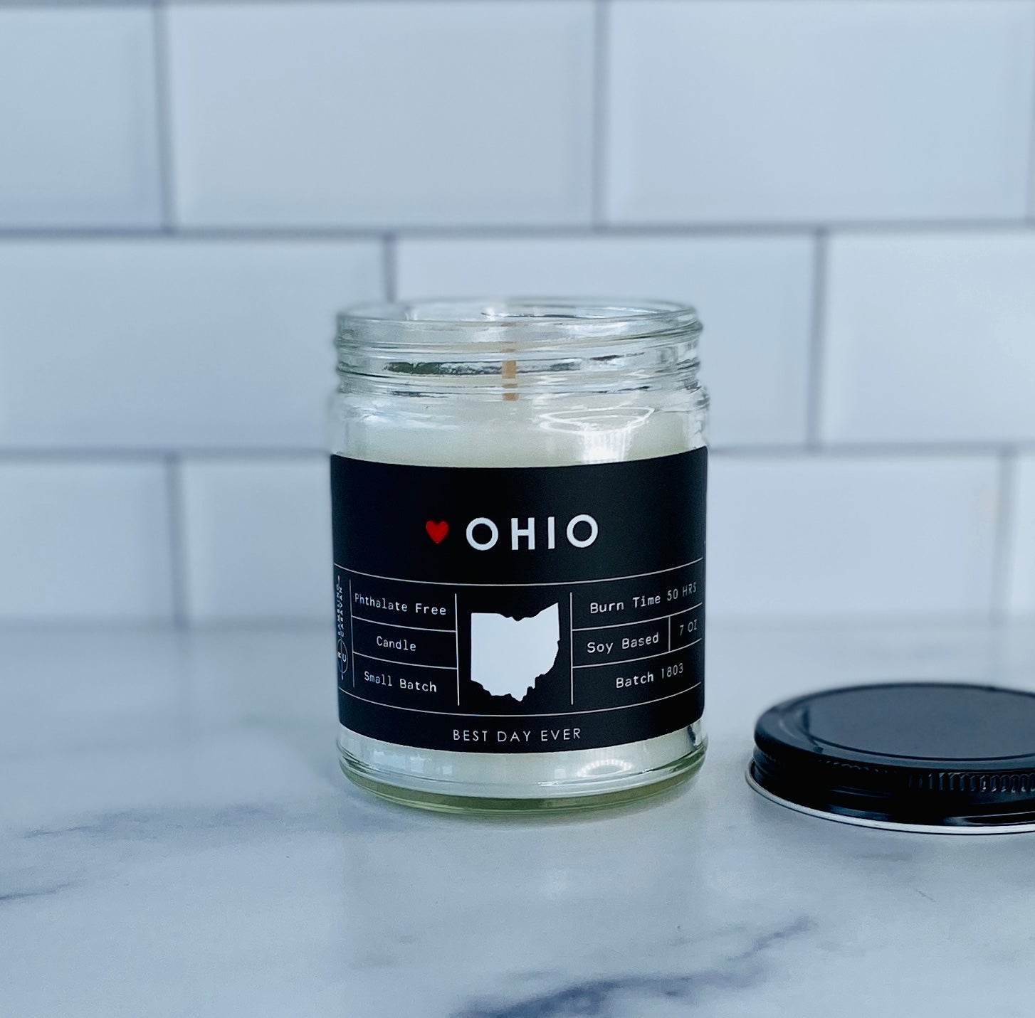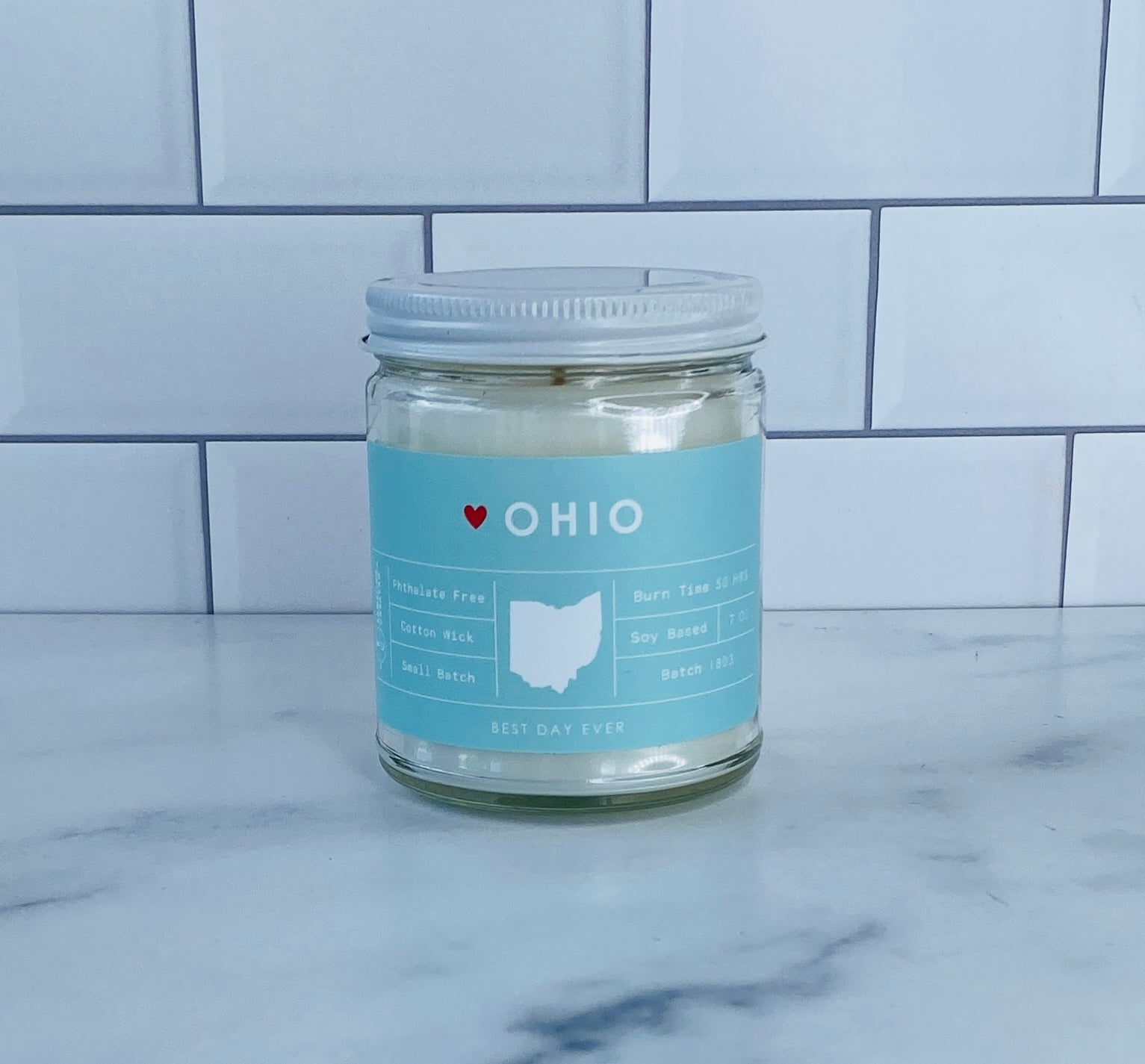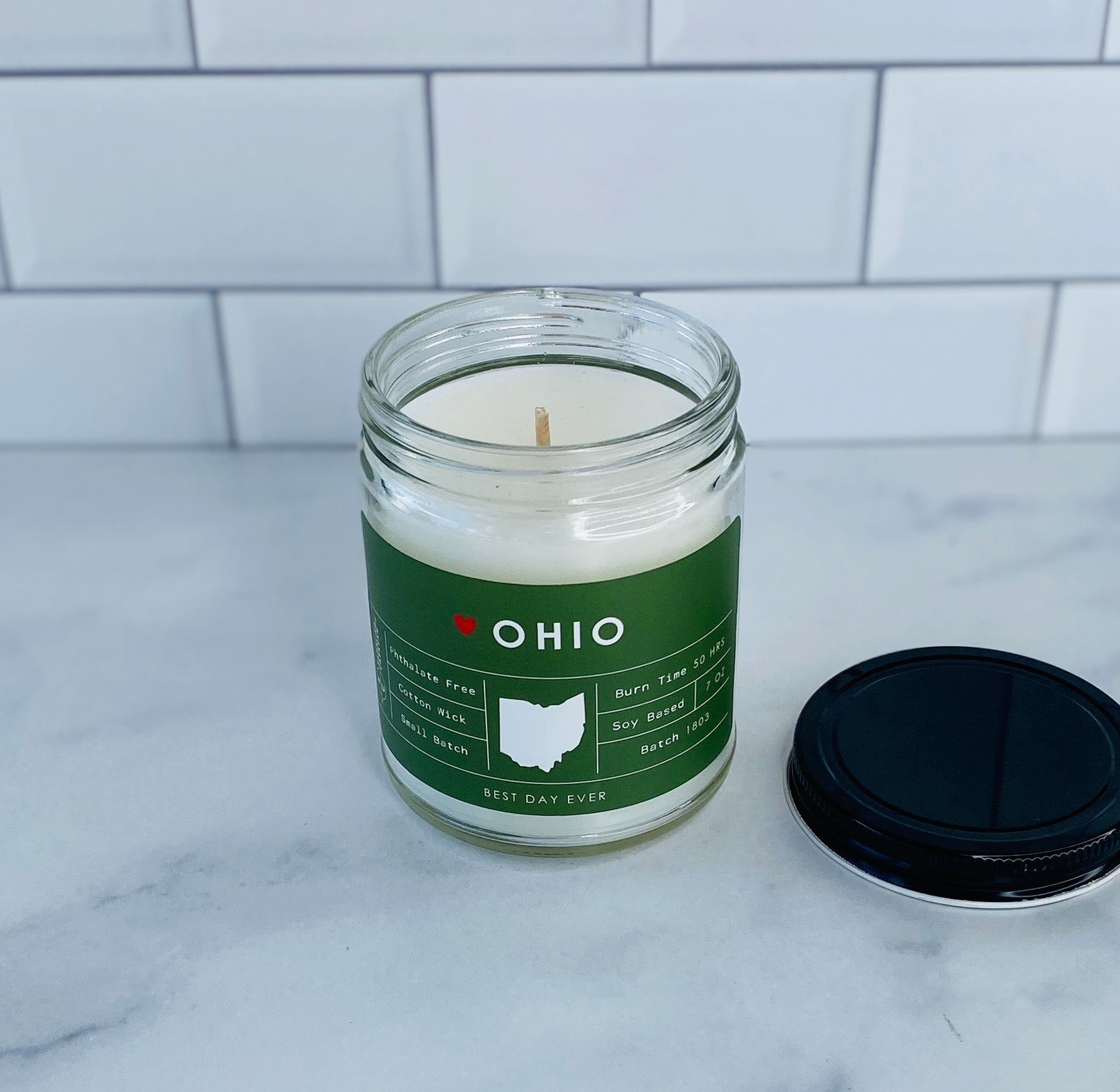 Ohio Candle - Celebrating the Great State of Ohio - Rambling Caravan candles are inspired by home, travel and adventure. Made from a soy/coconut based wax blend, the candles are hand poured in Virginia Beach, Virginia. We use phthalate free fragrances and have an assortment of fragrances from which to choose. Many of our candles have different color labels to choose from as well. We use cotton wicks with no zinc or lead. We do not use additives, nor scent enhancers or UV blockers. The burn time is approximately 50 hours.