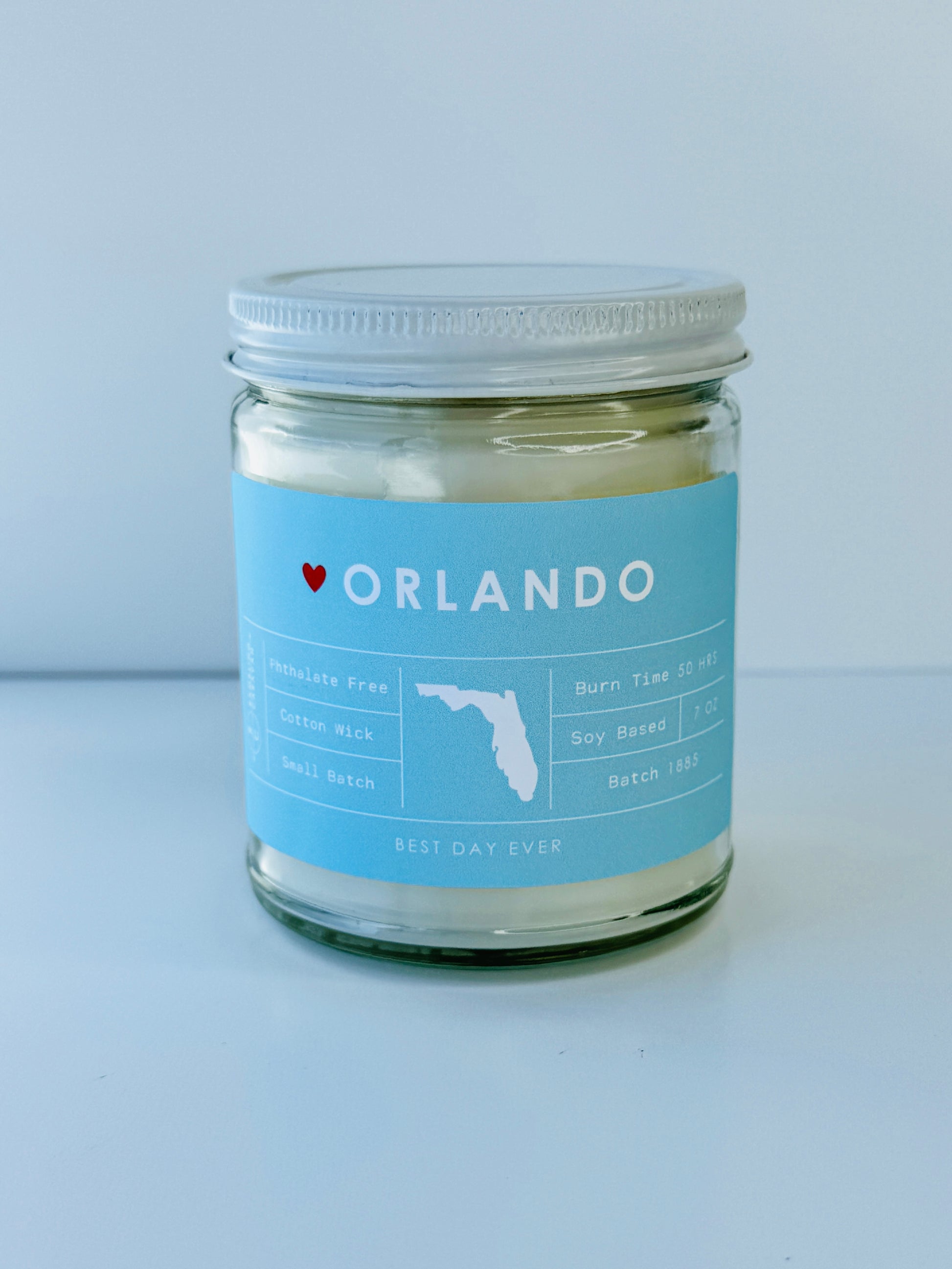 Orlando, Florida Candle - Rambling Caravan candles are inspired by home, travel and adventure. Made from a soy/coconut based wax blend, the candles are hand poured in Virginia Beach, Virginia. We use phthalate free fragrances and have an assortment of fragrances from which to choose. Many of our candles have different color labels to choose from as well. We use cotton wicks with no zinc or lead. We do not use additives, nor scent enhancers or UV blockers. The burn time is approximately 50 hours.