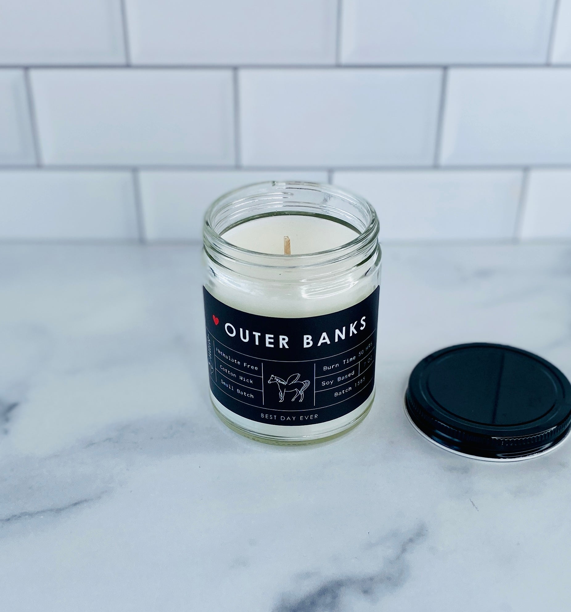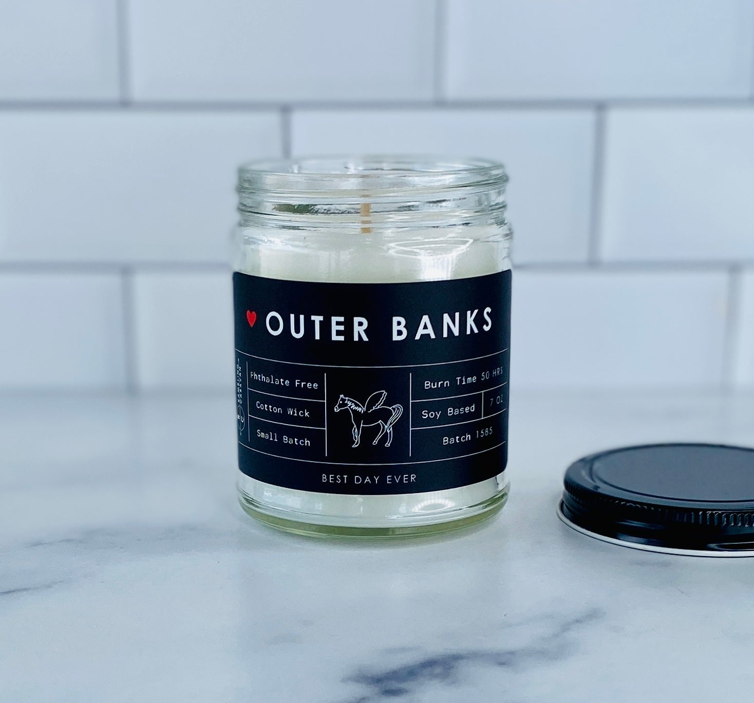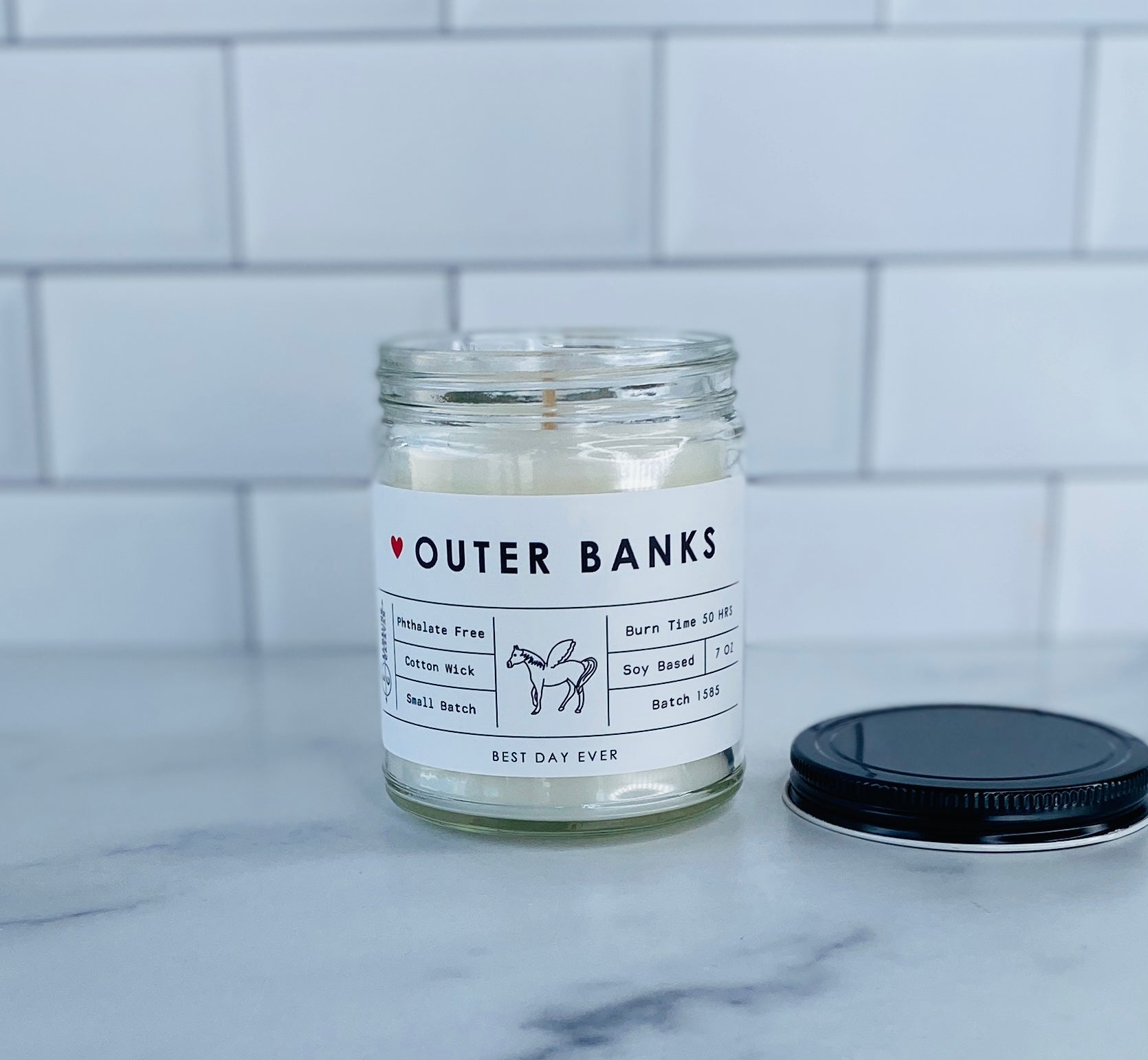 Outer Banks, North Carolina Candle - Rambling Caravan candles are inspired by home, travel and adventure. Made from a soy/coconut based wax blend, the candles are hand poured in Virginia Beach, Virginia. We use phthalate free fragrances and have an assortment of fragrances from which to choose. Many of our candles have different color labels to choose from as well. We use cotton wicks with no zinc or lead. We do not use additives, nor scent enhancers or UV blockers. The burn time is approximately 50 hours.