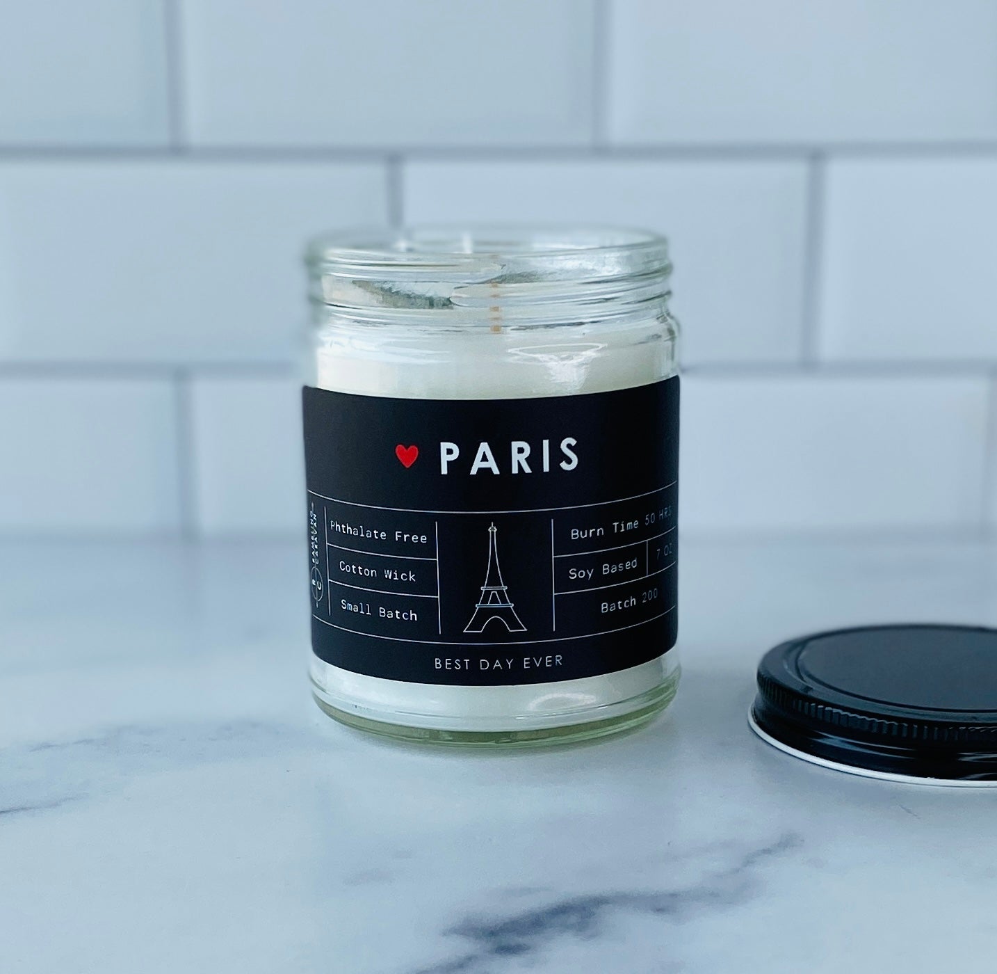 Paris, France Candle - Rambling Caravan candles are inspired by home, travel and adventure. Made from a soy/coconut based wax blend, the candles are hand poured in Virginia Beach, Virginia. We use phthalate free fragrances and have an assortment of fragrances from which to choose. Many of our candles have different color labels to choose from as well. We use cotton wicks with no zinc or lead. We do not use additives, nor scent enhancers or UV blockers. The burn time is approximately 50 hours.