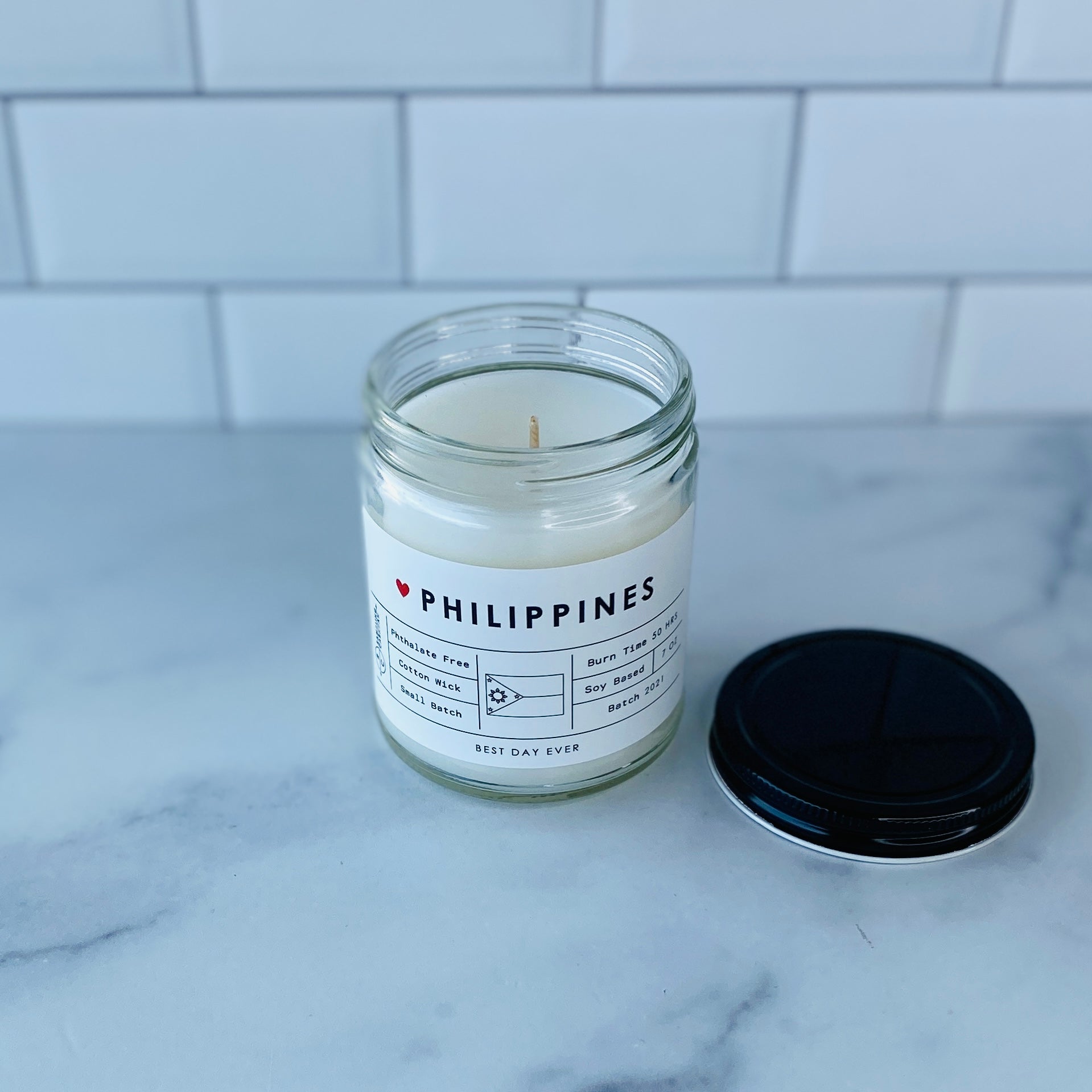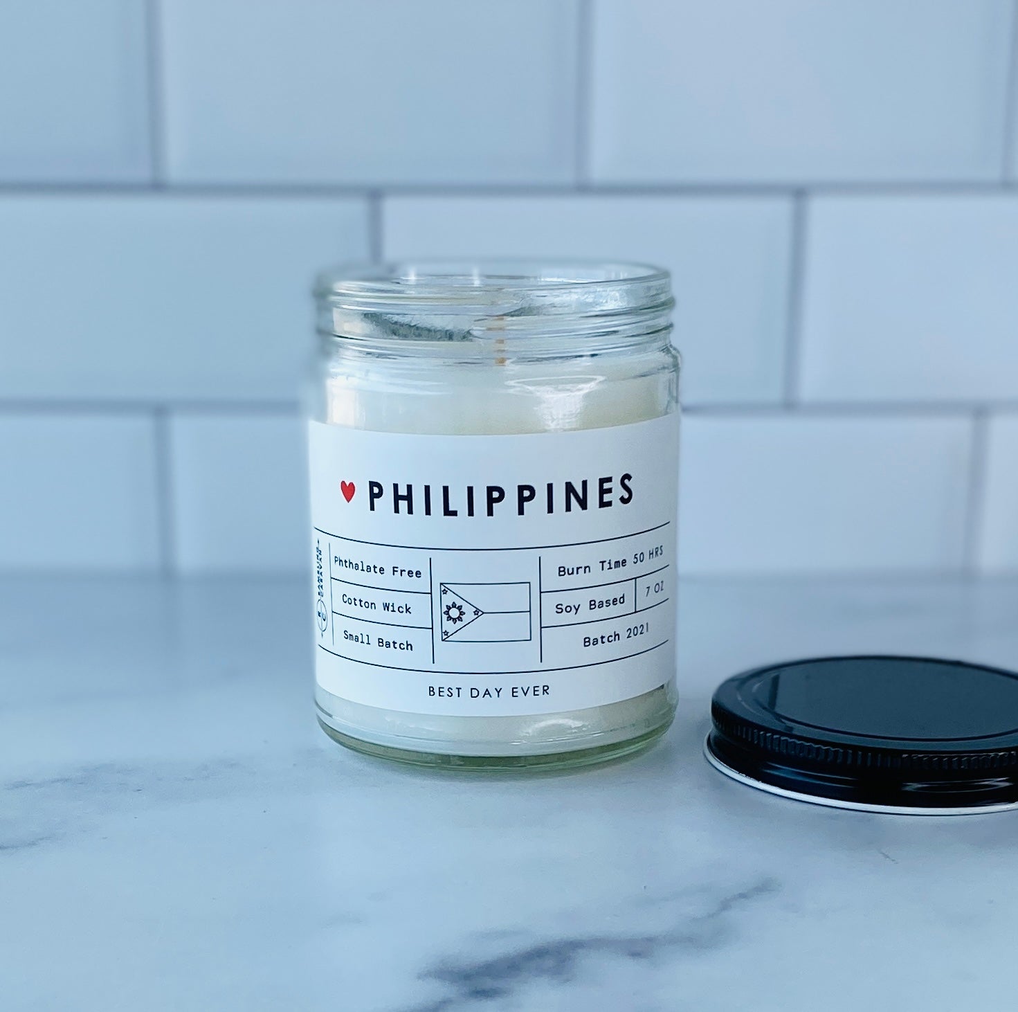 Philippines Candle - Rambling Caravan candles are inspired by home, travel and adventure. Made from a soy/coconut based wax blend, the candles are hand poured in Virginia Beach, Virginia. We use phthalate free fragrances and have an assortment of fragrances from which to choose. Many of our candles have different color labels to choose from as well. We use cotton wicks with no zinc or lead. We do not use additives, nor scent enhancers or UV blockers. The burn time is approximately 50 hours.